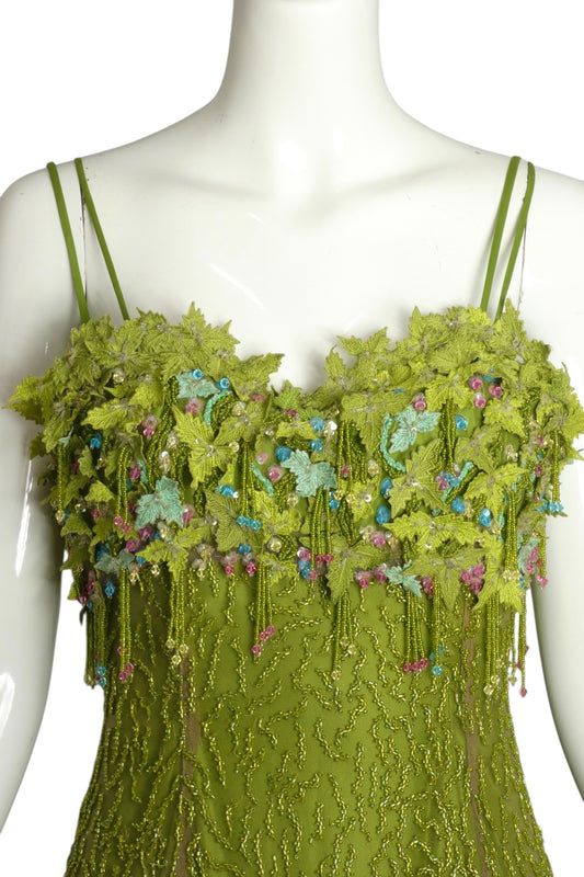 1990s Green Beaded Fringe Appliqué Evening Gown, Size 2 Petite