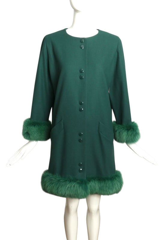 PIERRE CARDIN (HAUTE COUTURE) - 1990 Green Worsted Wool Fur Trimmed Coat, Size 12