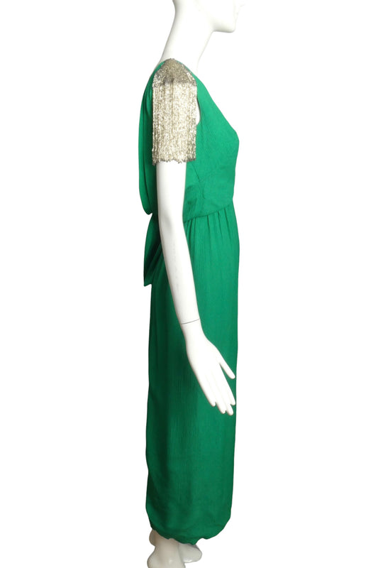 1960s Green Crinkle Crepe & Bead Evening Gown, Size 2