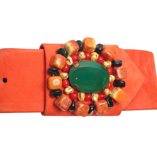 YVES SAINT LAURENT- 1990s Orange Suede & Jeweled Buckle Belt, Waist-32"