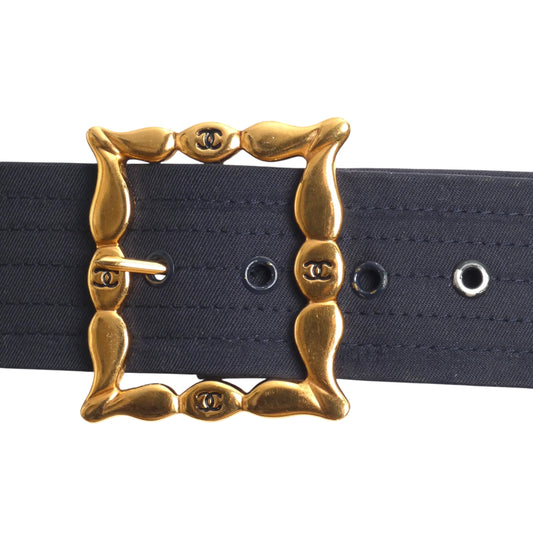 CHANEL- 1980s Navy & Gold Monogram Buckle Belt, Waist 29"