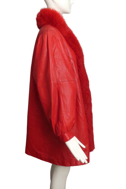 1980s Red Leather & Fox Fur Coat, Size Medium