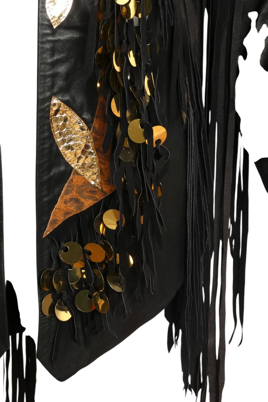 1980s Black Leather Fringe & Appliqué Coat, Size 10