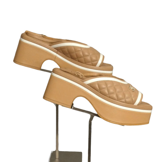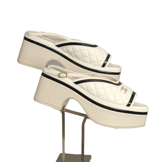 CHANEL- Beige & White Quilted Platform Sandals, Size 38.5