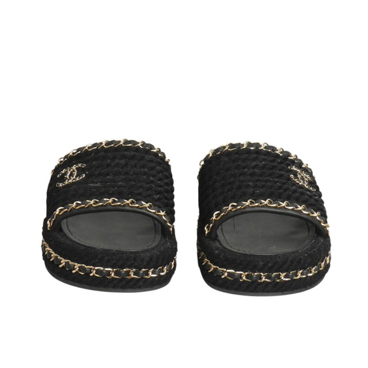 CHANEL- Black Rope & Chain "CC" Slides, Size 36