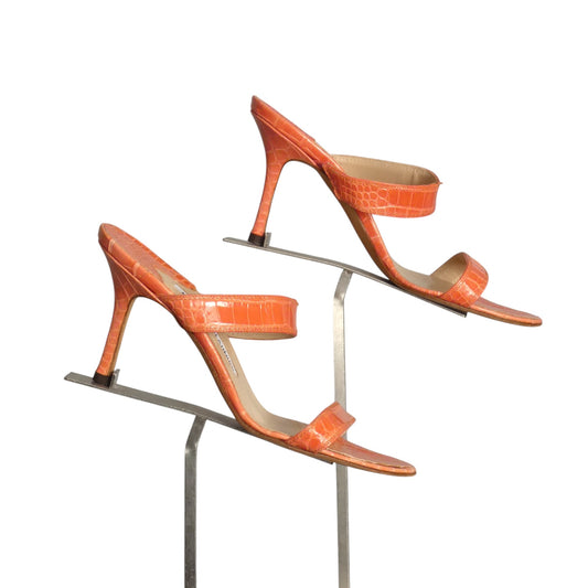 MANOLO BLAHNIK- Coral Alligator Sandals, Size 36