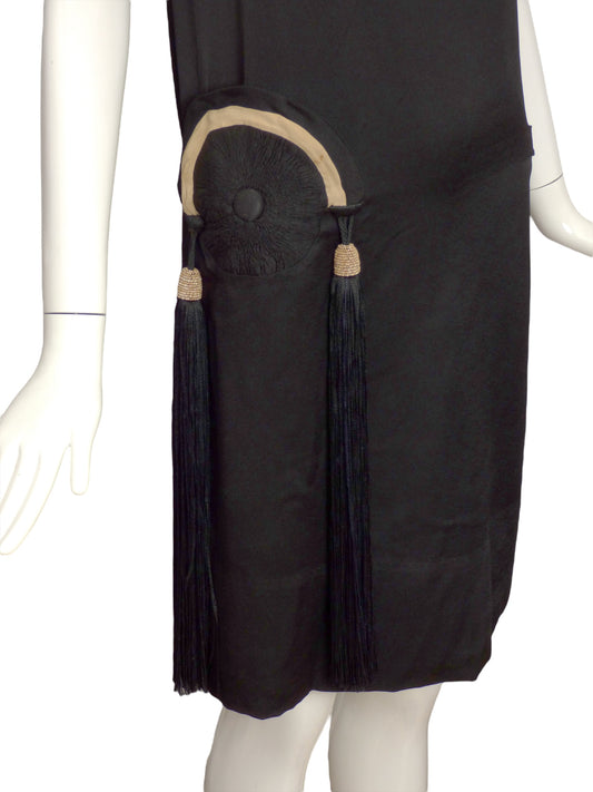 BLANCHE LEBOUVIER- 1920s Black Silk Tassel Dress, Size 2