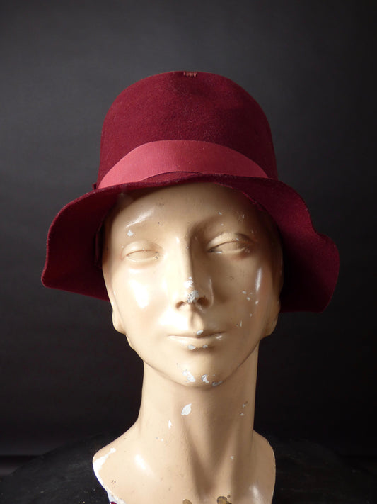 1920s Burgundy Wool Felt Sculpted Soft Cloche