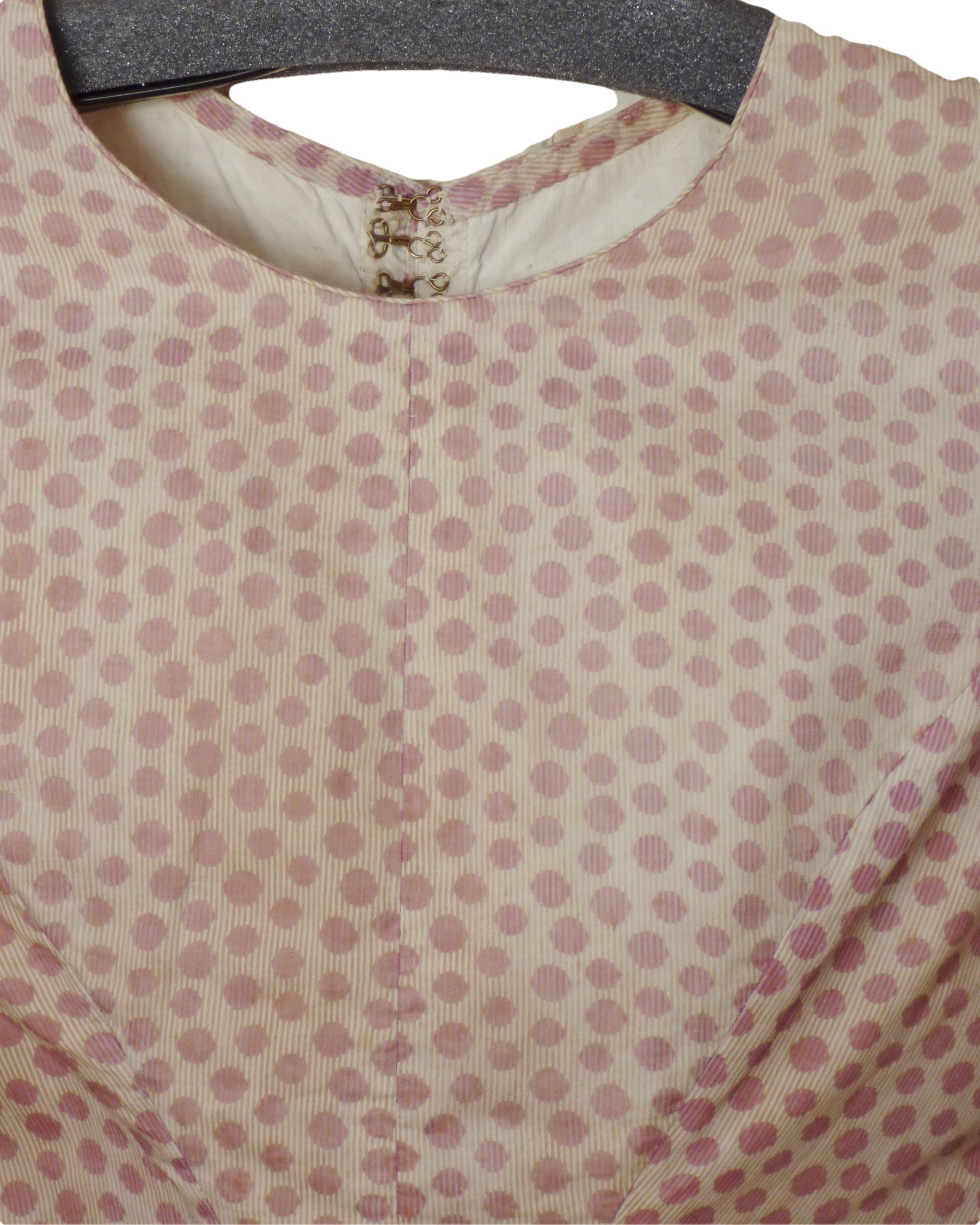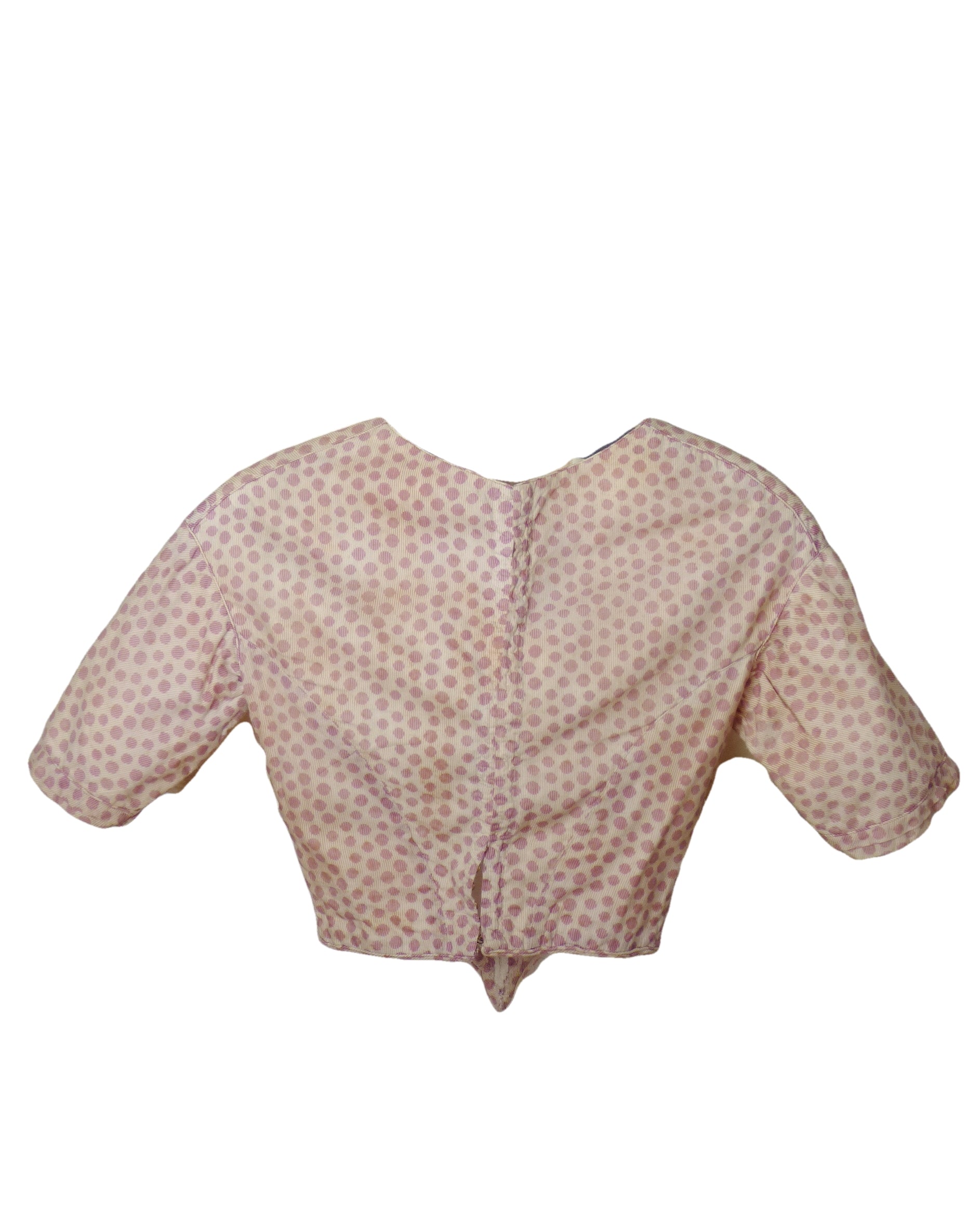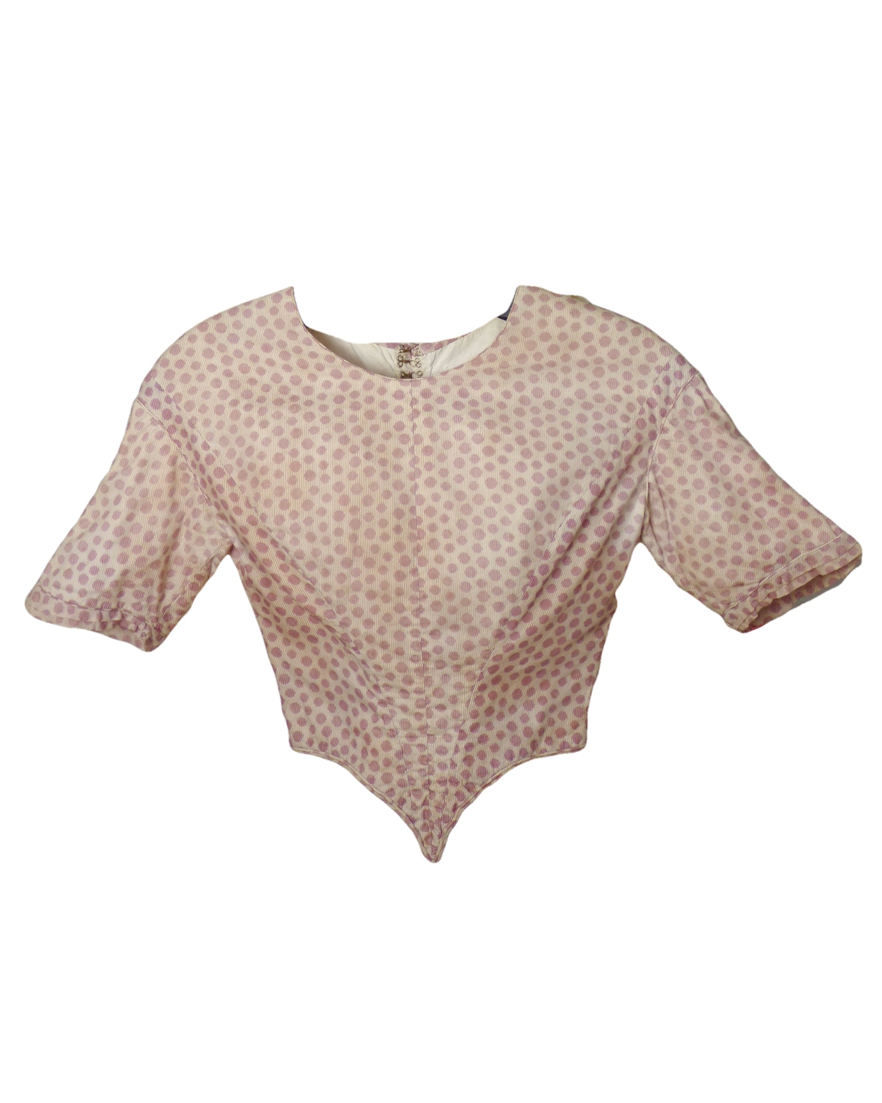 Special Features: Daytime bodice purchased in Paris on our last trip. The bodice has a scoop neckline and is dart fitted from the armscyes to the center front point. Short sleeves with tucks and piping at the ends. Hook and eye closures down the back.