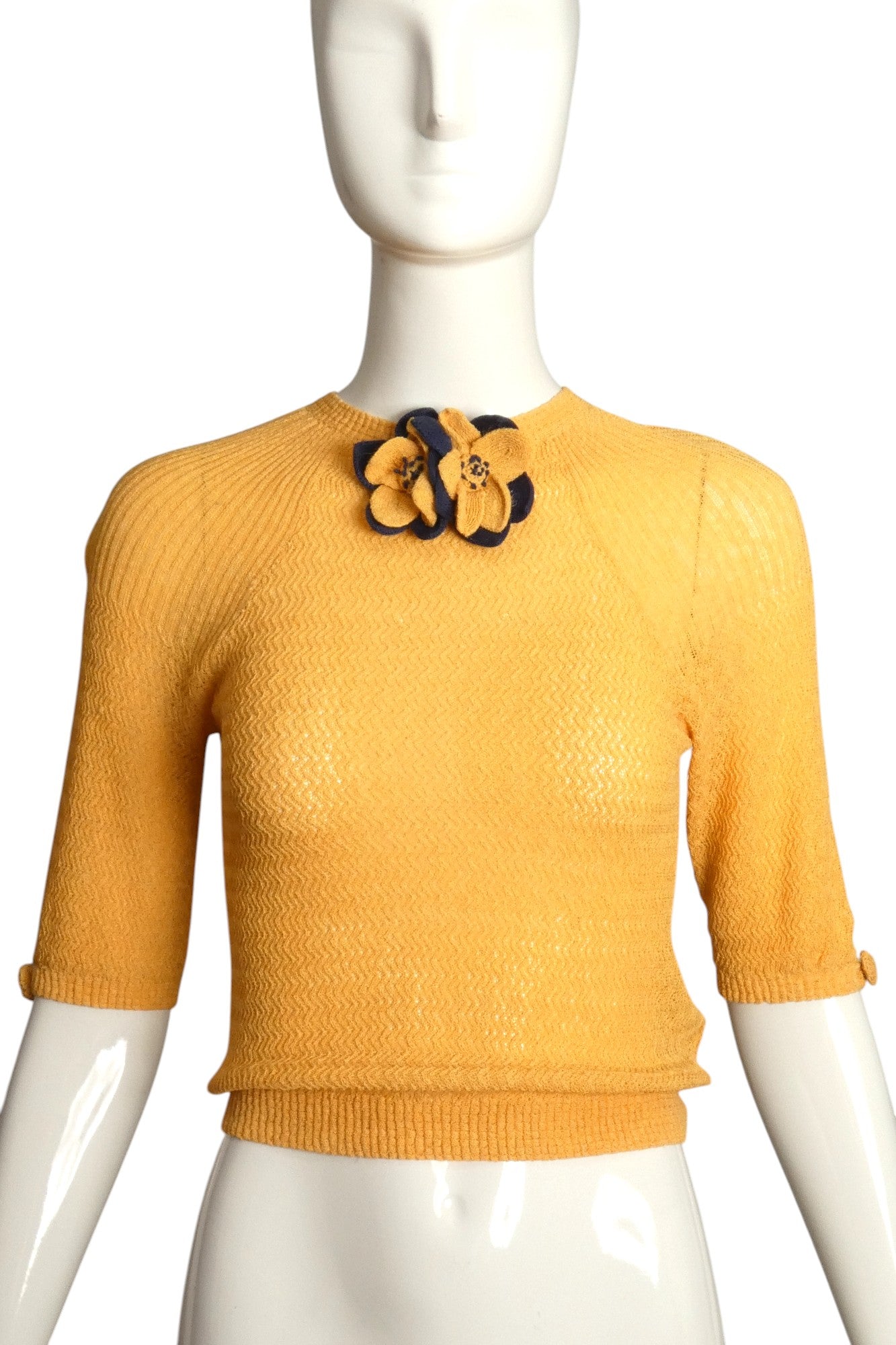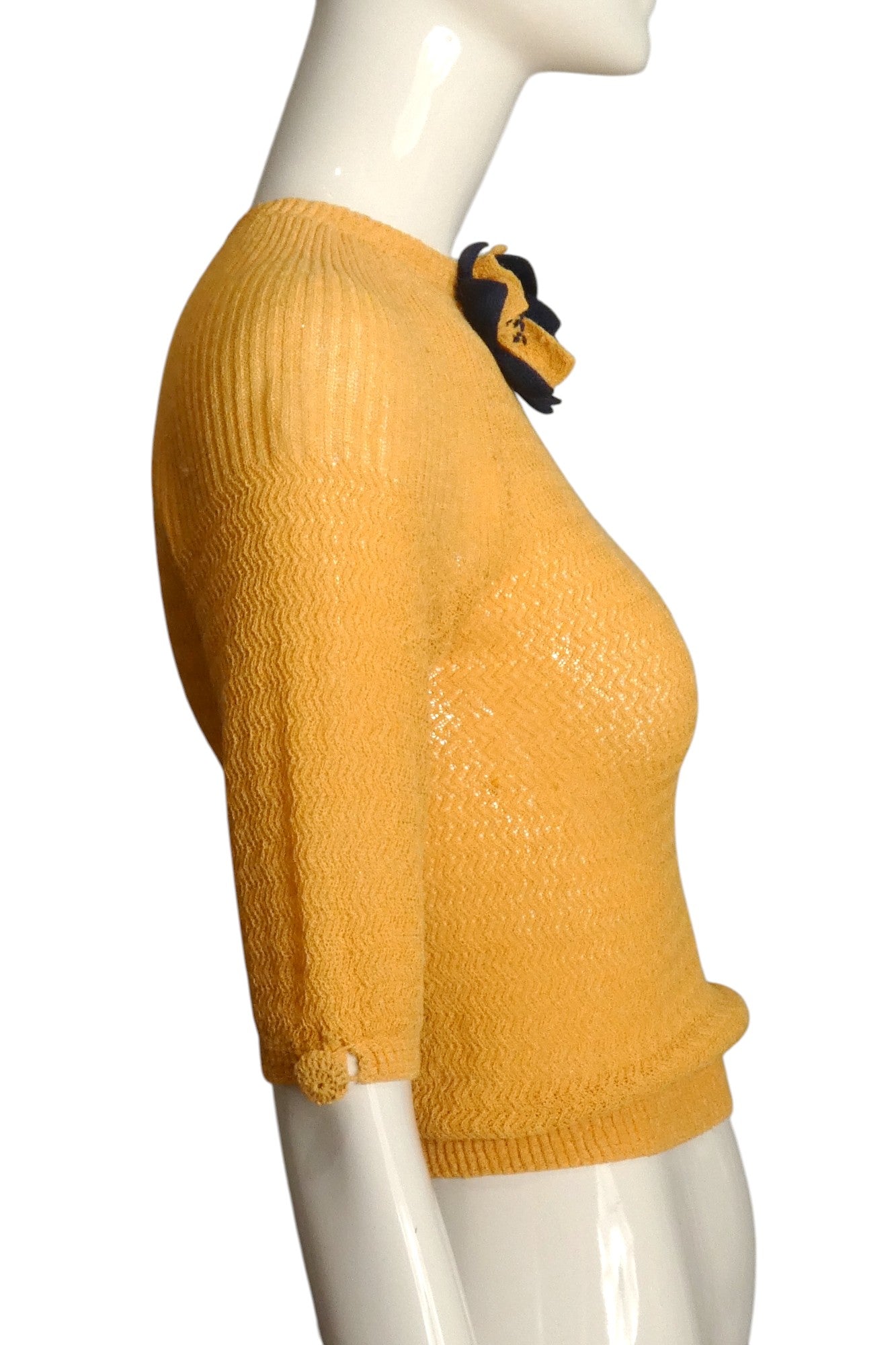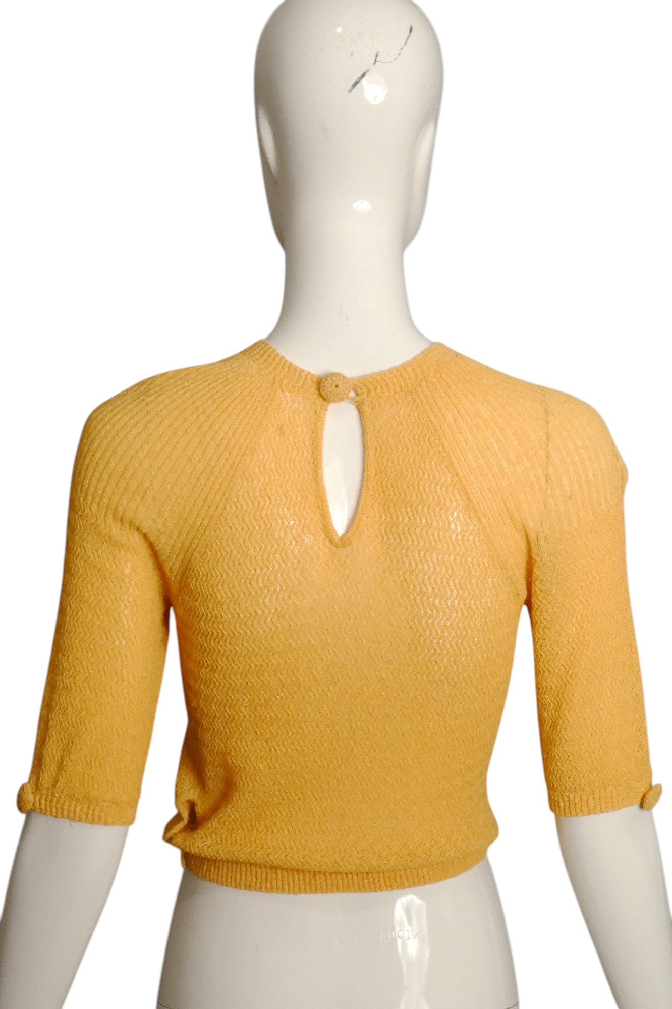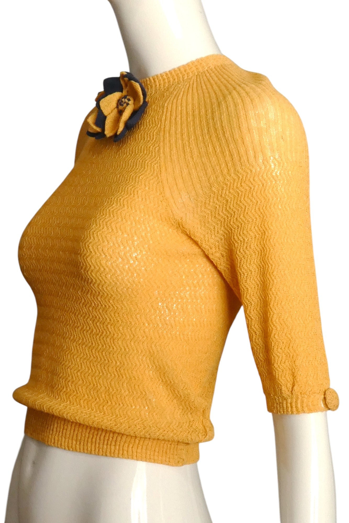 Description: Irresistible 1930s butter-yellow knit sweater, perfectly petite at size 4. Features sophisticated contrasting knit patterns and charming floral detailing at the neckline. The practical back slit with elegant button closure combines vintage appeal with easy wearability. A rare depression-era treasure that adds distinctive character to any collection.