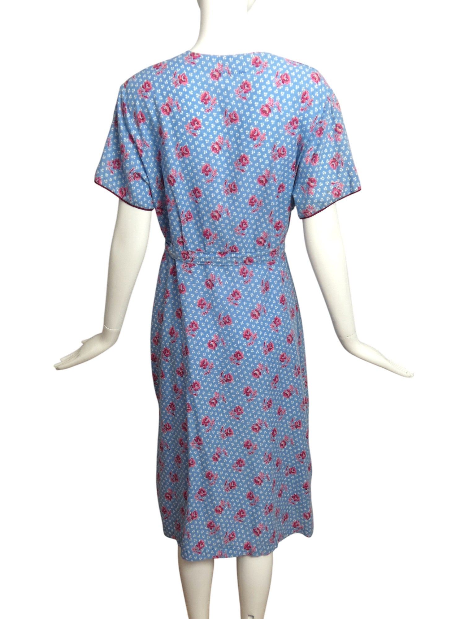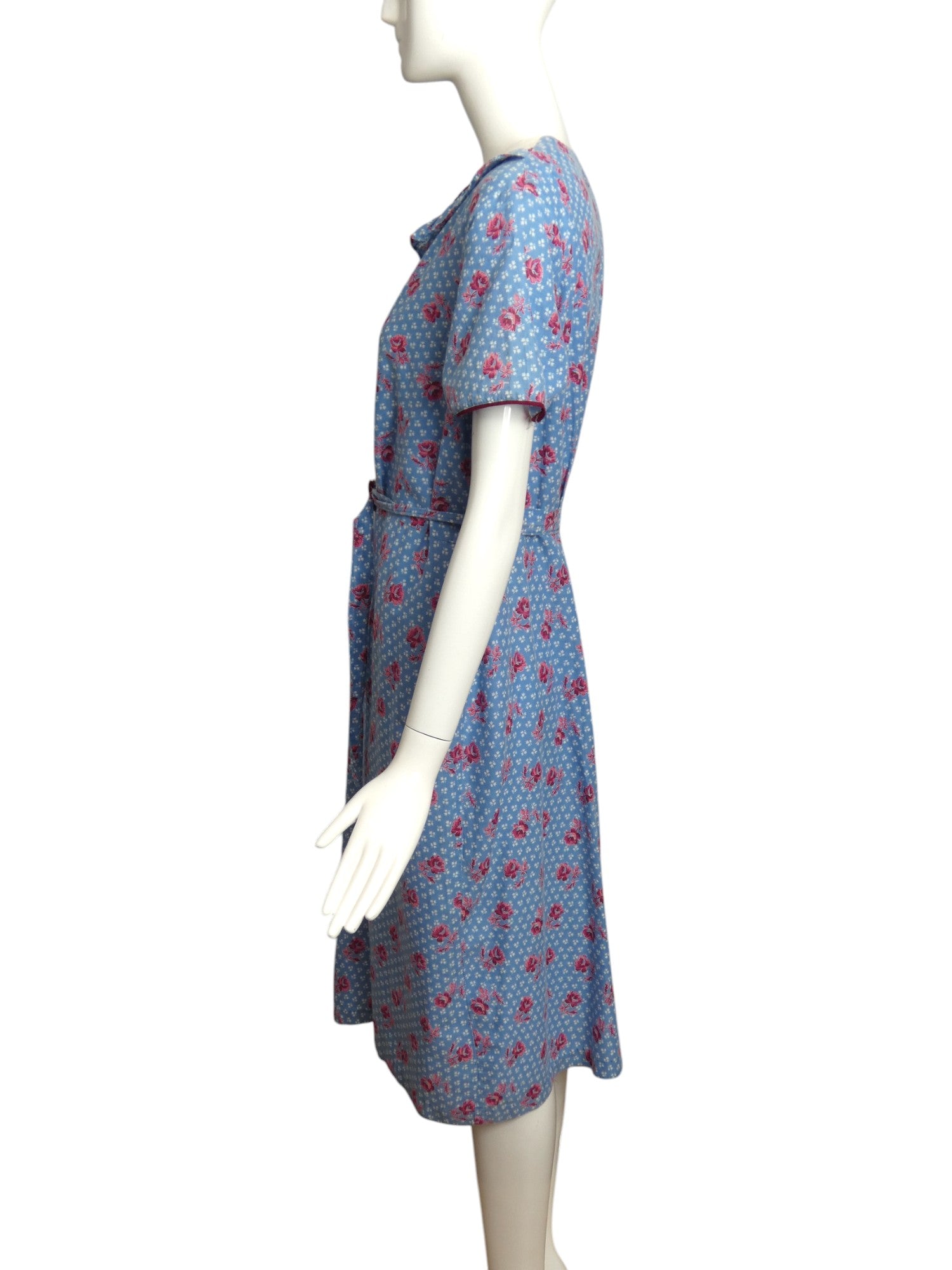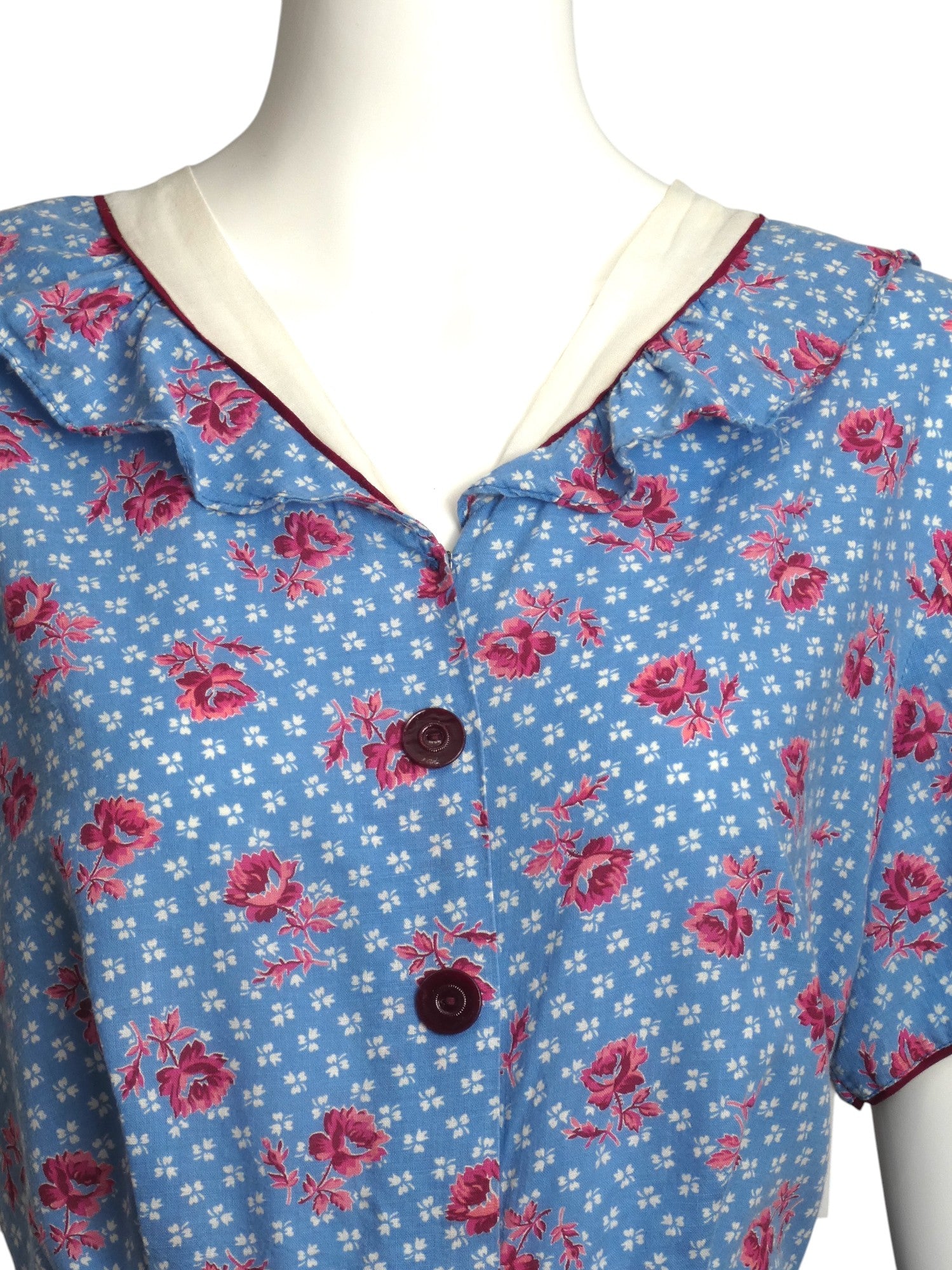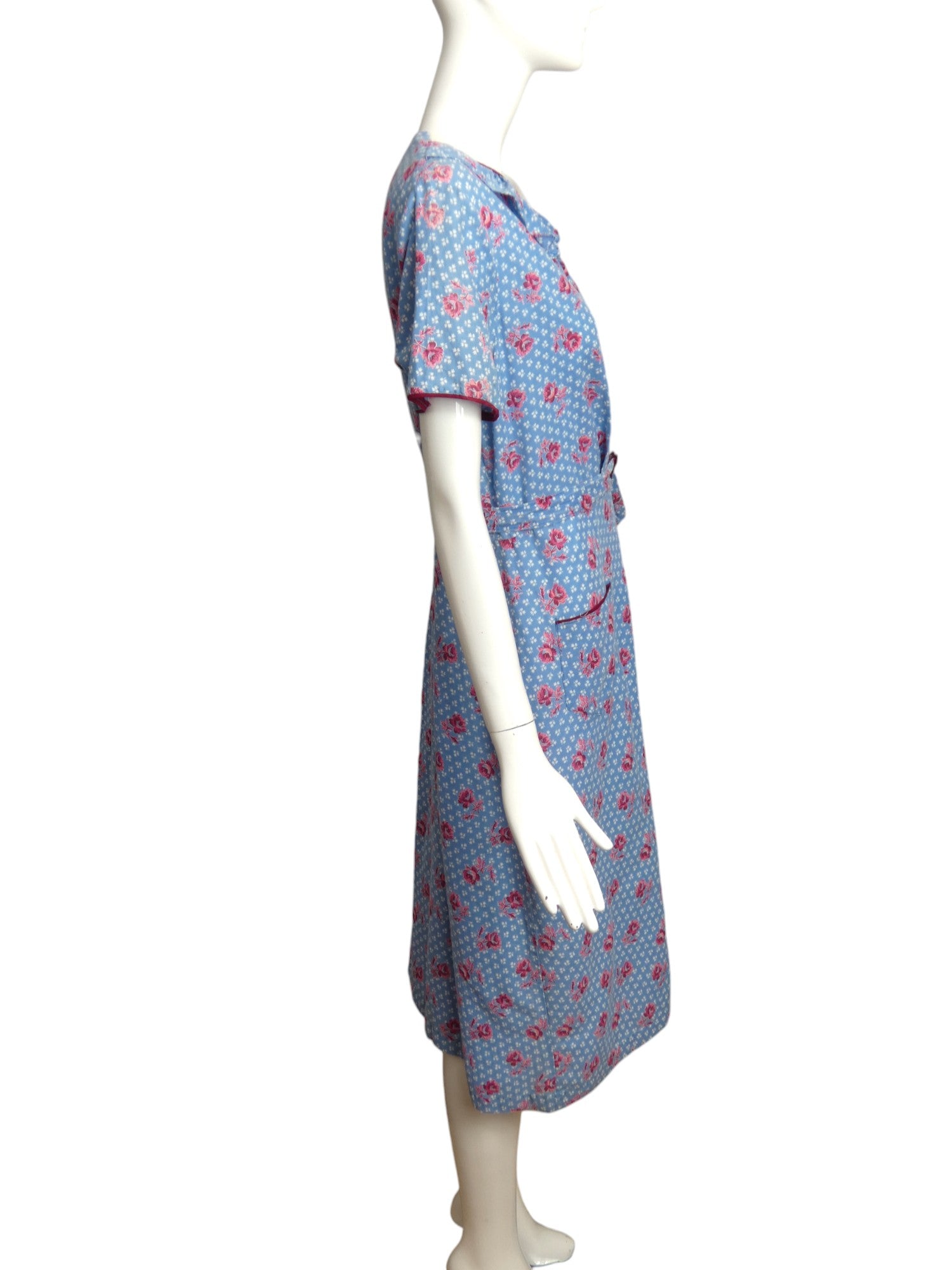 Description: This 1940s cotton housedress features a white and pink floral pattern on a blue background. The dress is designed with a white cotton neckband and a floral ruffle underneath. It includes decorative buttons down the front and a matching slide buckle on the waist sash. Additionally, there is a large patch pocket located on the right hip.