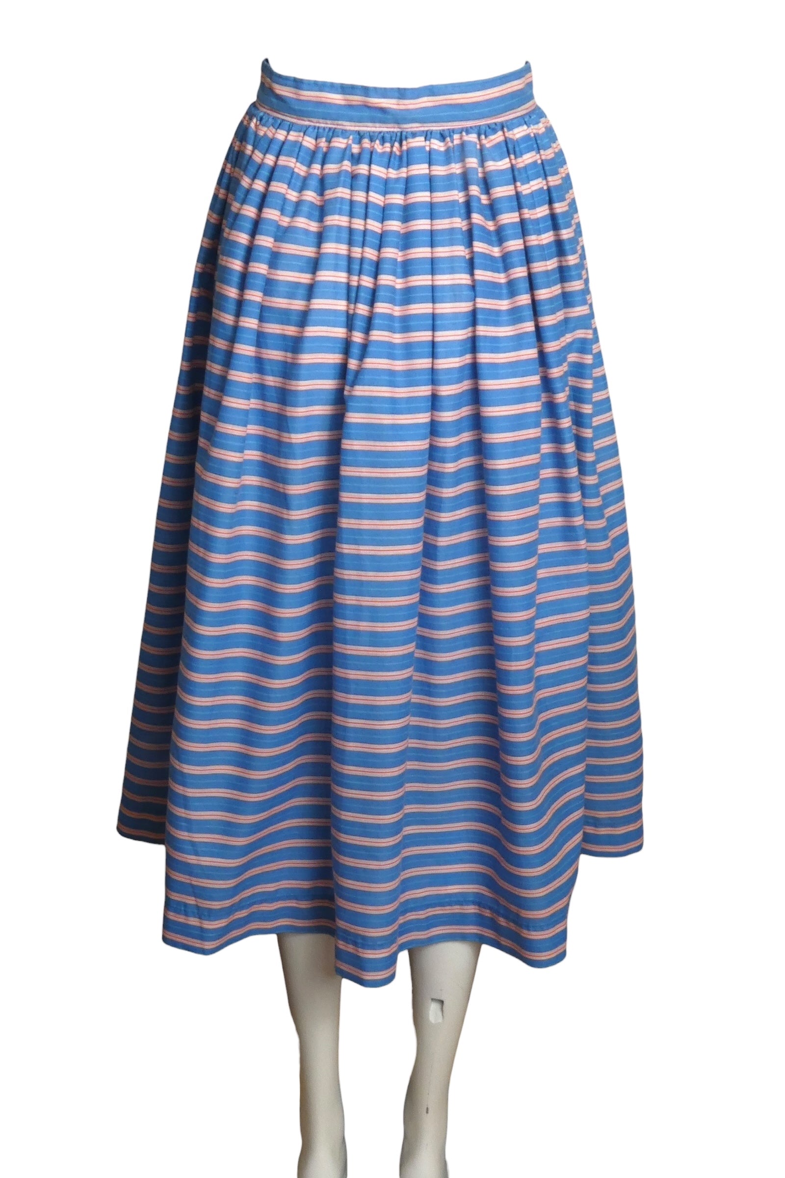 Description: A charming 1940s skirt in cheerful blue and red cotton stripe that captures the era's playful spirit and practical design sensibility. The skirt features generous gathered fullness that cascades from a substantial waistband, creating flattering volume and ease of movement. Front button closures add vintage authenticity and functional appeal. Originally conceived as part of a coordinated playsuit, this separable skirt demonstrates the resourceful approach to wardrobe building that defined the decade. A delightful standalone piece that pairs effortlessly with contemporary basics or vintage coordinates for authentic 1940s styling.
