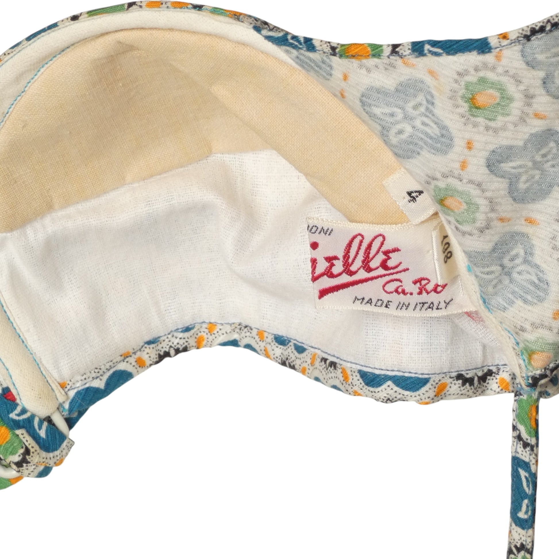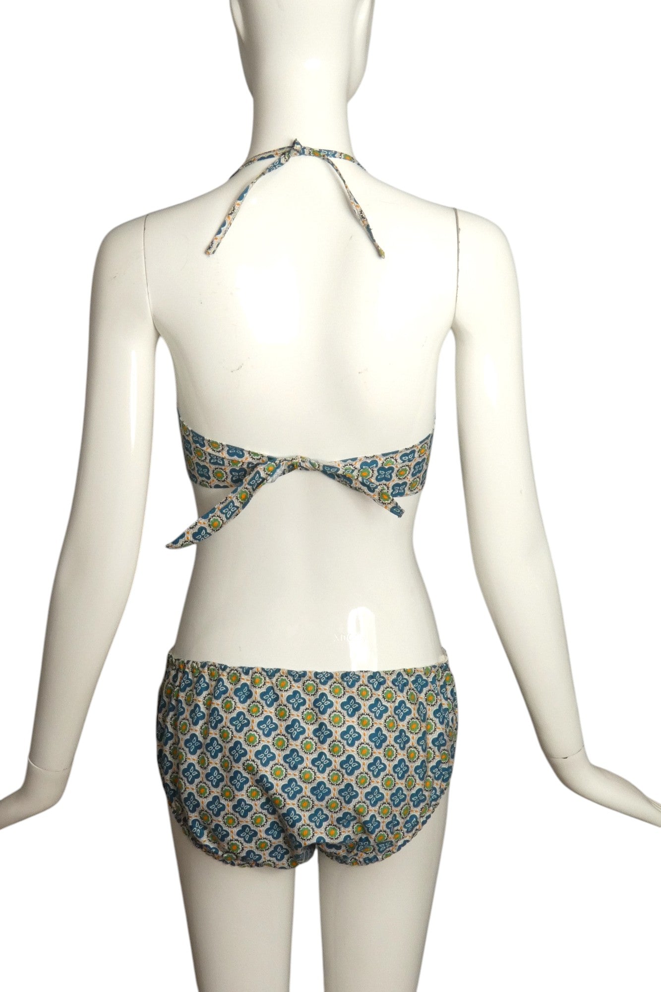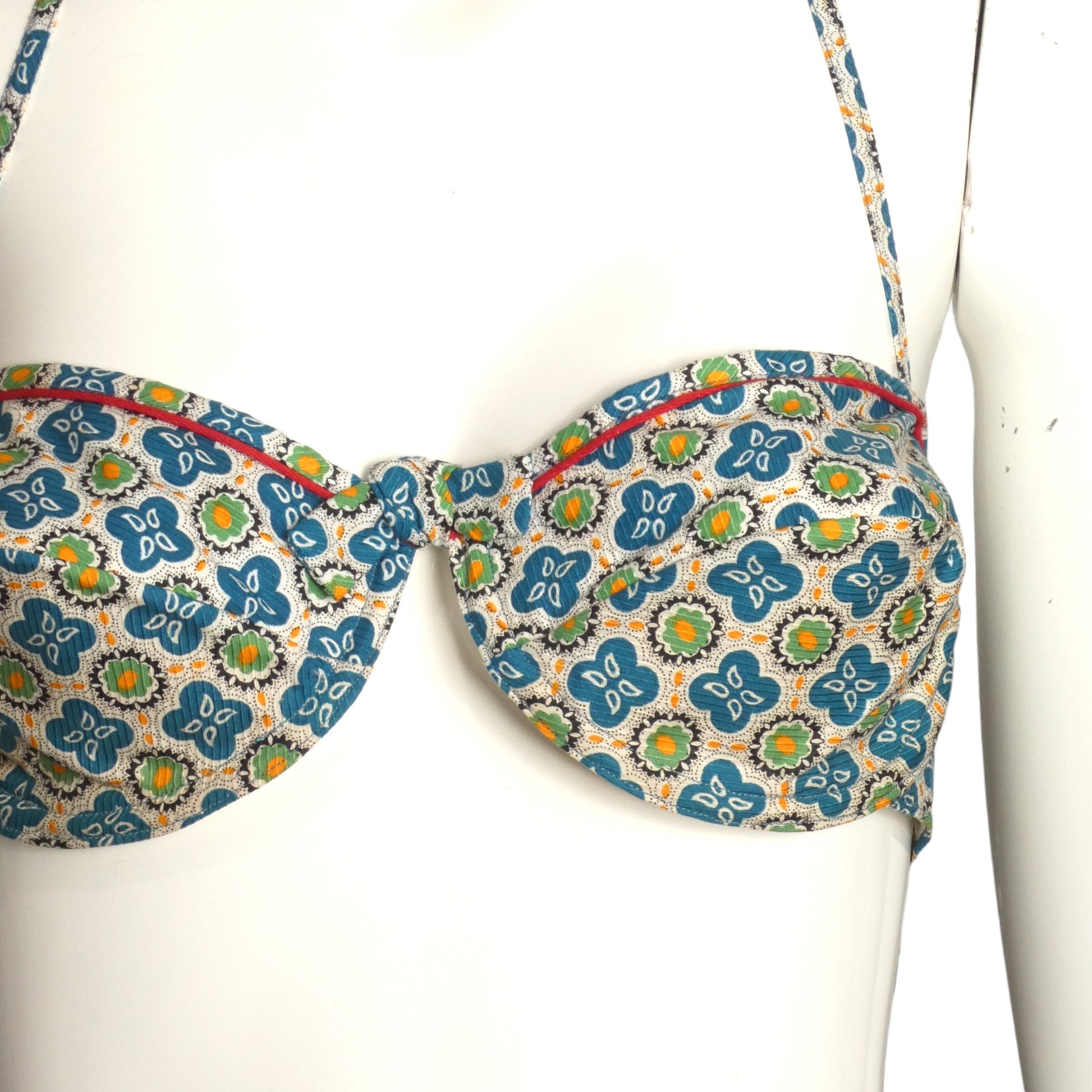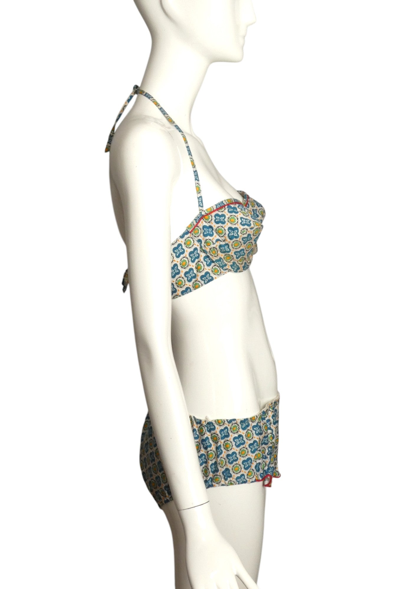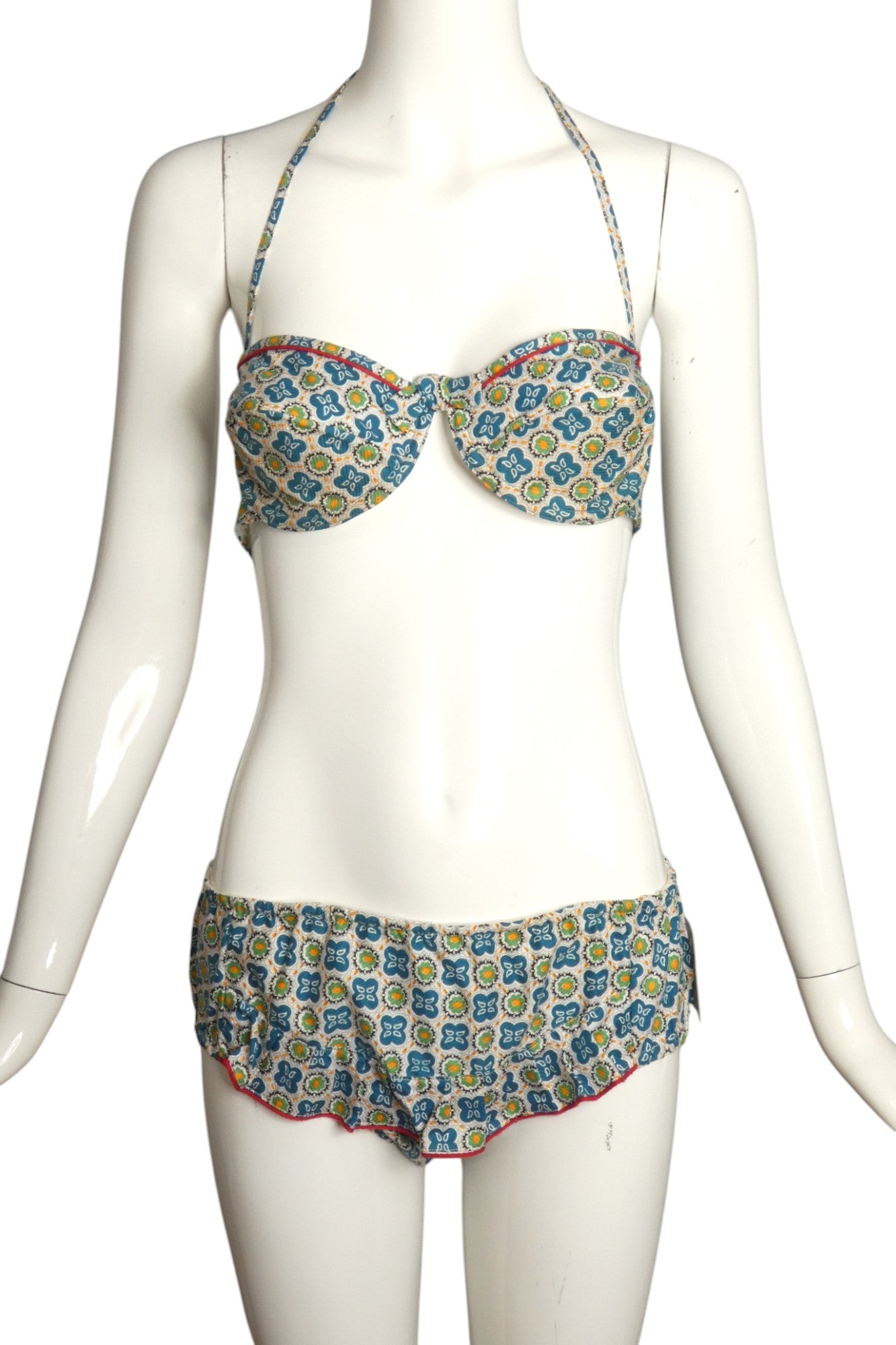 Description: Wonderful little bathing suit from the 1950s in a printed cotton. The bra top has an underwire and a small bow at the center. Red piping across the top and is to be tied around the neck and the back. The matching trunks has a ruffle across the front also trimmed in red. Elastic around the waist and legs.