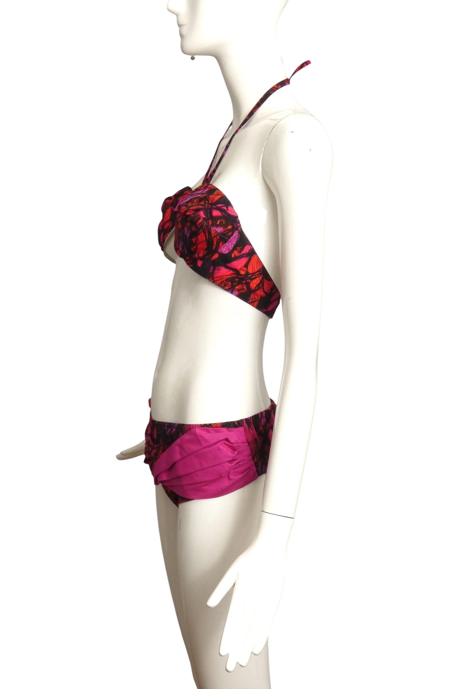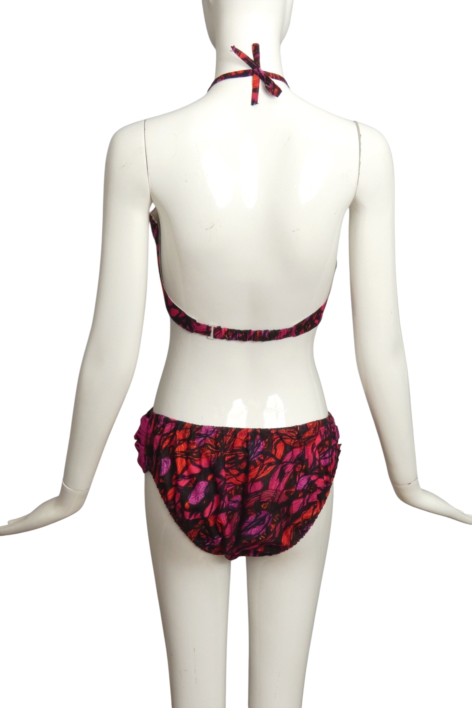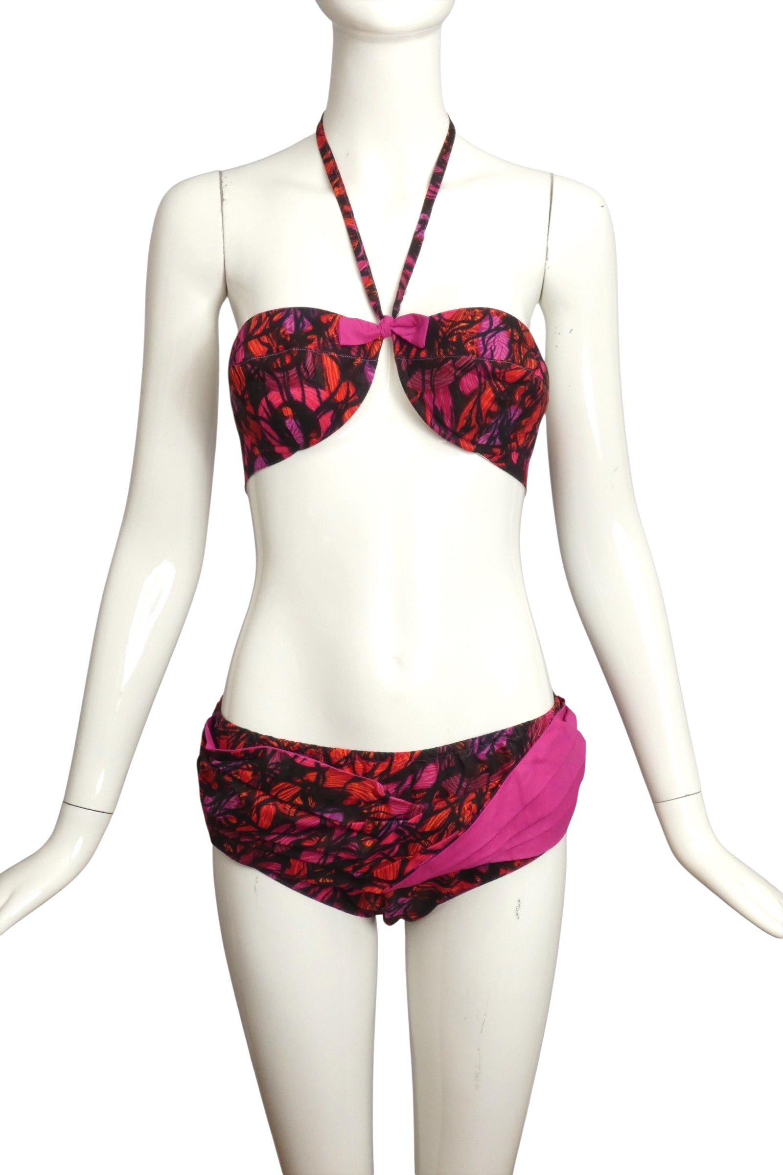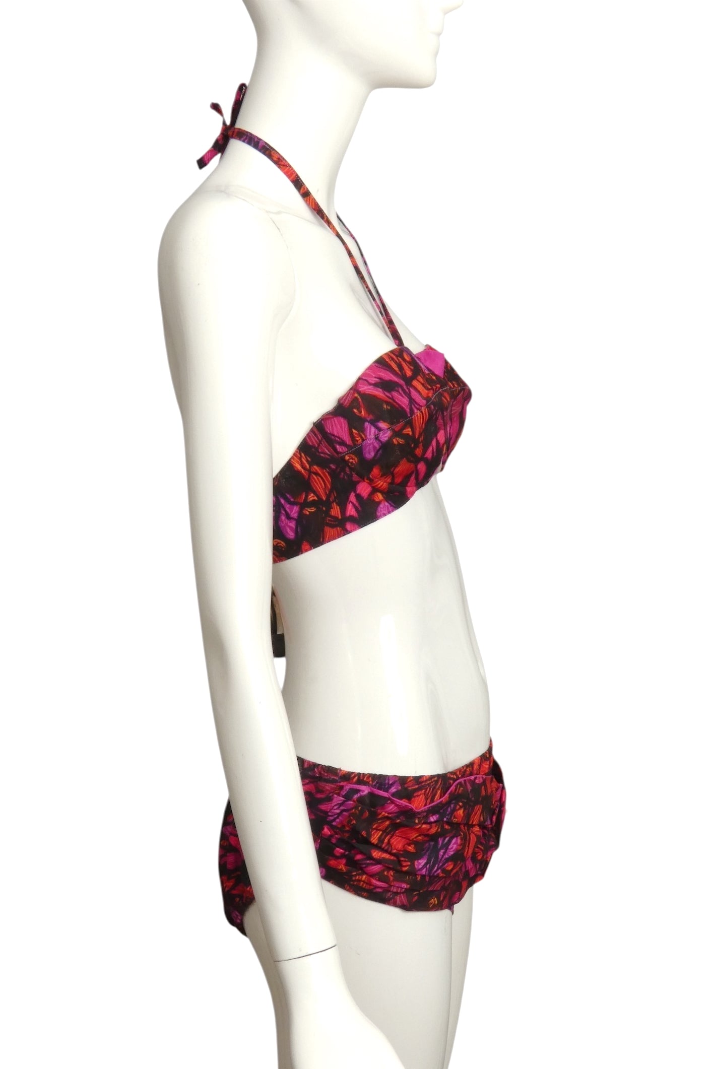 Description: Travel back to the early 1960s with this charming two-piece swimsuit in a lively pink, red, and black cotton print. Wear the top with a halter strap for a timeless vibe or go strapless to soak up the sun, while the cute pink bow adds a fun, flirty detail. The underwire offers great support and shape, making you feel fabulous. The matching bottoms feature contrasting pleated panels and an elastic waistband for comfort. Dive into vintage fun and turn heads all summer long!