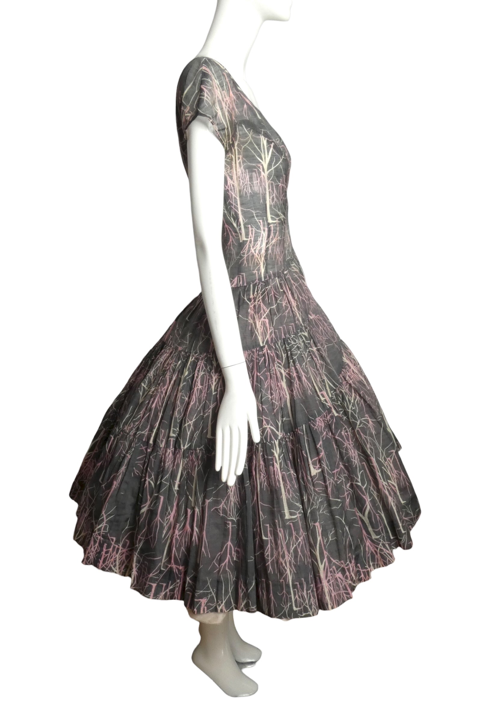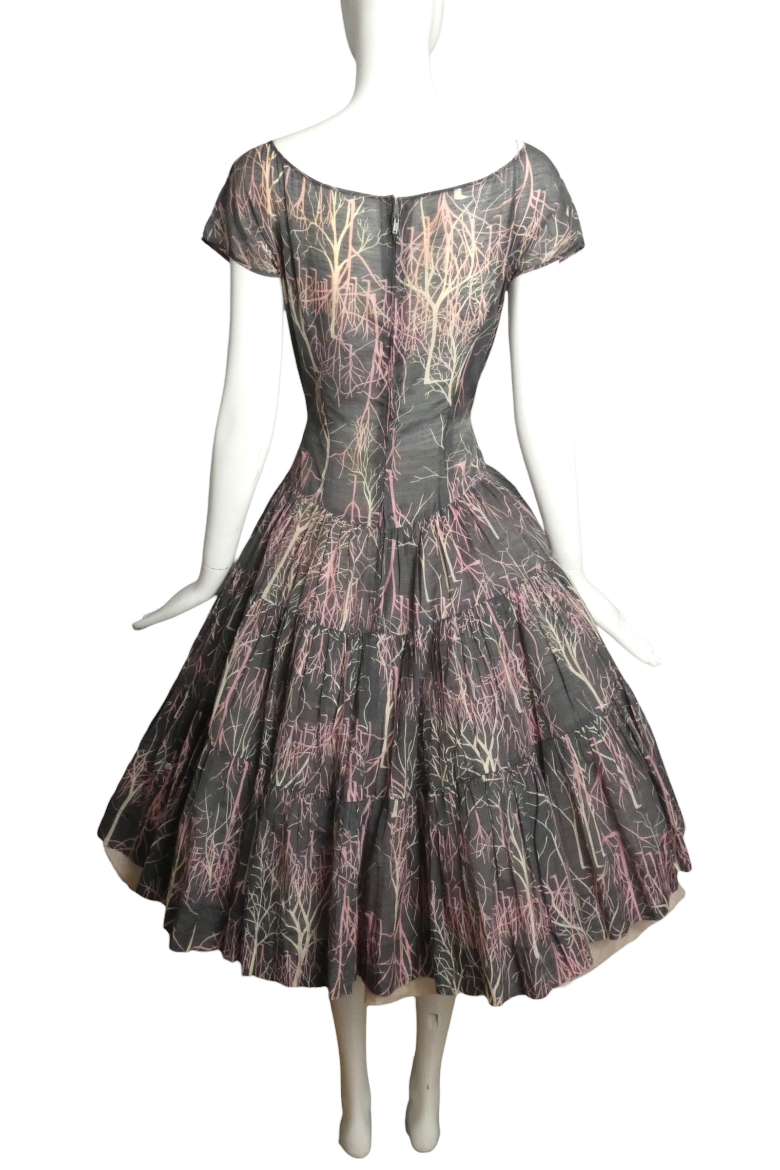Description: This charming 1950s day dress captures the essence of springtime elegance in soft grey batiste adorned with a delicate pink and ivory tree motif. The precisely dart-fitted bodice provides flattering structure, complemented by a modest scoop neckline and short sleeves ideal for warm-weather wear. The full gored skirt gathers gracefully from the side and back waist seams, creating gentle movement and volume characteristic of the era's refined silhouettes. A quintessential vintage find for those seeking authentic 1950s everyday sophistication.