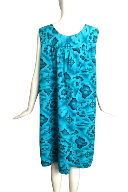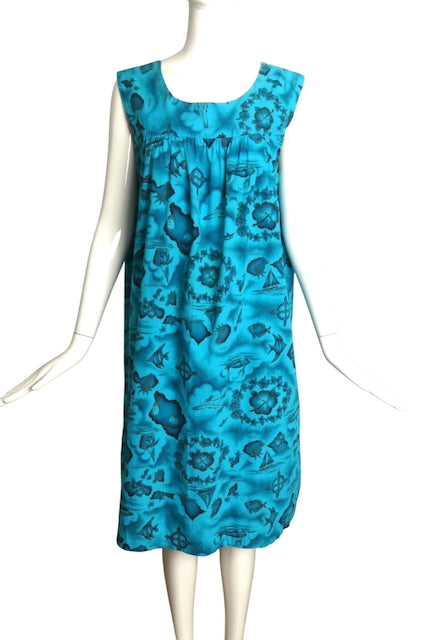 Description: This playful 1960s turquoise muumuu features a charming Hawaiian island print that invites tropical daydreams. Crafted from soft cotton, it has a chest yoke with gentle gathers flowing down for an easy, breezy fit. Perfect for your next beach getaway, this size 8 dress blends vintage style with vacation-ready comfort.