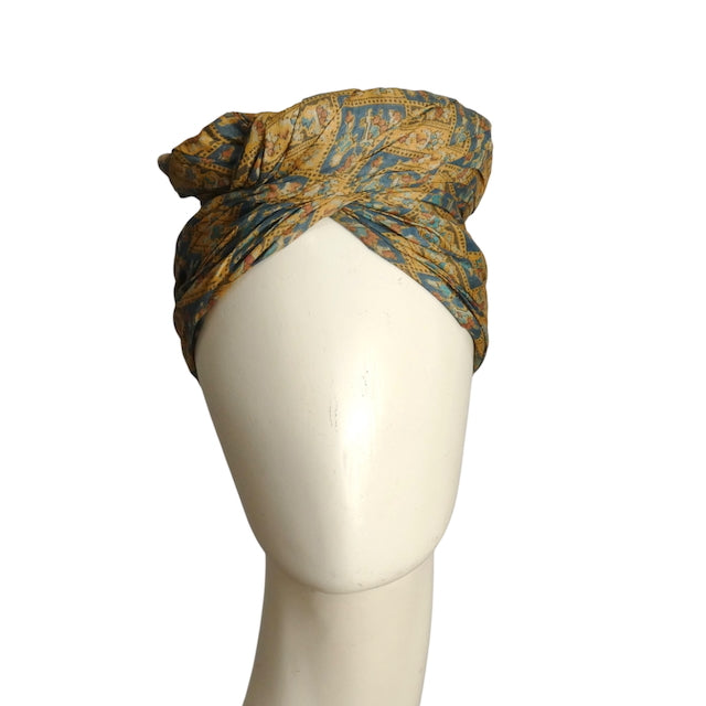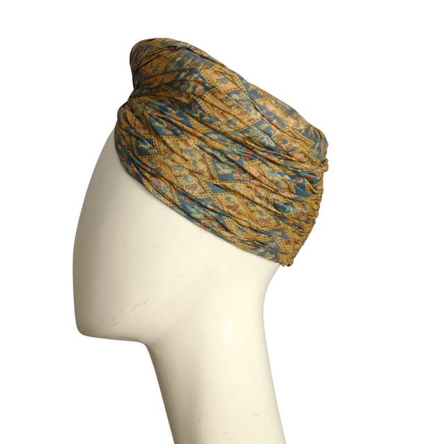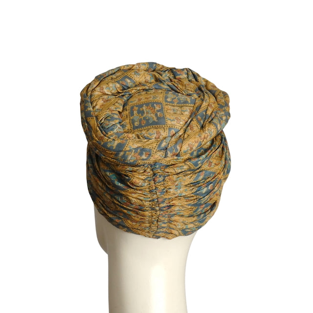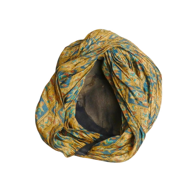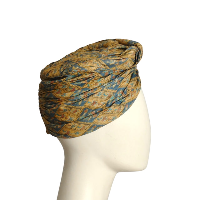 Description: Step back into the glamour of the 1940s with this chic turban crafted in printed silk. It flaunts a stylish coil with a shirred detail at the back for an effortlessly dramatic look. Perfect for adding a touch of vintage elegance to any outfit. Feel fabulous and timeless!