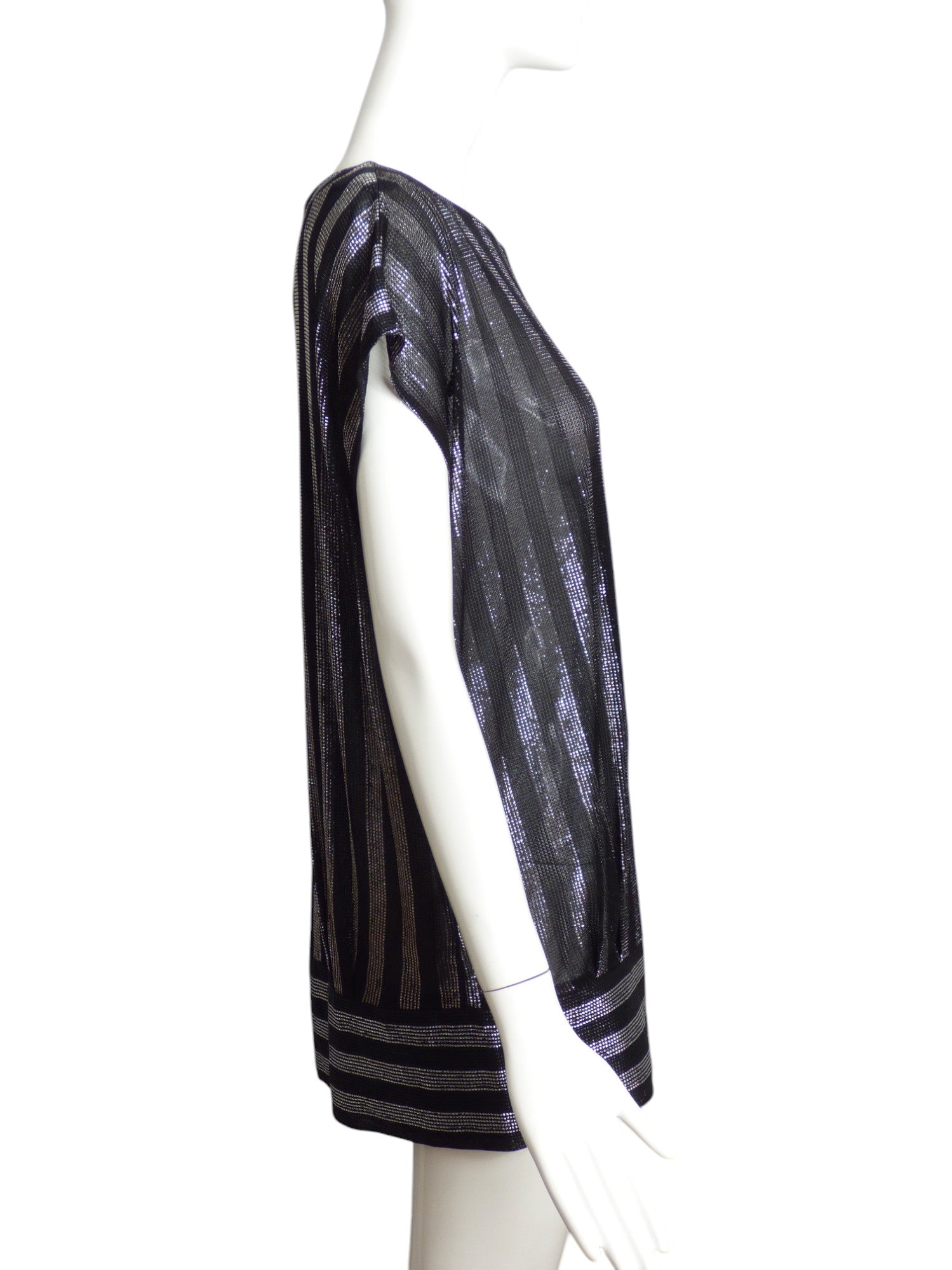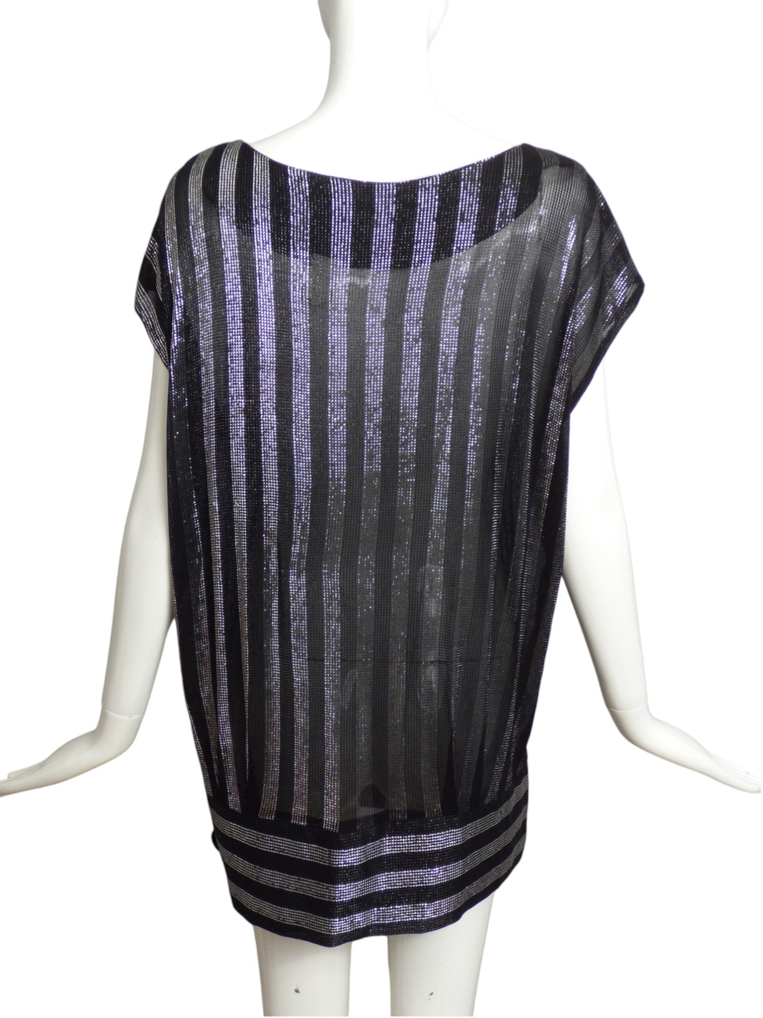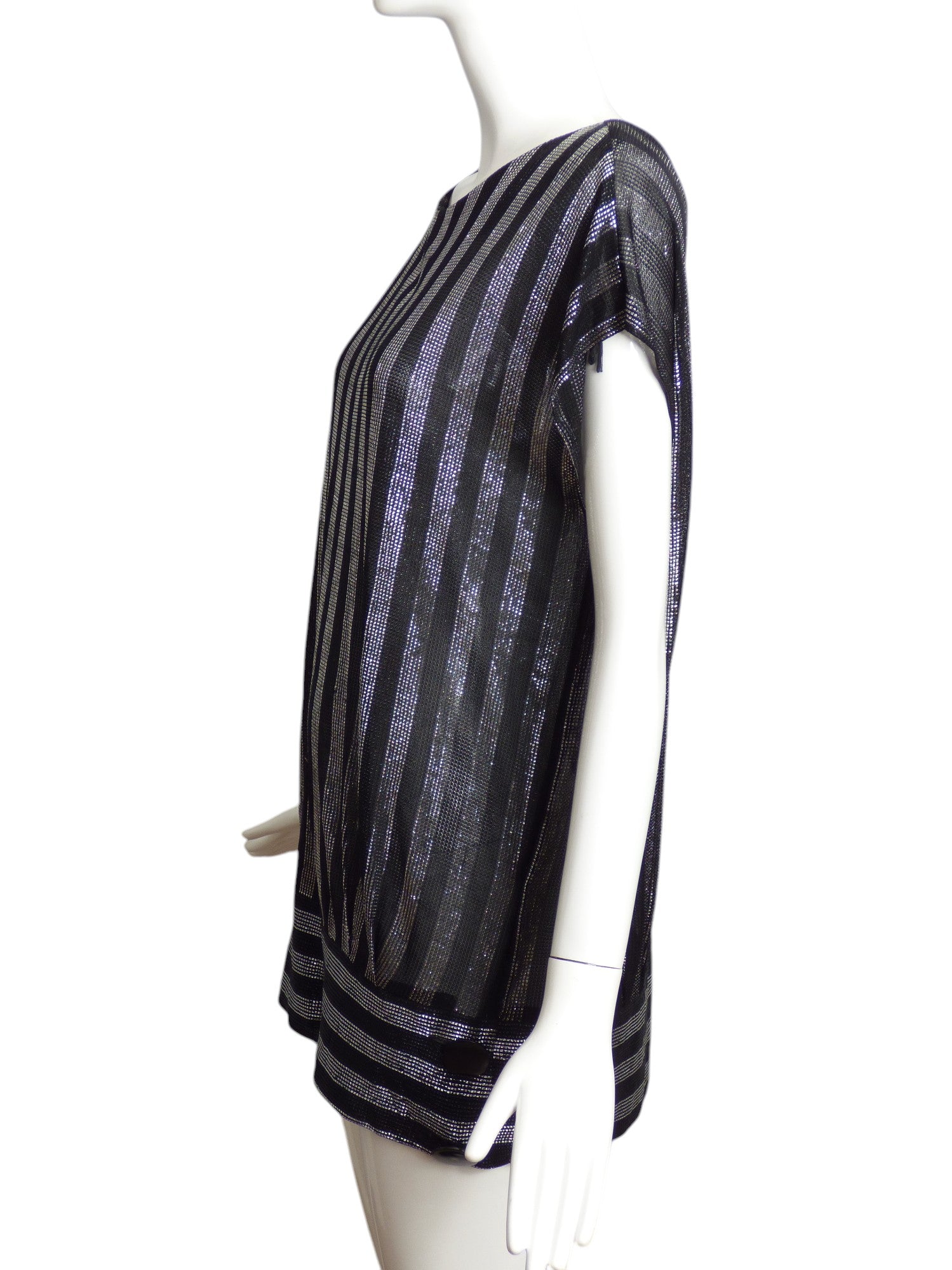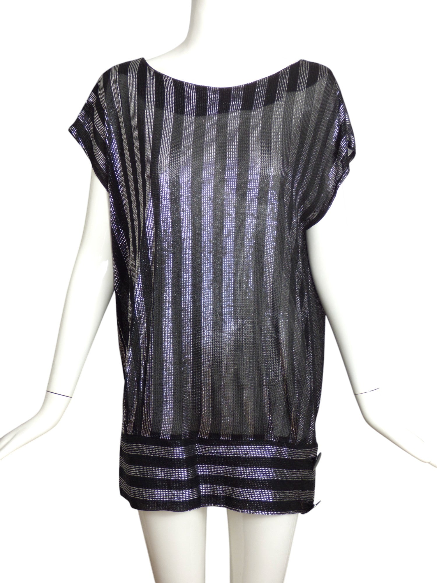 Description: Embody your inner glamorous disco diva with this 1980s blouse crafted from luxurious black nylon and adorned with a shimmering silver stripe. The top features a graceful scoop neckline and a wide fitted band at the hips, accented by a button detail on the left side.