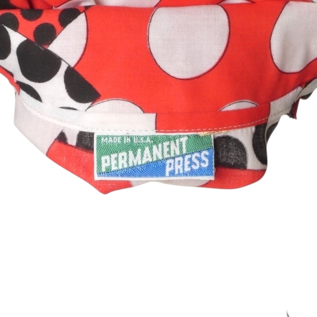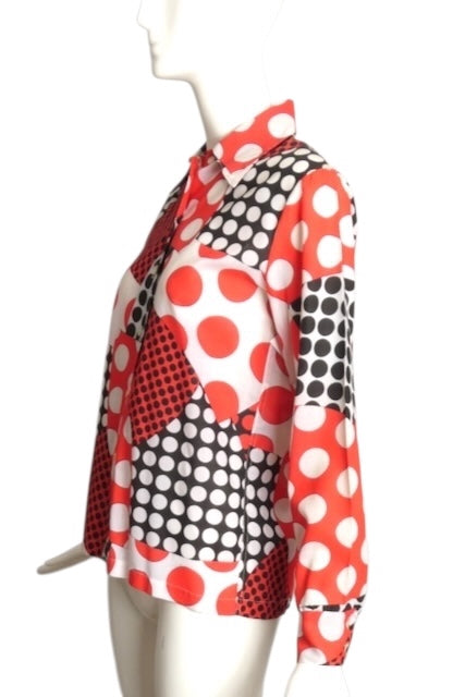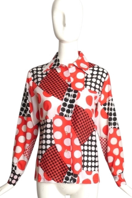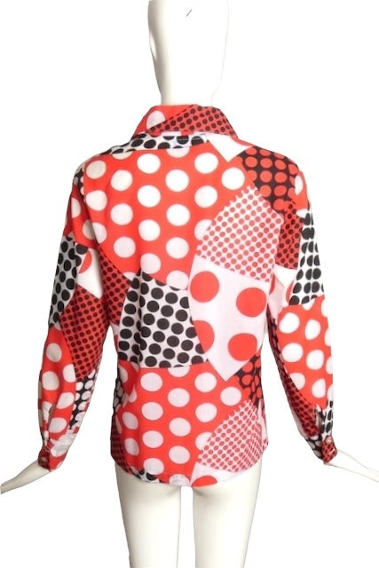 Description: Step into a playful throwback with this 1970s multi-color polka dot blouse! Featuring a fun patchwork of vibrant dots in various sizes, it brings cheerful charm to any outfit. The wide collar and button-front add retro flair, while long sleeves with button cuffs lend a polished finish. Crafted in wrinkle-resistant perm press fabric, this size 6 blouse keeps you looking fresh without the fuss of ironing—effortless style that’s always ready to party.