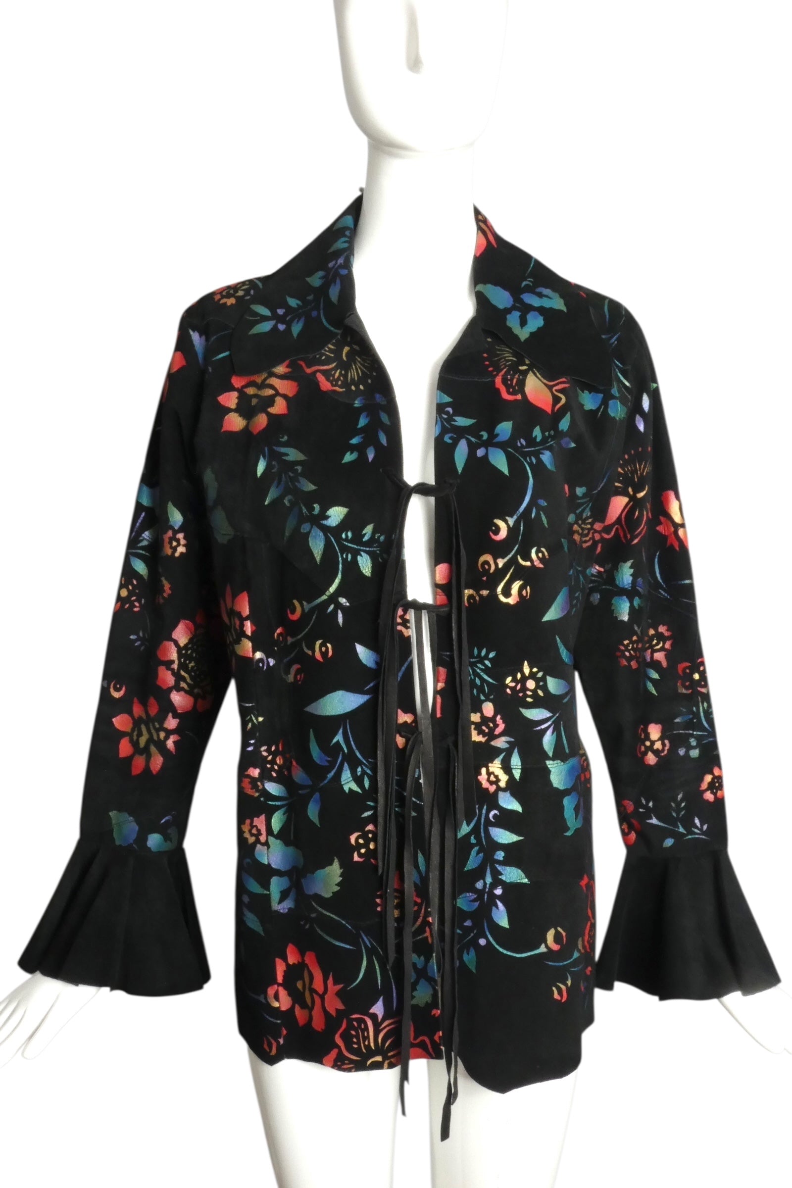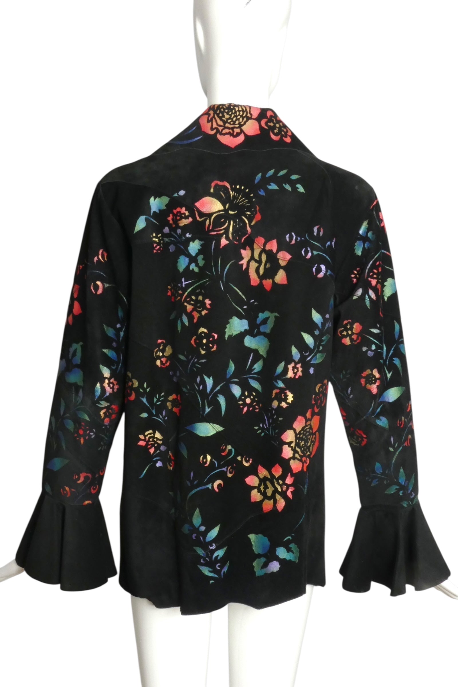Description: A striking late-1970s suede jacket that merges artisanal craftsmanship with bold aesthetic vision. Luxurious black suede serves as the canvas for hand-stenciled floral motifs rendered in electric, iridescent hues that shift with light and movement. The jacket's architectural details—wide spread collar, leather string front closures, and dramatic trumpet cuffs—exemplify the era's maximalist design sensibility. A wearable work of art that captures the experimental spirit of the decade.