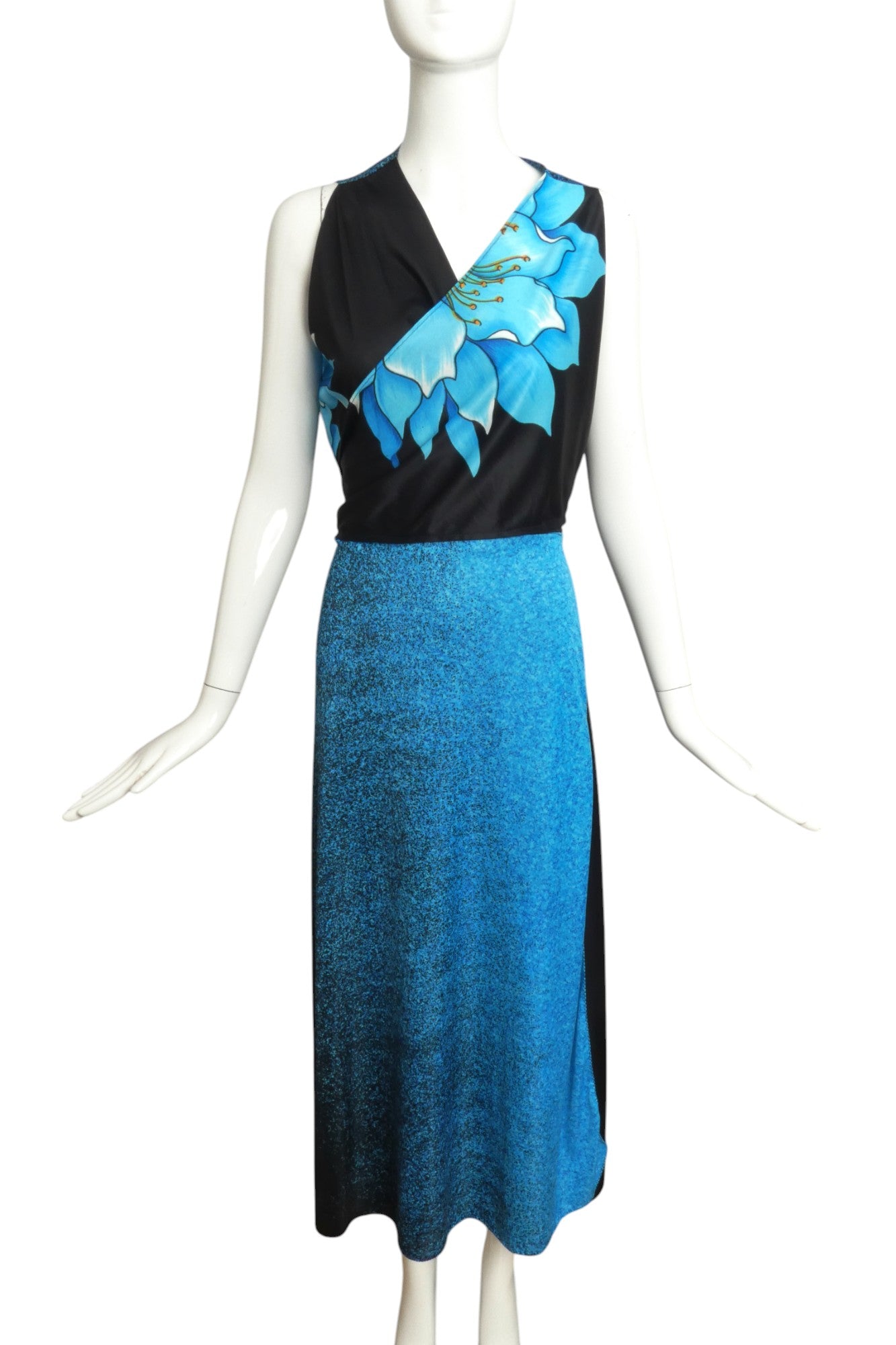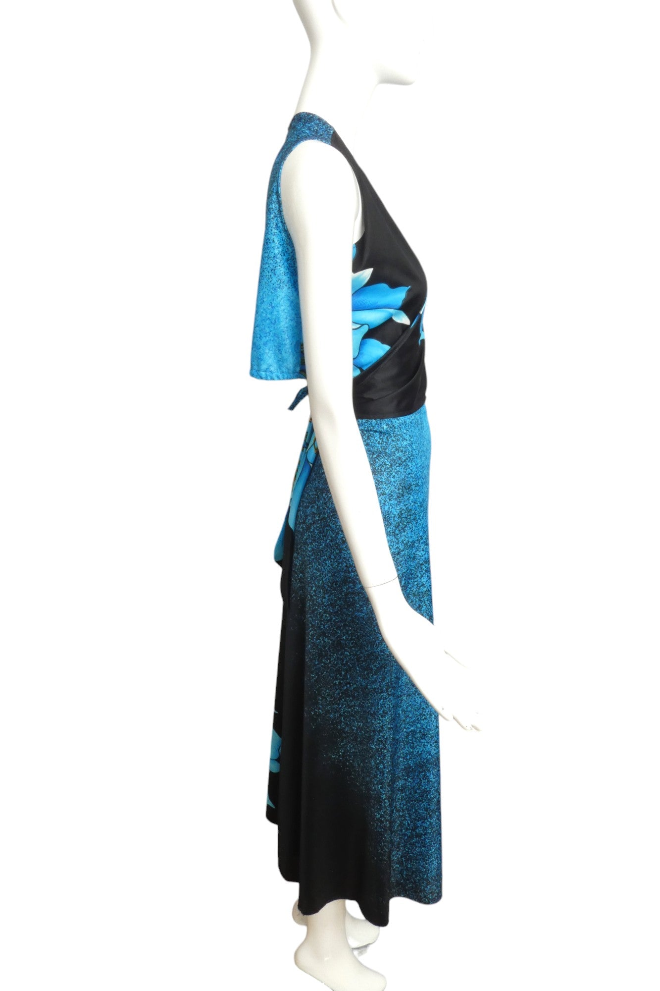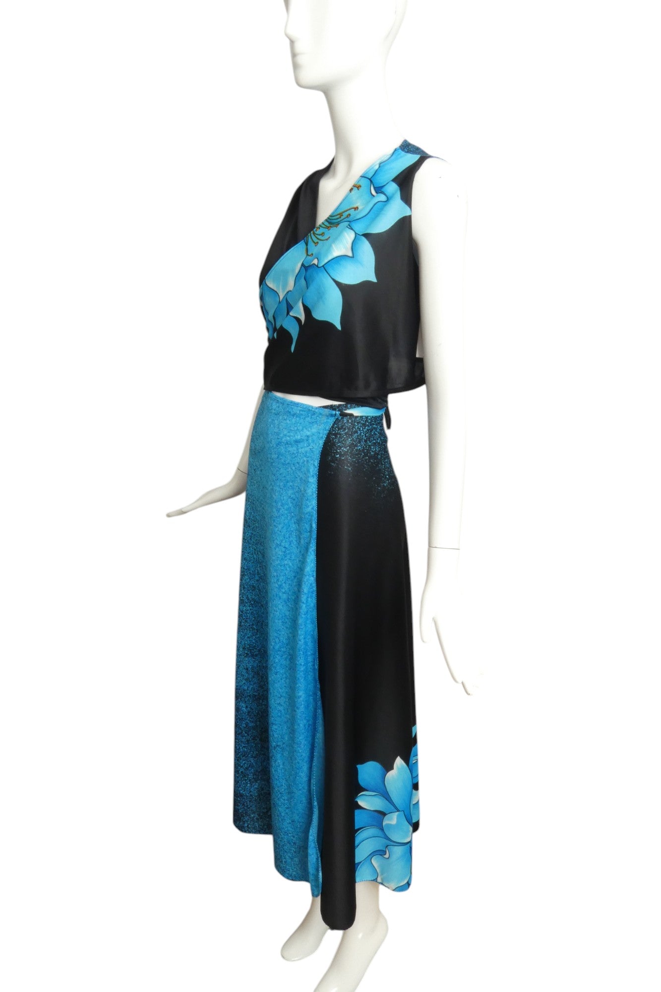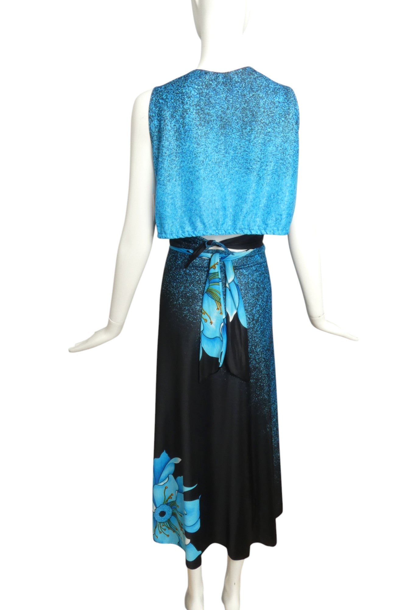 Description: Step into a world of vibrant style with our stunning 1980s Polyester Knit Beach Ensemble, featuring a delightful tropical floral pattern in striking blue and black hues. This two-piece set includes a chic wrap blouse and a flowing wrap skirt, perfect for those sunny days by the shore or casual outings. Embrace the retro charm and effortless elegance of this ensemble, designed to keep you comfortable and stylish all day long. Don't miss out on adding this eye-catching piece to your wardrobe!