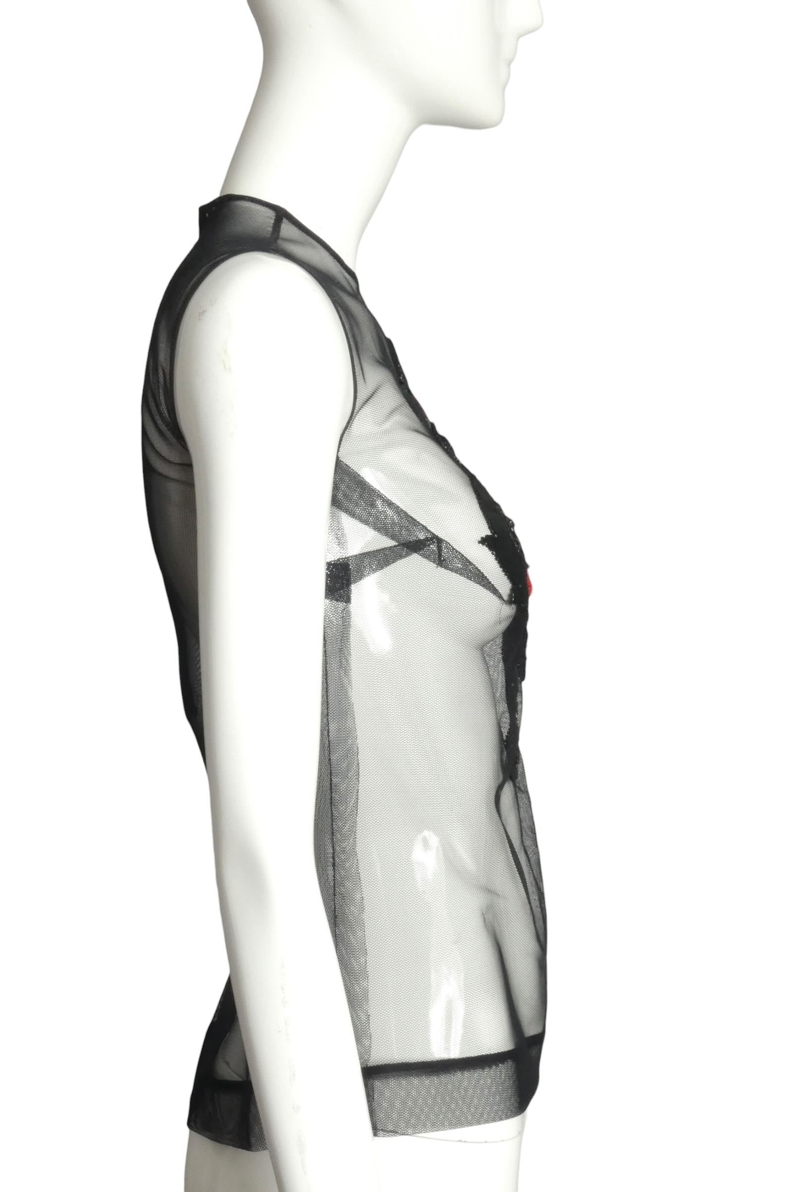 Description: An elegant evening shell from the 1980s, this piece showcases refined craftsmanship in delicate black tulle as the foundation fabric. The front is lavishly embellished with intricate red floral crewel embroidery combined with coordinating beadwork, creating dimensional ornamentation and visual richness. The embroidery and beadwork demonstrate meticulous hand-applied techniques characteristic of haute couture construction. A center back zipper closure provides practical functionality while maintaining the garment's sophisticated silhouette. This distinguished piece exemplifies the era's approach to evening elegance, combining understated simplicity with ornamental detailing to create a refined and memorable garment.