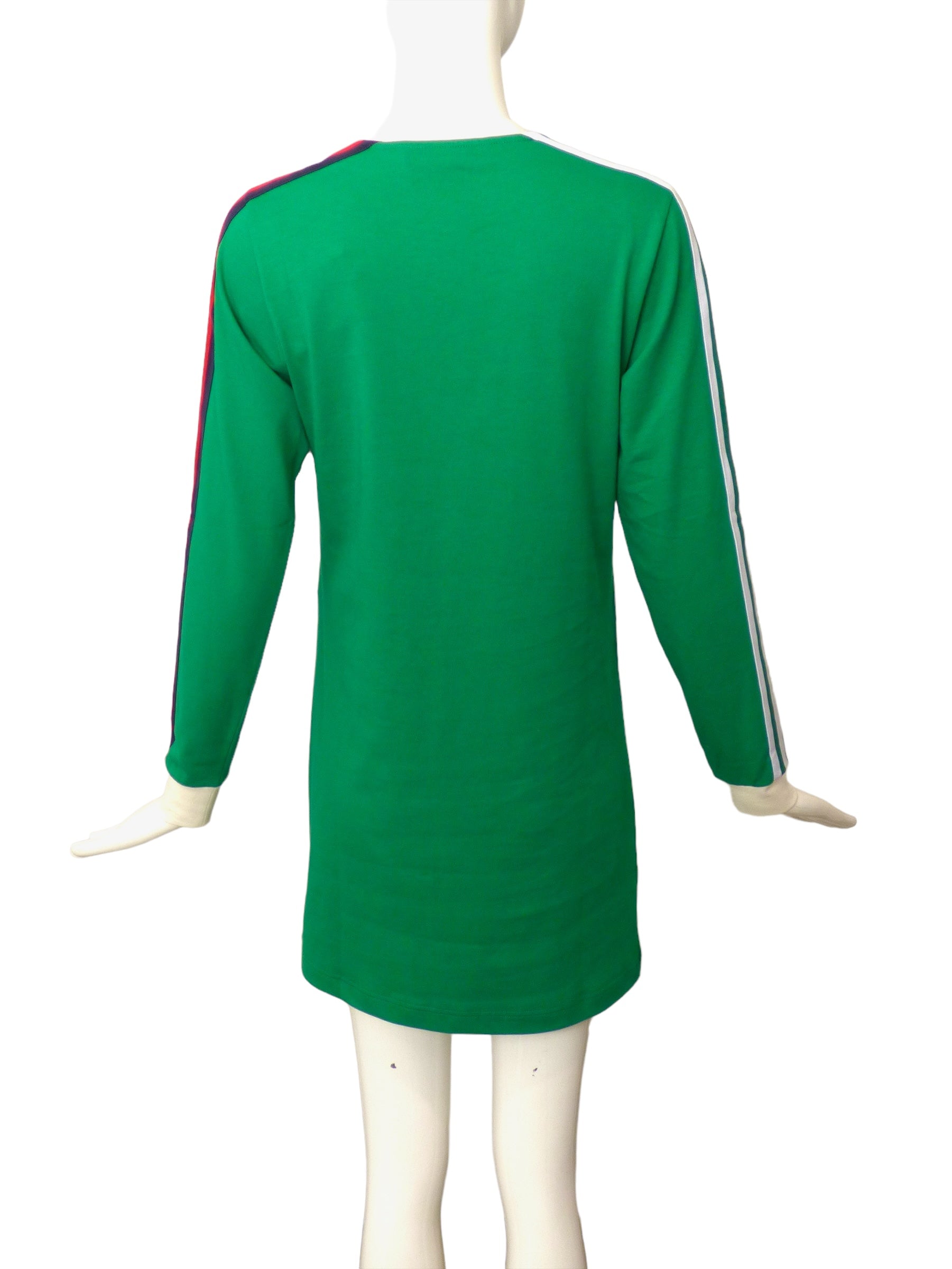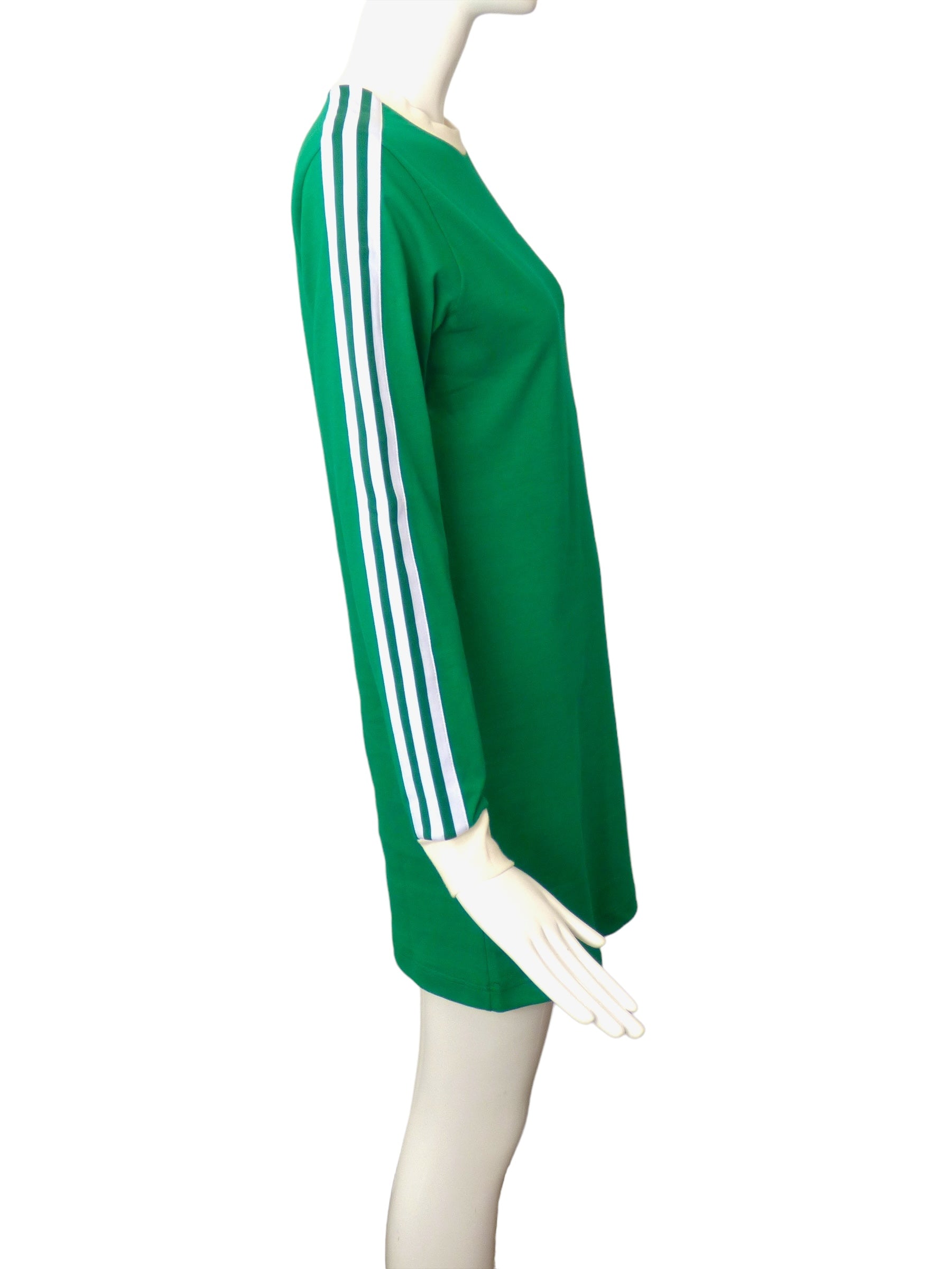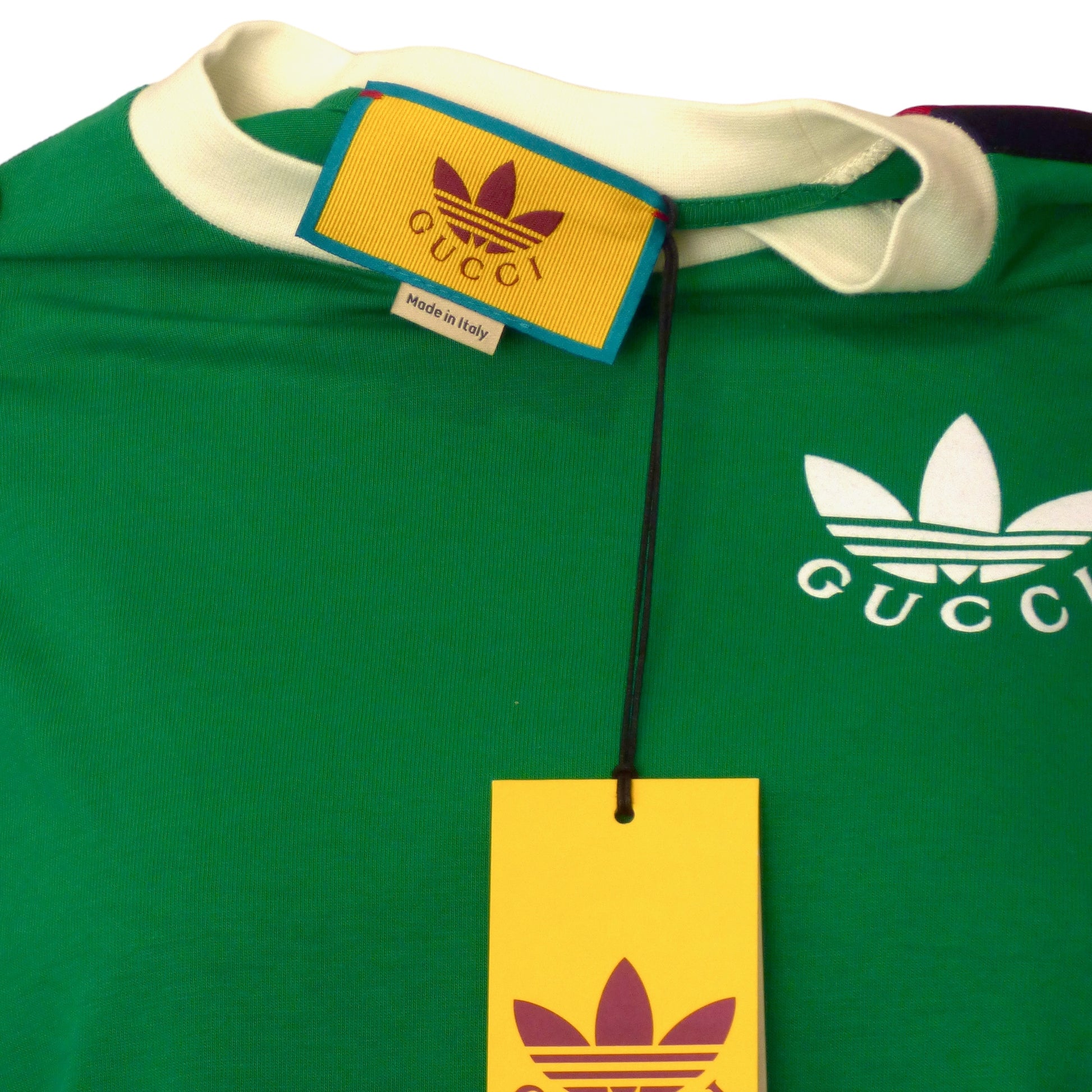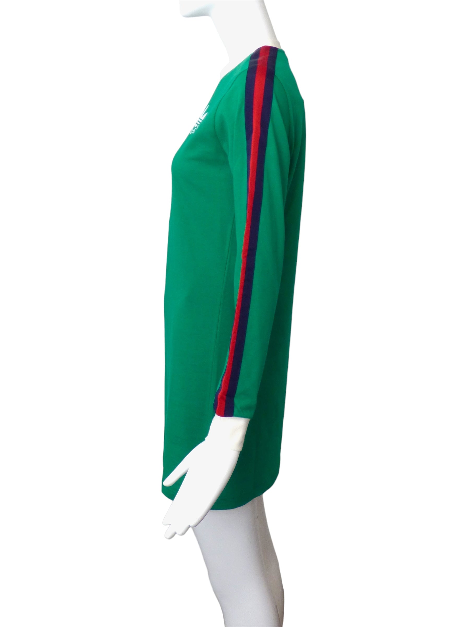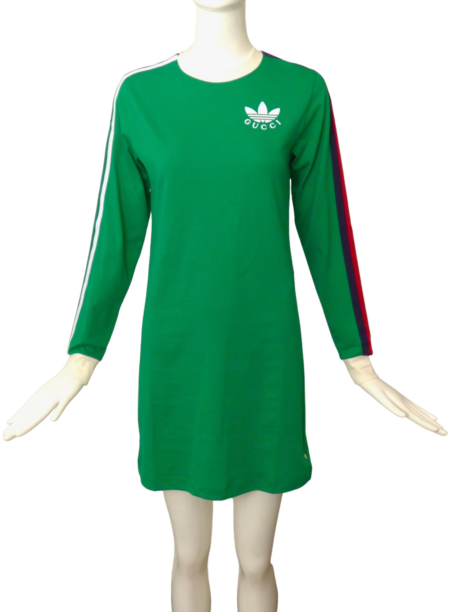 Description: Experience the ultimate collaboration between Gucci and adidas with this stunning jersey dress. In a beautiful green color, it features the iconic adidas stripes on one arm and the mesmerizing Gucci stripes on the other. Complete with the Gucci adidas logo on the chest, this dress comes with the original store tags still attached, making it a must-have for any fashion enthusiast. Still has the original store tags attached.