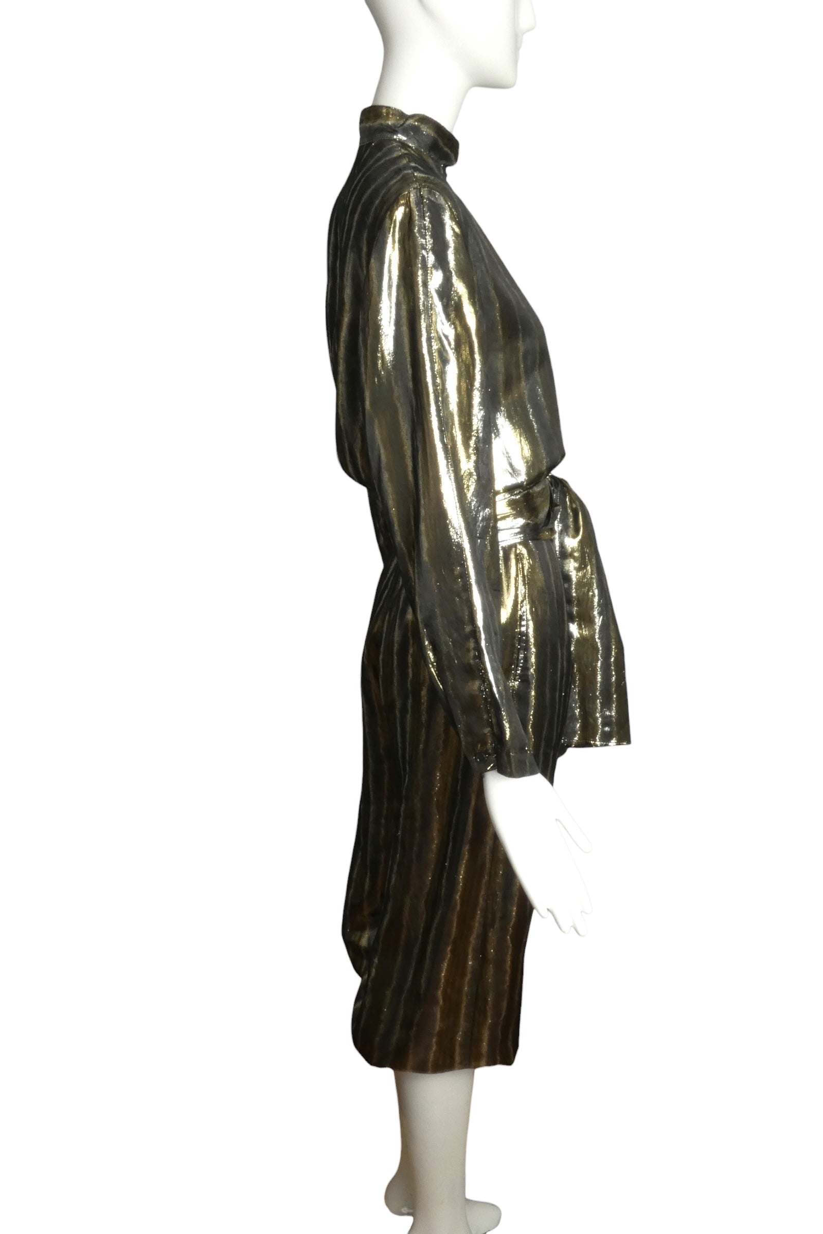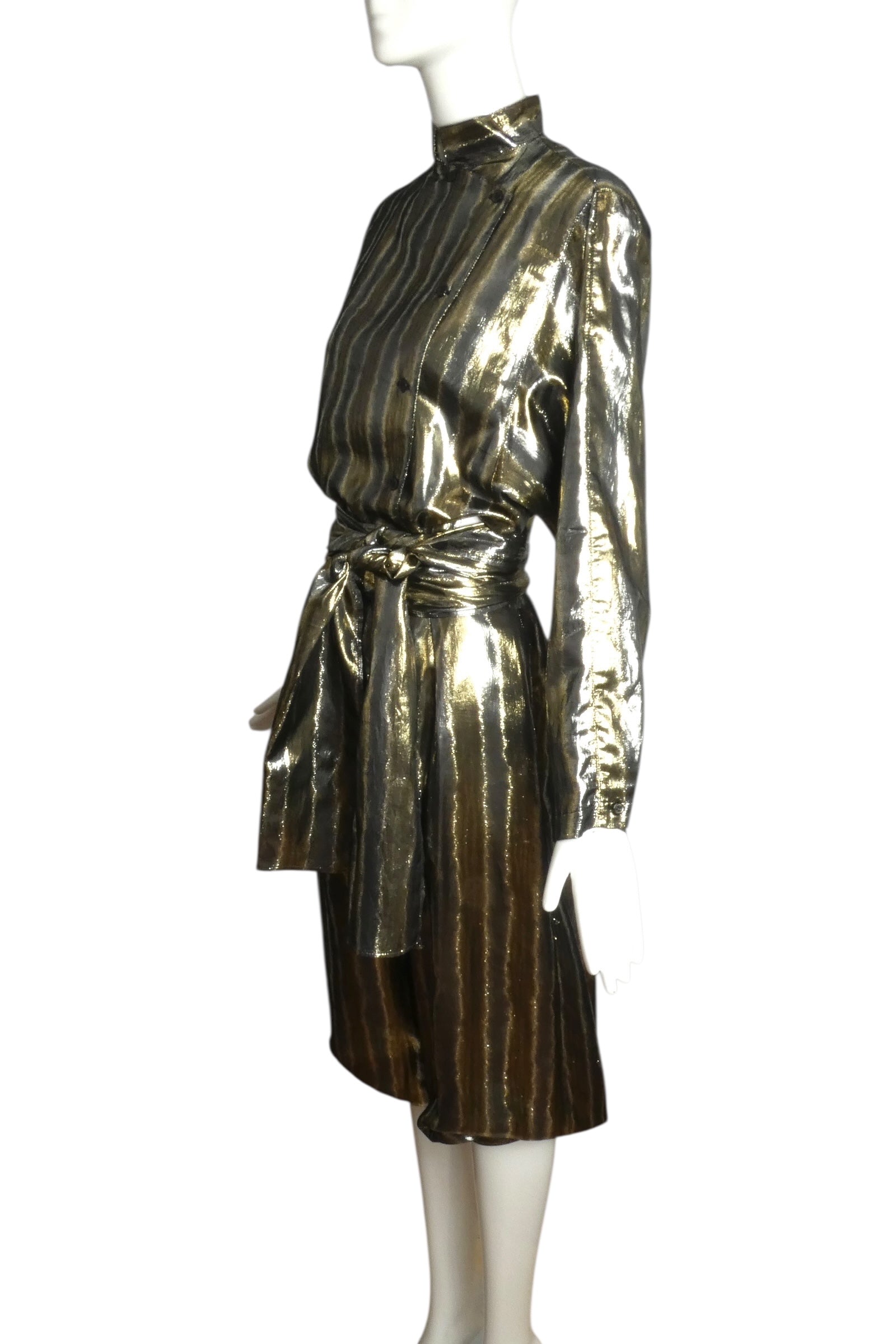 Description: This exquisite 1980s evening ensemble exemplifies the opulent glamour of the decade. Crafted from lustrous gold and silver striped tissue lamé, the two-piece set features a striking Russian-inspired blouse with a commanding tall neckline and asymmetrical button closure that fastens diagonally across the left shoulder and down the side. Long sleeves terminate in elegant pleats with buttoned wrist bands for refined detail. The coordinating trousers drape generously from a wide waistband, gathering at the ankles with button-closure leg bands. A luxurious wide sash cinches the waist, completing this show-stopping metallic statement piece. Perfect for the discerning collector of vintage evening wear.
