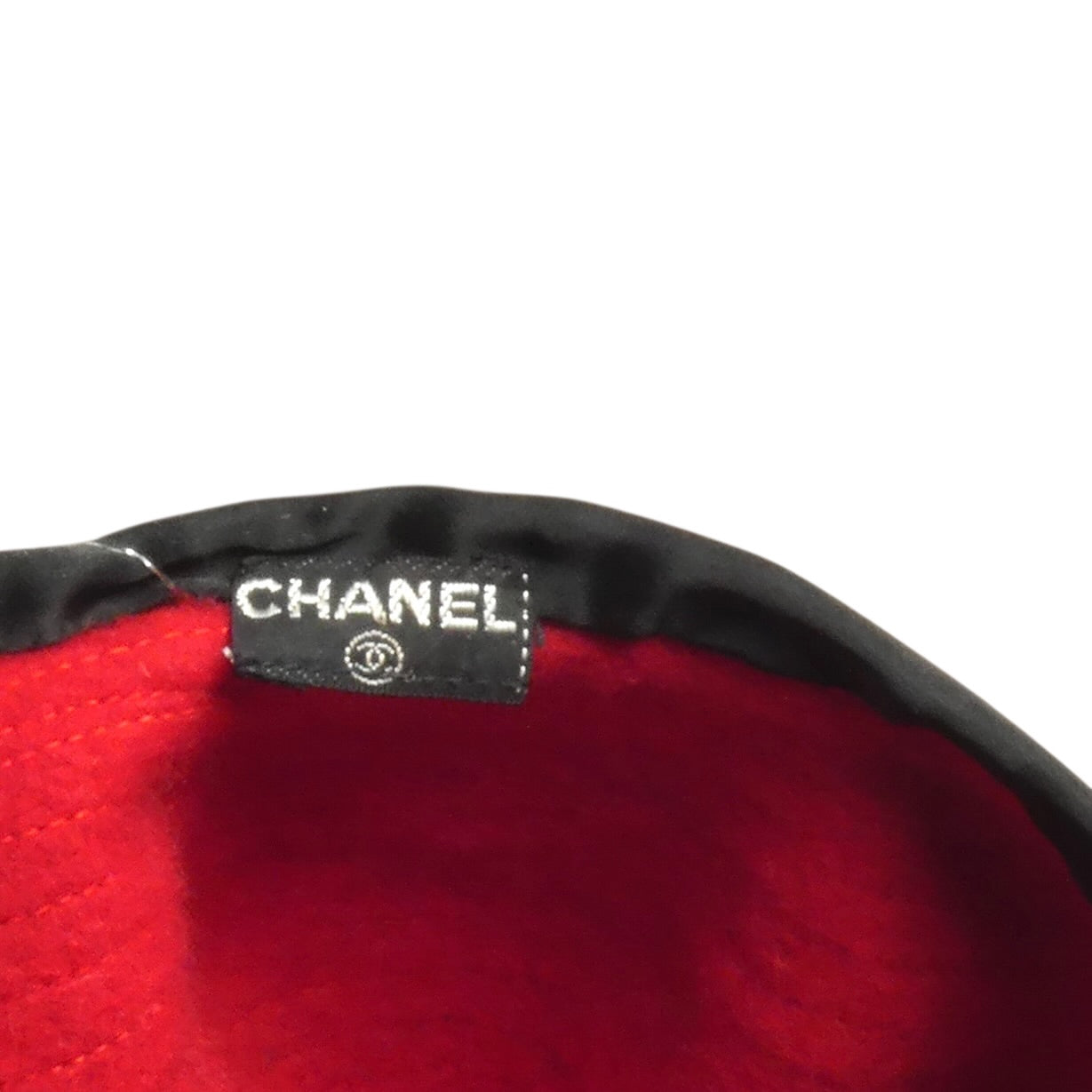 Description: Classic 1980s Chanel beret crafted in rich red wool with tonal topstitching throughout. The softly structured, rounded silhouette is finished with a black satin band and an oversized bow detail, adding contrast and a touch of understated elegance. Fully lined for comfort, with the original Chanel label intact. A timeless Parisian staple with signature Chanel refinement.