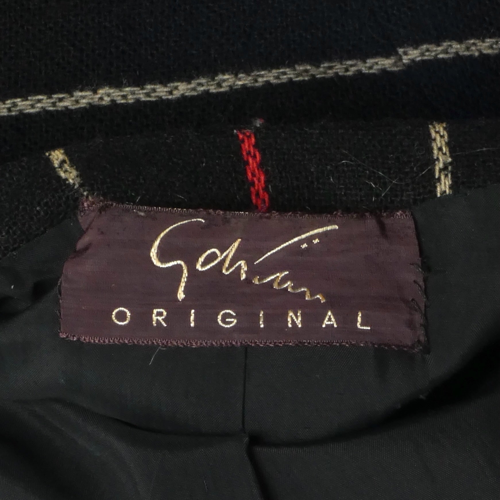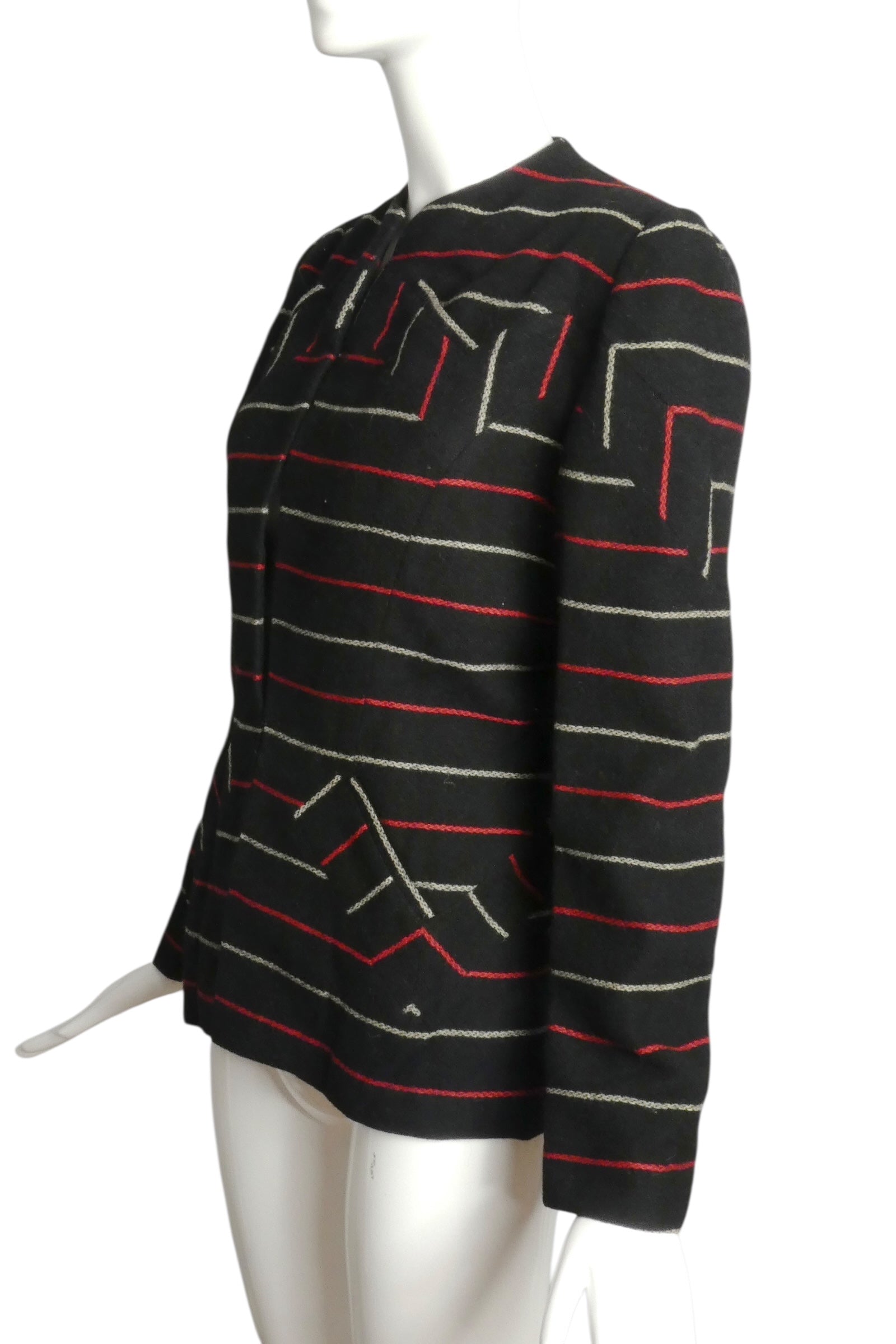 Description: A remarkable mid-1940s Adrian blazer in black wool featuring an ivory and red chain stripe throughout. The designer's signature innovation appears in the chest and upper sleeves, where strategic stripe manipulation creates dynamic geometric patterning—a hallmark of Adrian's architectural tailoring approach. Inset welt pockets at the waist provide functional elegance, while a single hook closure at the center front maintains the streamlined silhouette. A rare collector's piece exemplifying Adrian's mastery of precision construction and sophisticated color play during Hollywood's golden age.