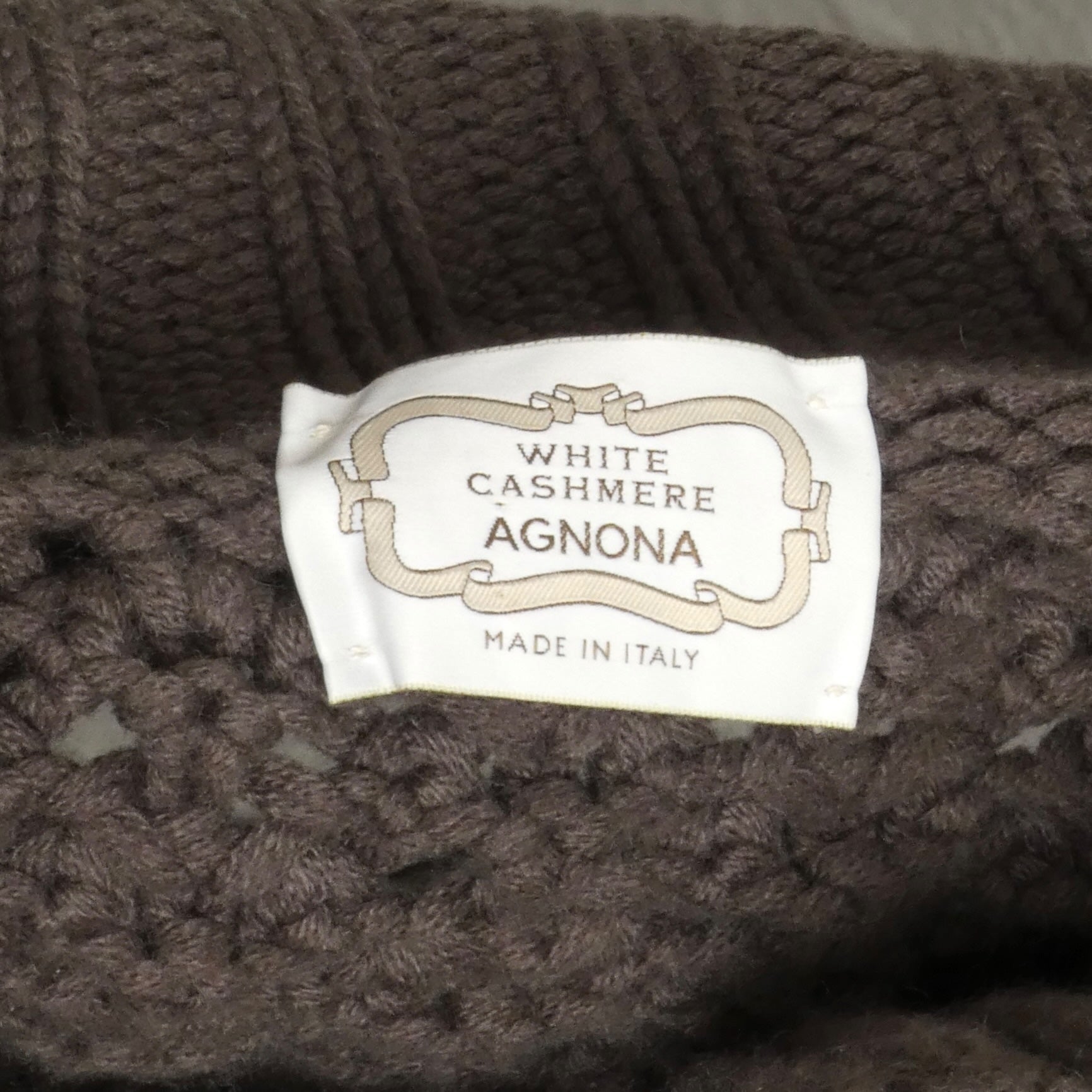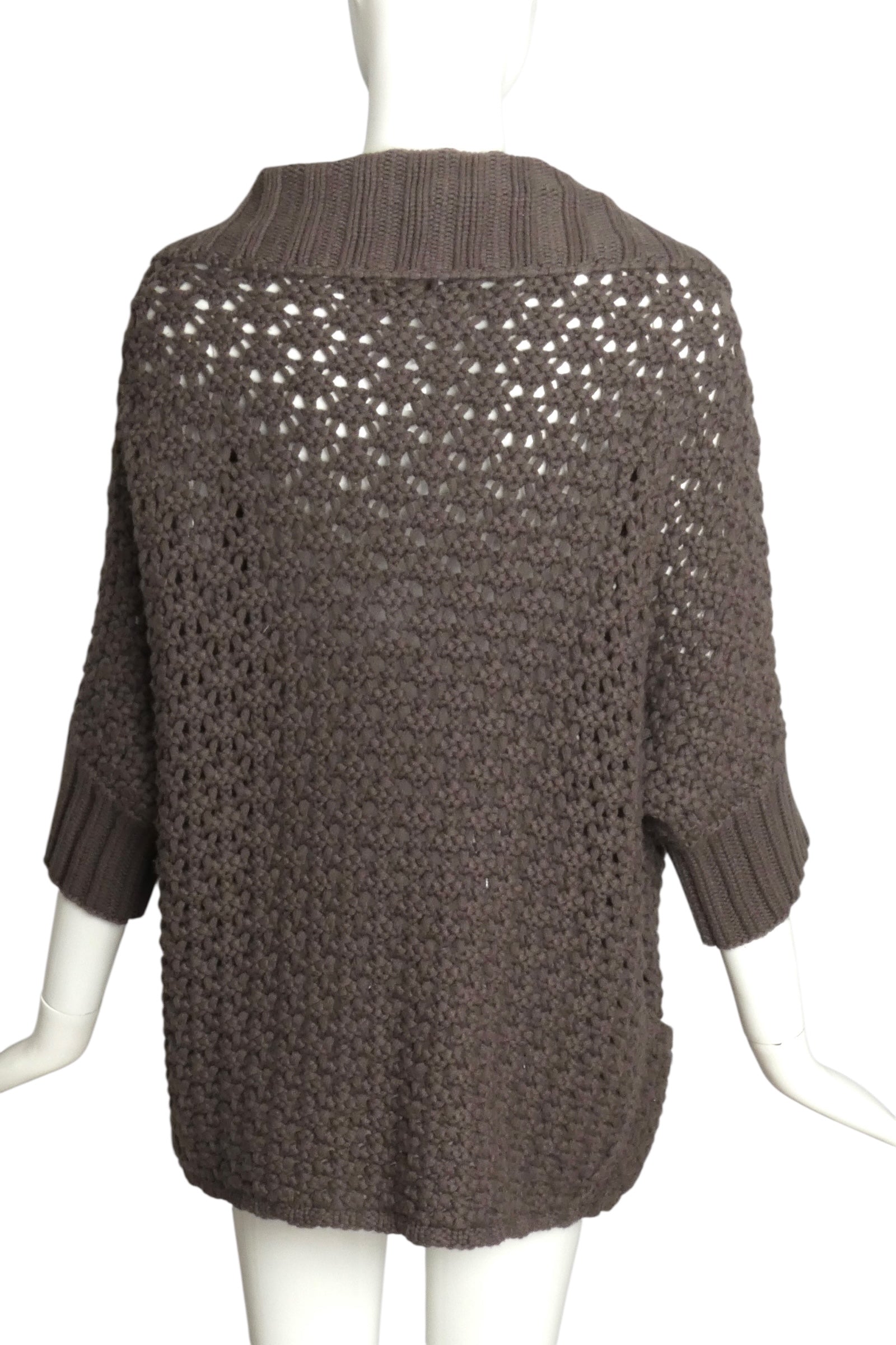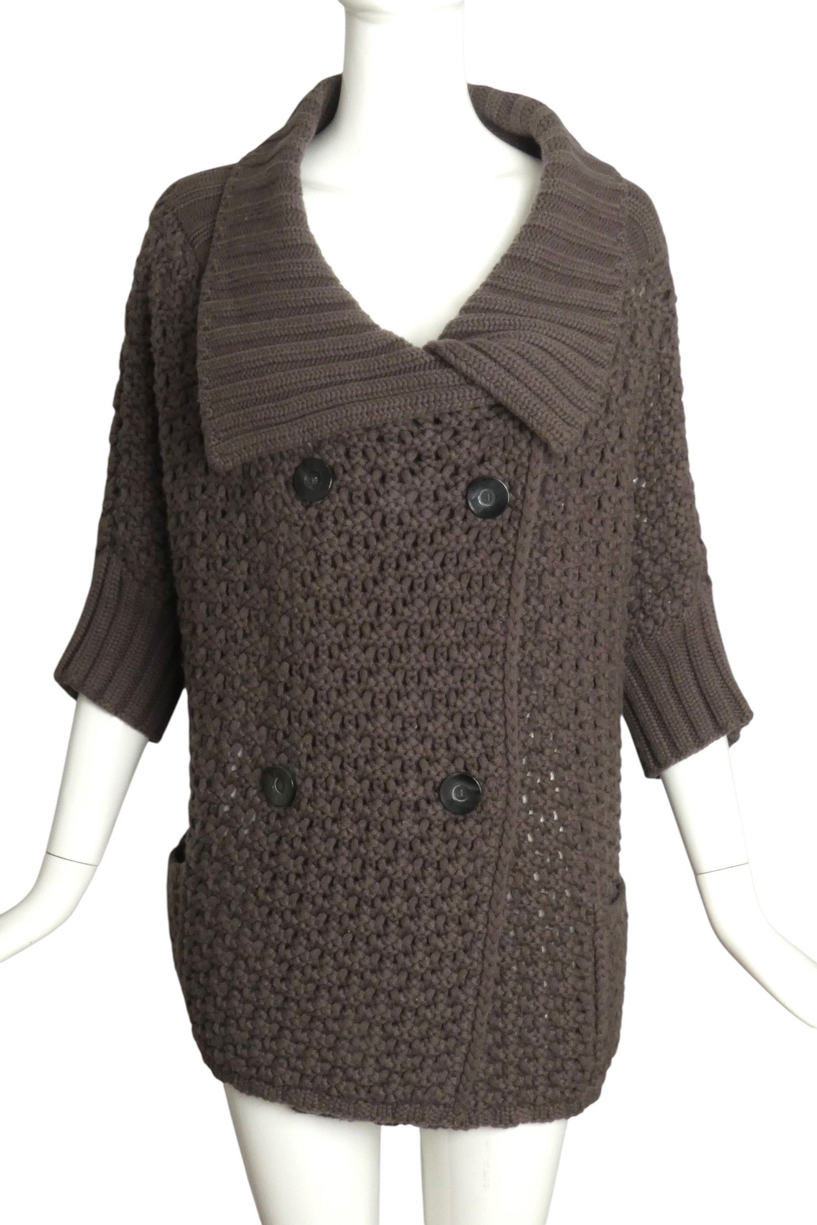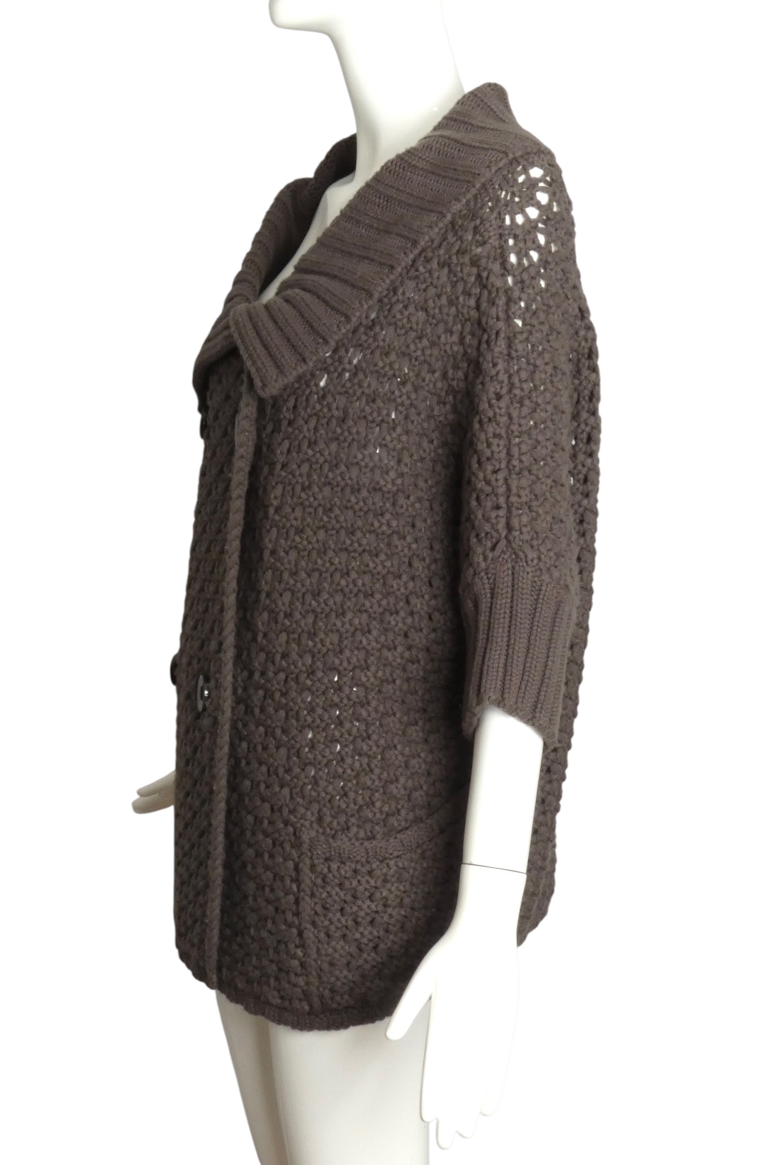 Description: This Agnona double-breasted cashmere cardigan features a luxurious open weave design that balances warmth with breathability. It offers a sophisticated silhouette with shawl lapels and elbow-length sleeves finished with ribbed knit bands for added structure. Functional patch pockets at the hips provide discreet storage, while the button closures down the front enhance its classic appeal. Condition: Gently Worn with no obvious damage