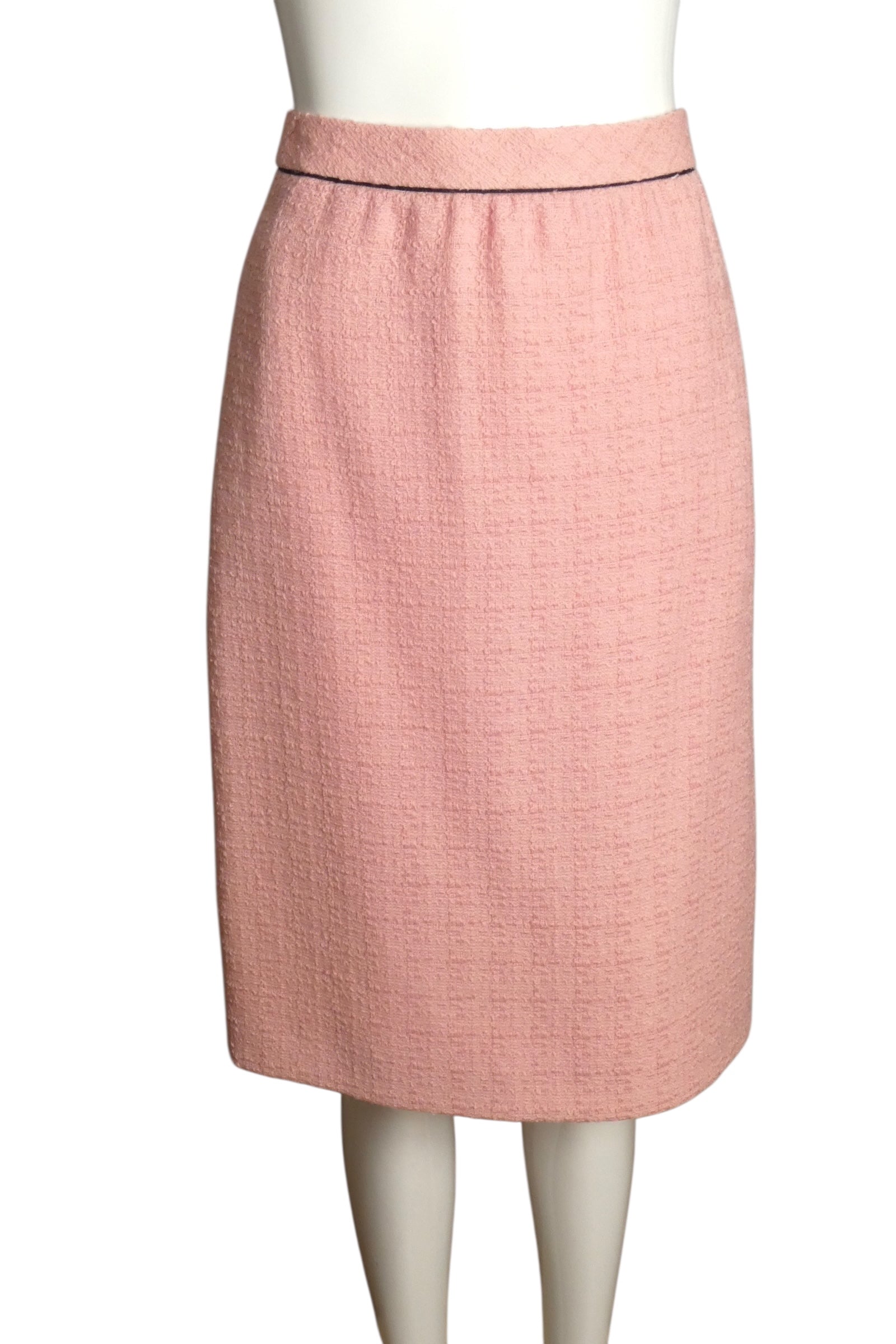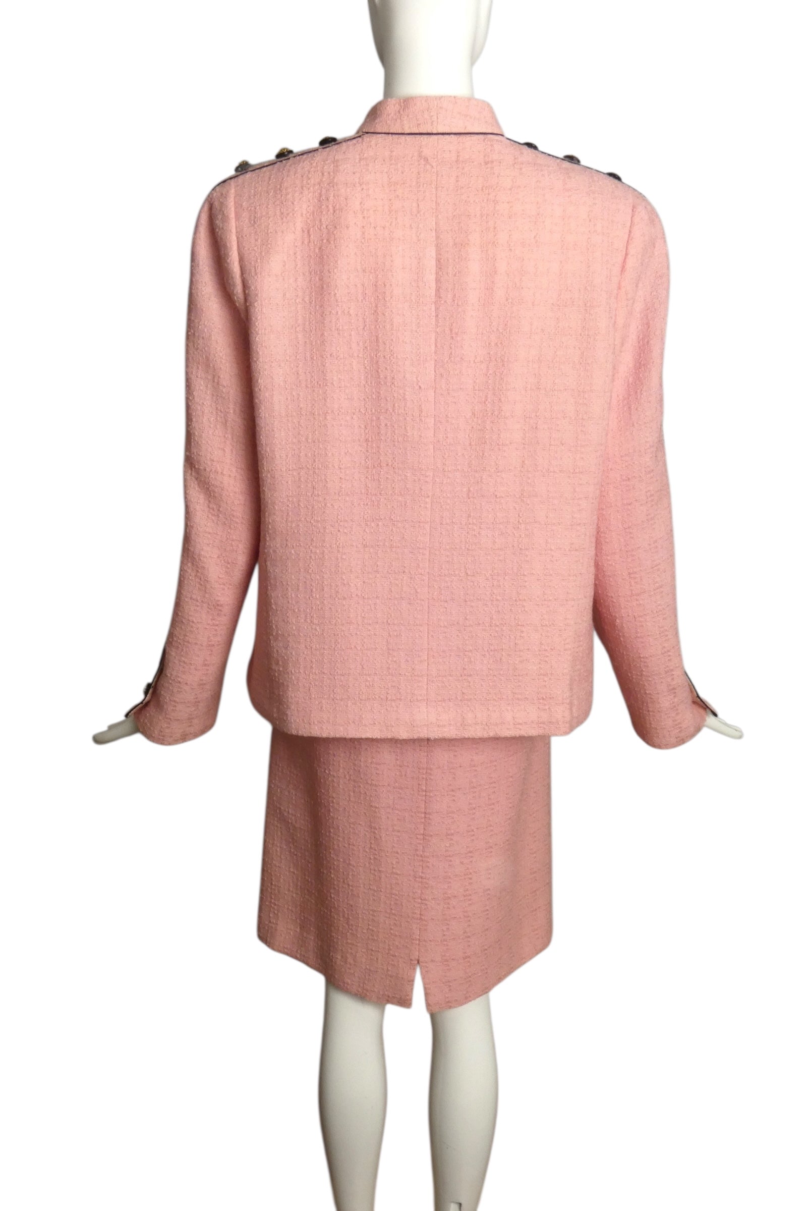 Description: This delightful 1980s Akris suit in pale pink tweed is edged with bold black piping for a striking look. The blazer features a band collar, no front closures, and charming button details on the shoulders and patch pockets. Long sleeves echo the piping, finished with matching buttons. Inside, a playful pink and black star-print silk lining and a gold chain along the hem add elegant surprises. The fitted skirt, with a piped waistband and inset side pockets, completes this playful yet refined ensemble perfect for making a stylish statement.