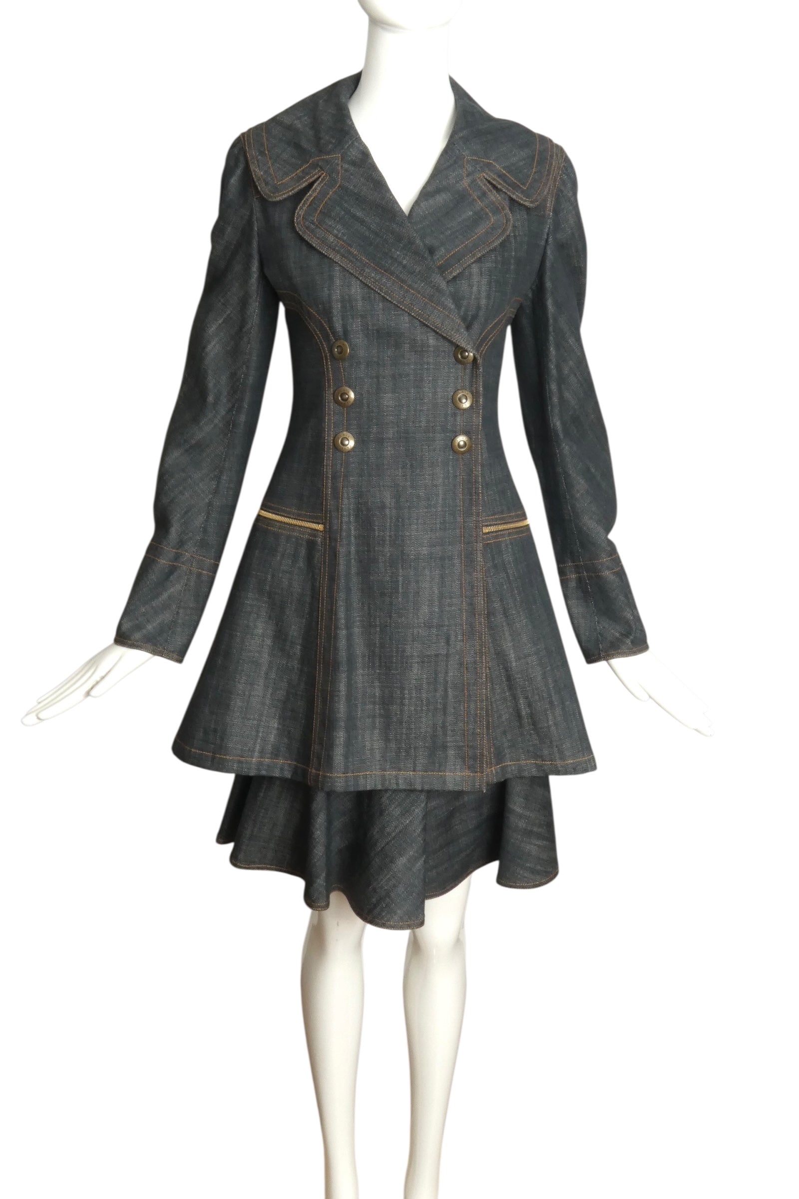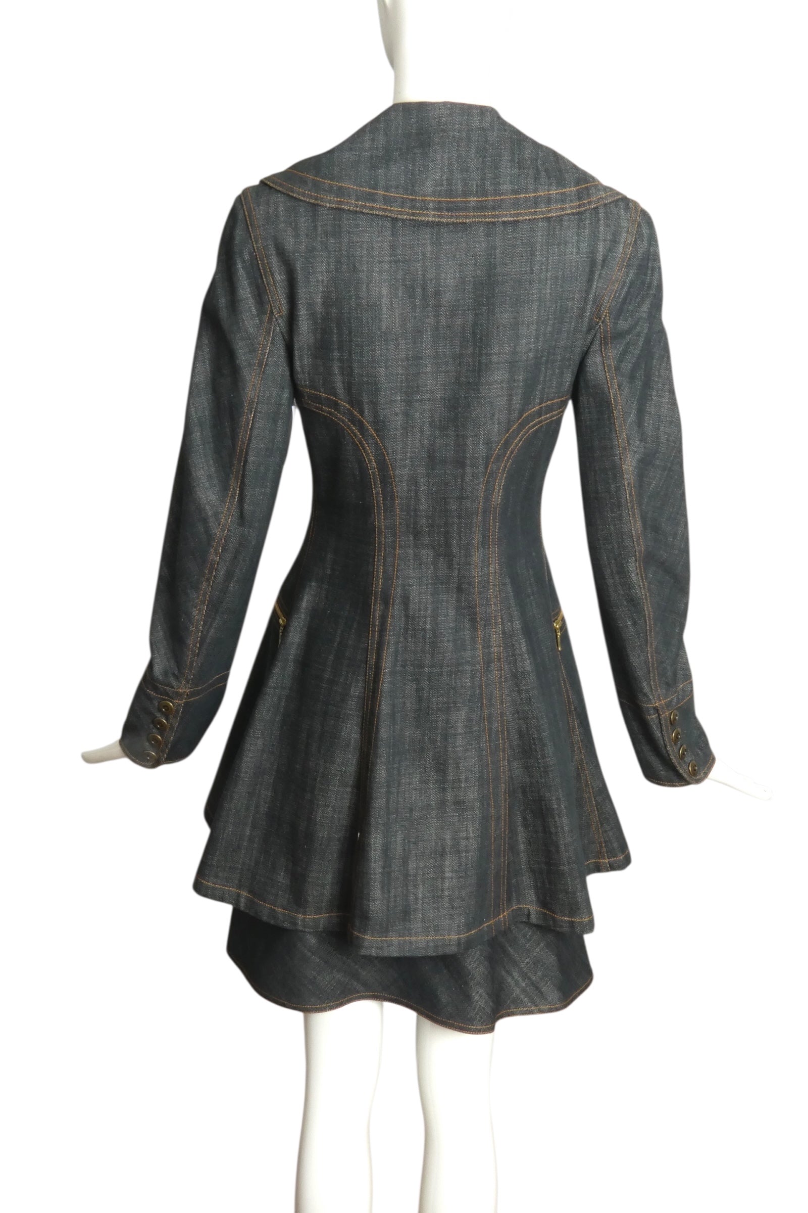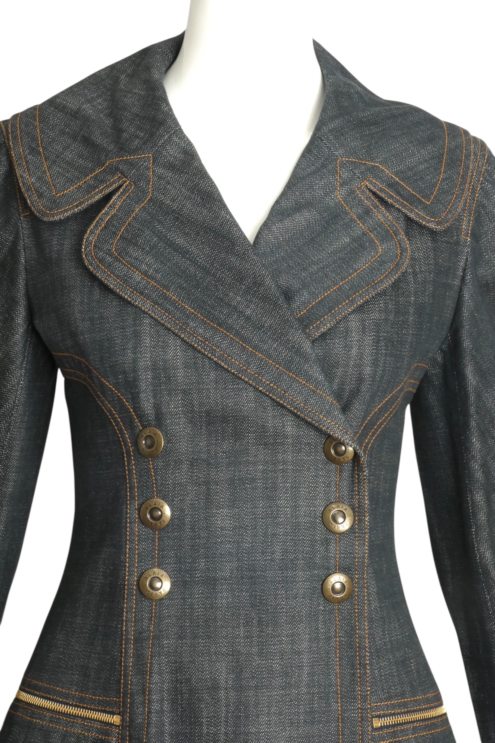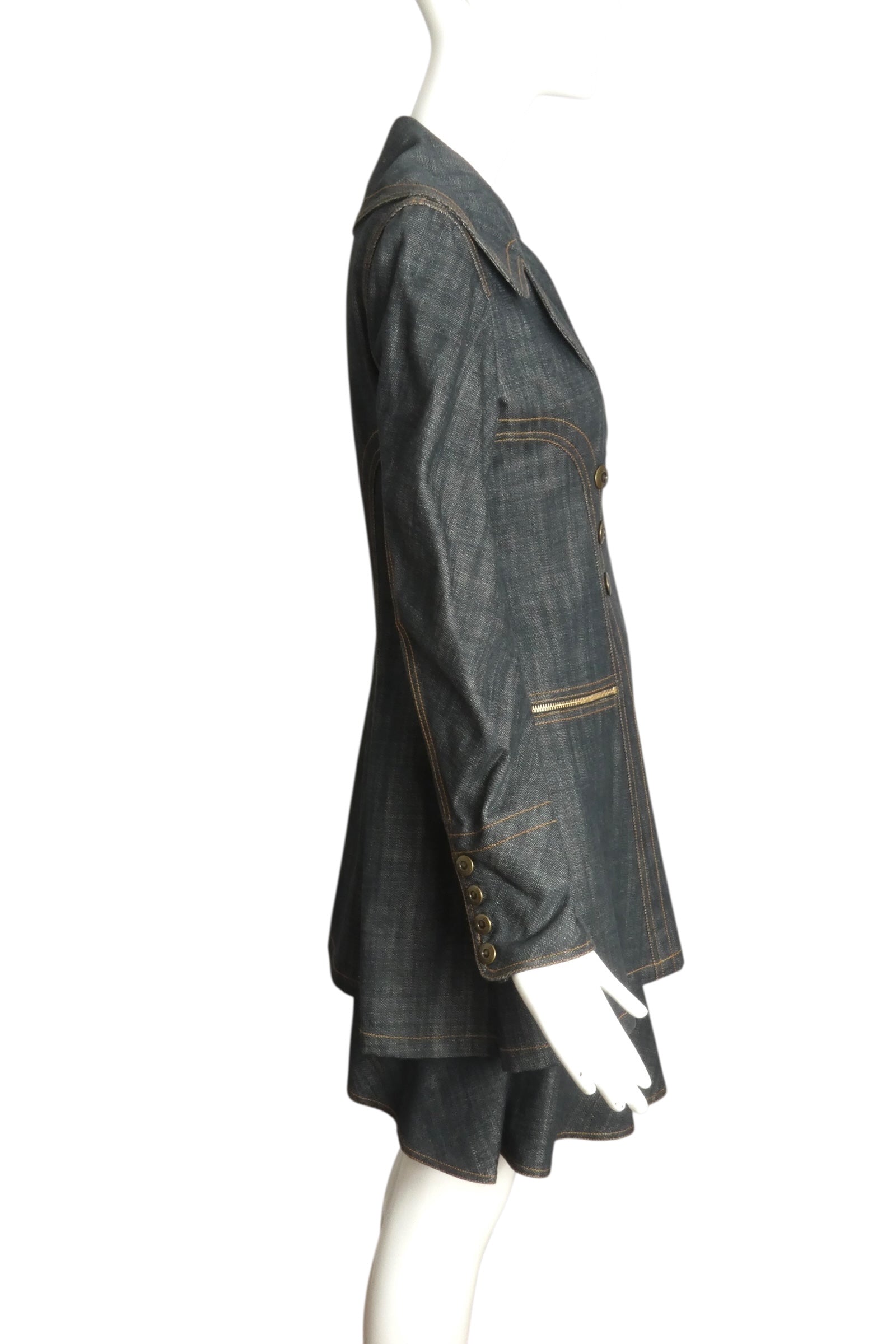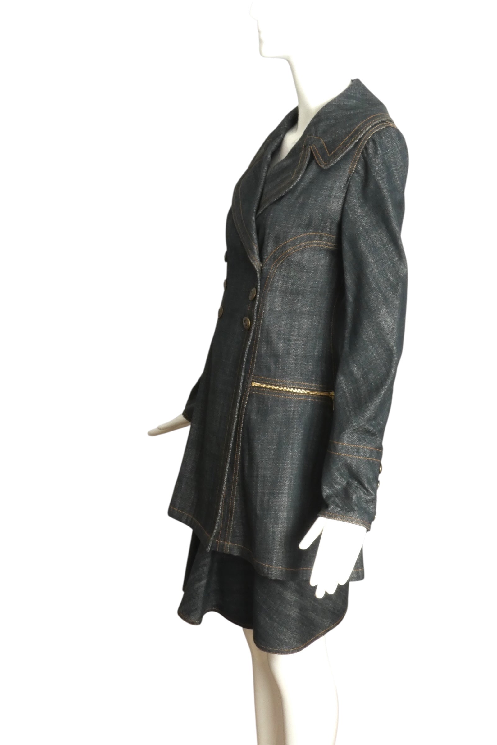 Description: Step out with a bold vintage vibe in this 1990s ALAIA blue denim suit! The long jacket boasts notched lapels, double-breasted snap closures, and sleek princess seams, while zippered hip pockets add a cool edge. The matching skirt fits snug at the waist without a waistband and features playful side zippers and a chic bias denim ruffle that travels across front and back. Fun, flirty, and effortlessly stylish—this ensemble is made for turning heads.