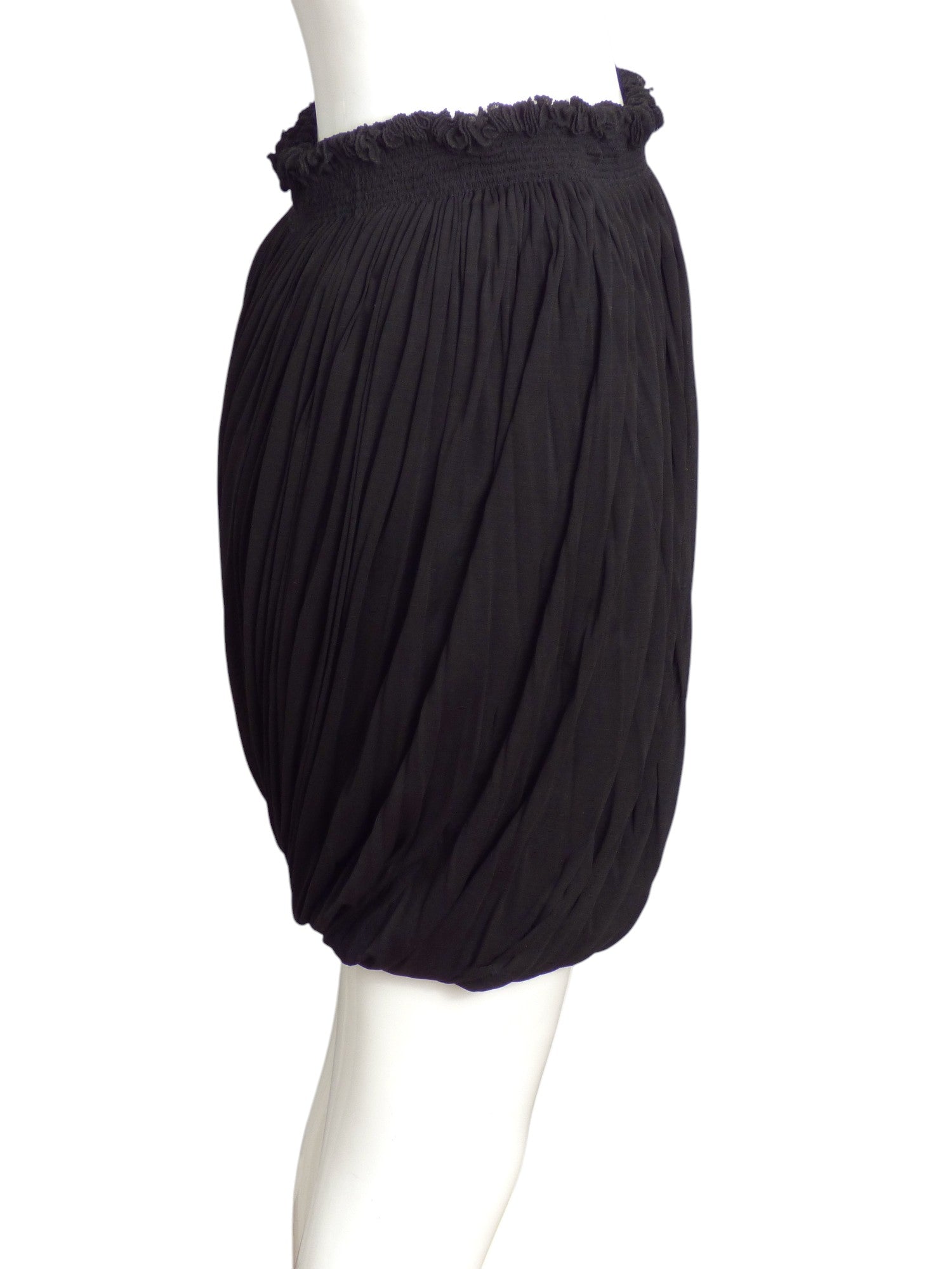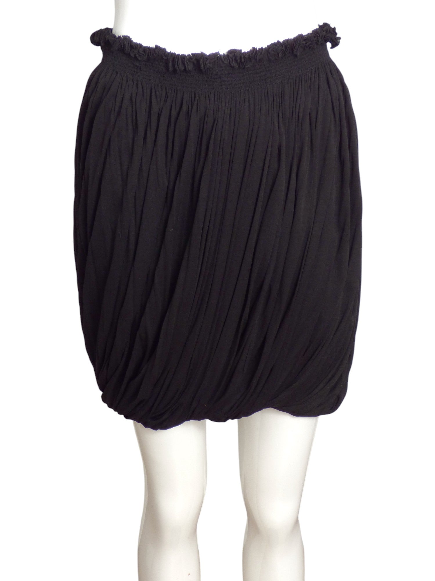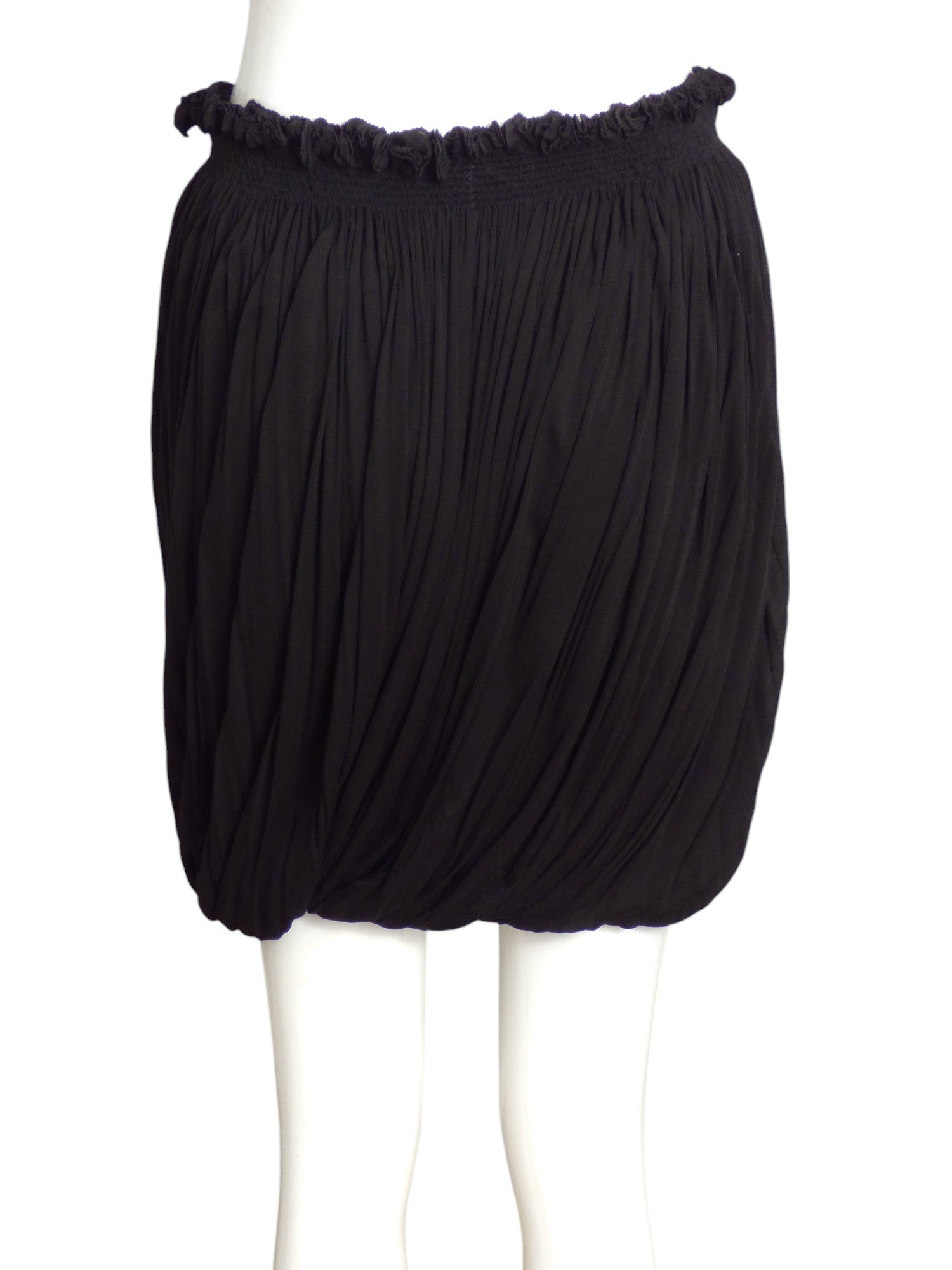 Description: This charming mini skirt, crafted from soft black jersey knit, features an elastic shirred waistband adorned with a delicate ruffled edge. The design showcases playful gathers that create a bubble effect at the hem, while the fabric's slight twist elegantly wraps around the hips, enhancing the silhouette. This item remains in pristine condition with original store tags, priced at $1825.00.