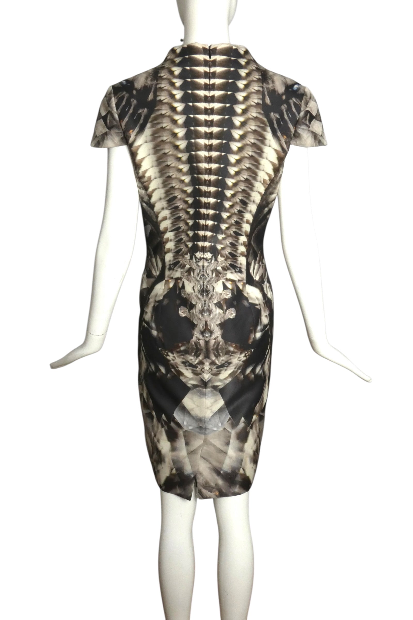 Description: Sourced directly from Alexander McQueen's Spring 2009 runway collection, this striking printed dress represents the designer's mastery of graphic storytelling through textiles. Constructed from a refined silk blend with subtle luminosity, the piece features a graceful scoop neckline and delicate shoulder cap sleeves that balance the dress's structured silhouette. Precision dart construction creates a fitted, body-conscious profile that emphasizes the wearer's form. The lustrous fabric catches light beautifully, enhancing the visual impact of the bold print. A significant example of McQueen's ability to merge wearable sophistication with conceptual artistry.