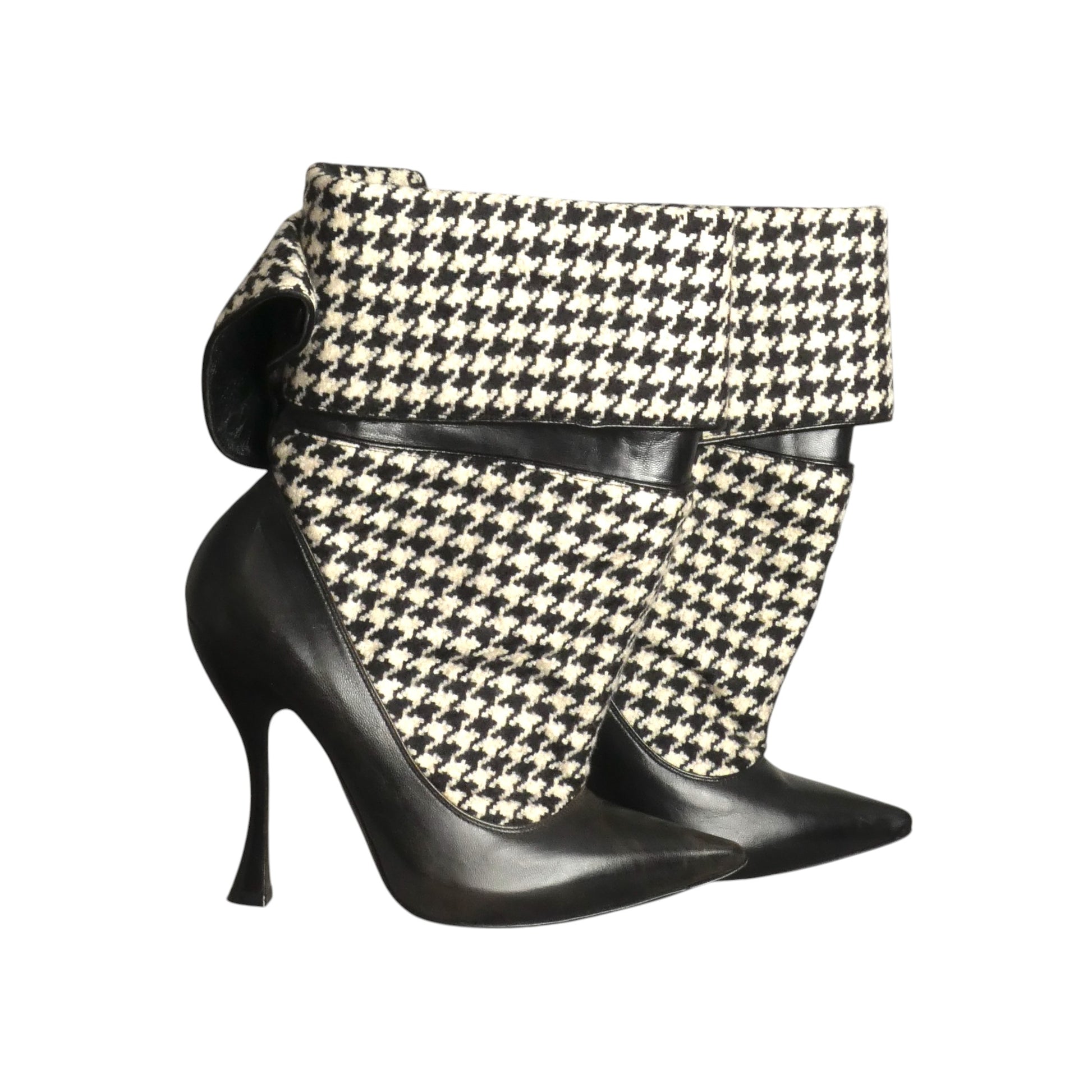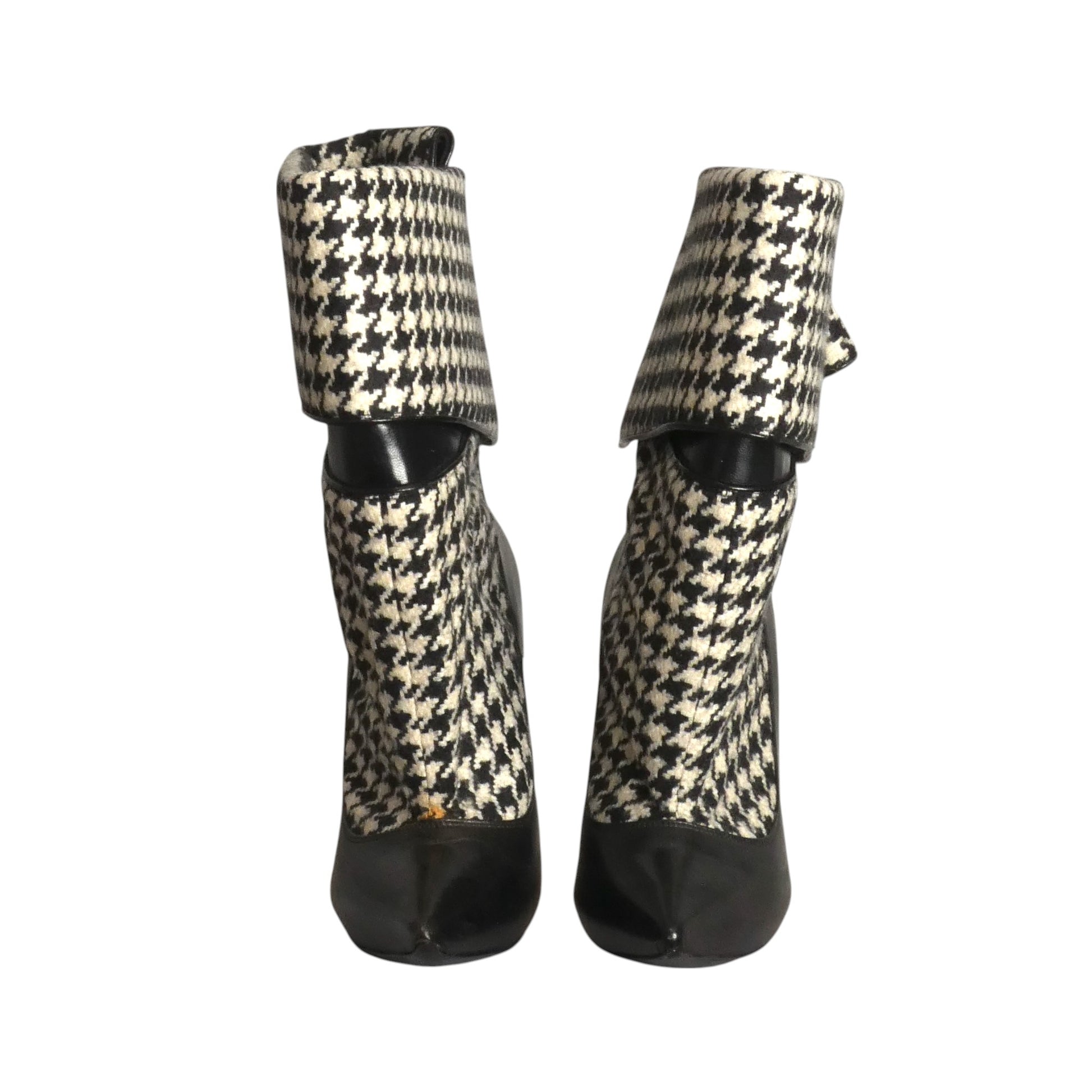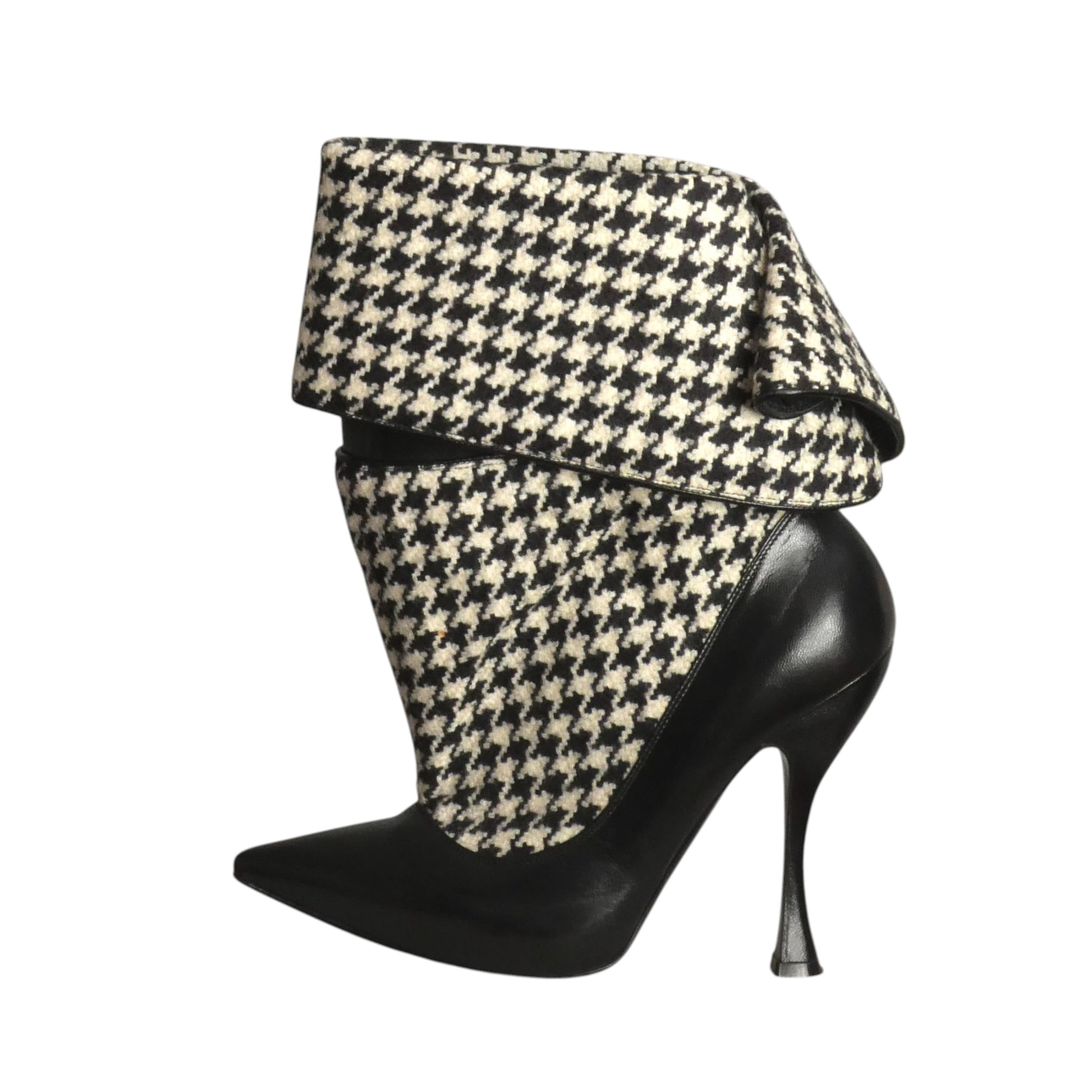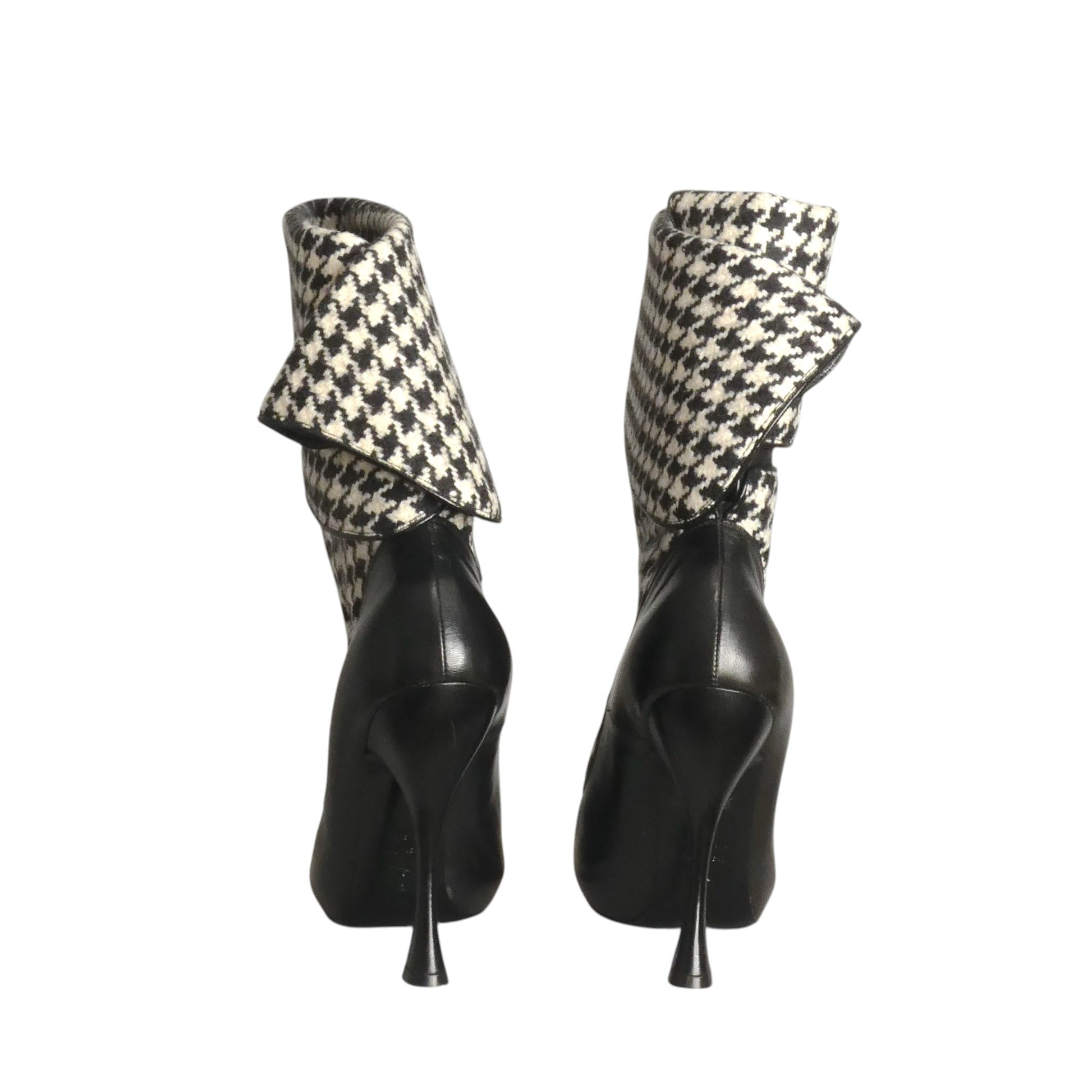 Description: Step into sophistication with the Alexander McQueen houndstooth boots, a stunning blend of classic and contemporary design. Crafted from luxurious wool houndstooth and accented with sleek black leather, these high-heeled stunners feature a chic button-closing flap that adds a touch of elegance. Perfect for making a statement this fall, the stiletto heels elevate your look while ensuring you stand out in any crowd. Embrace the boldness of fashion with these iconic boots that effortlessly combine style and comfort.