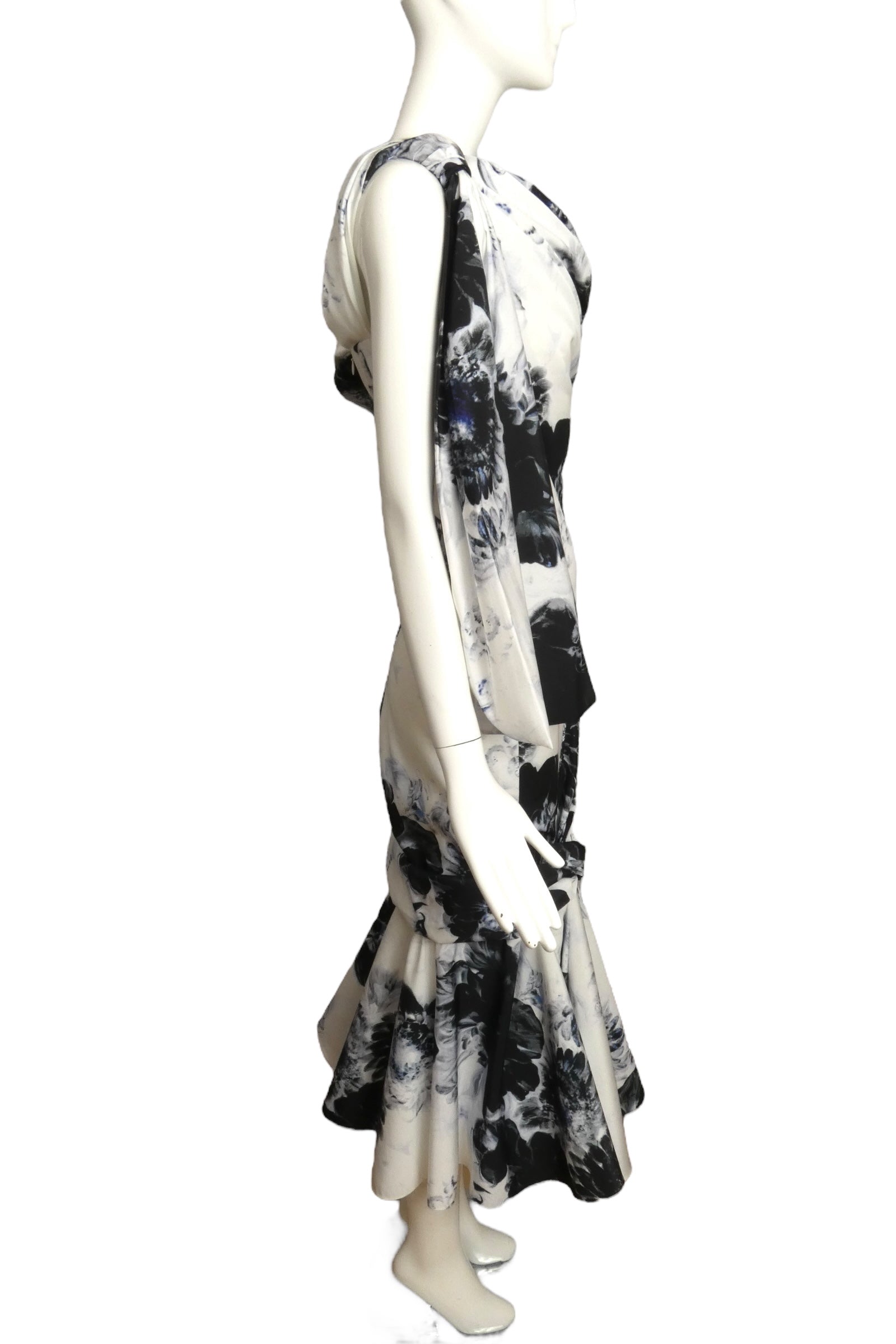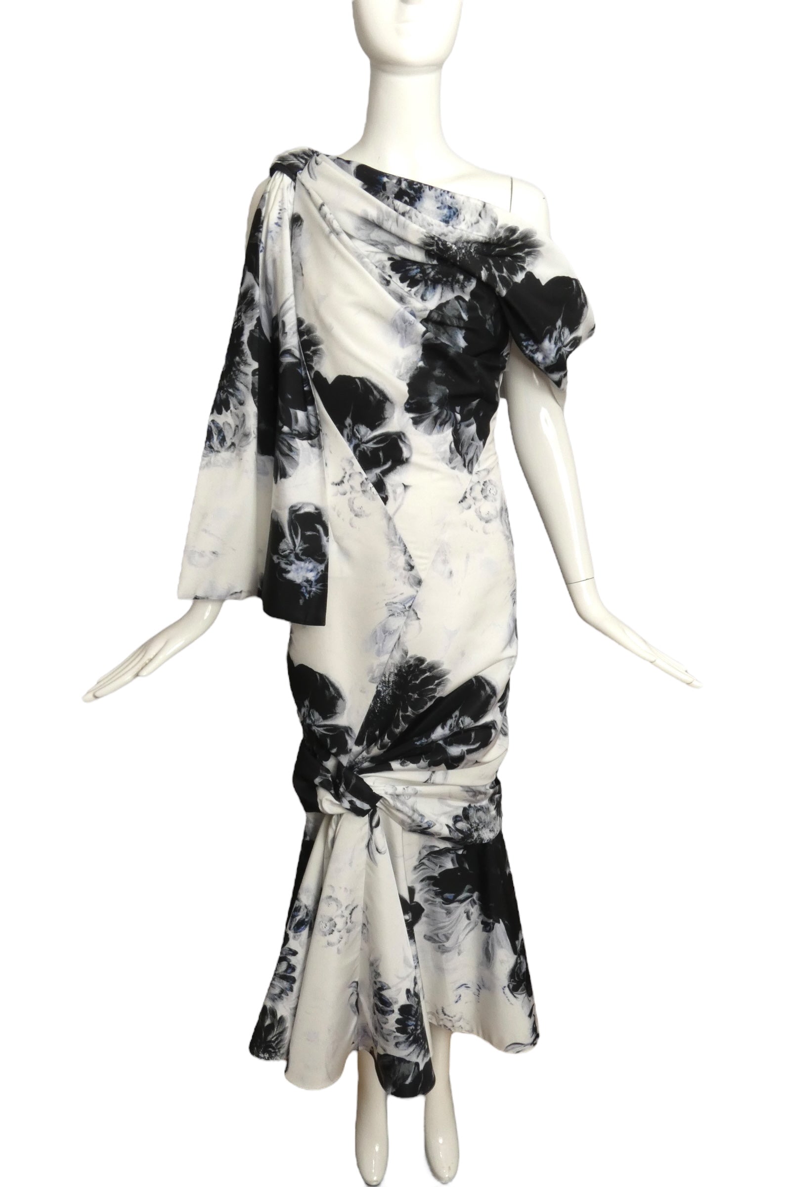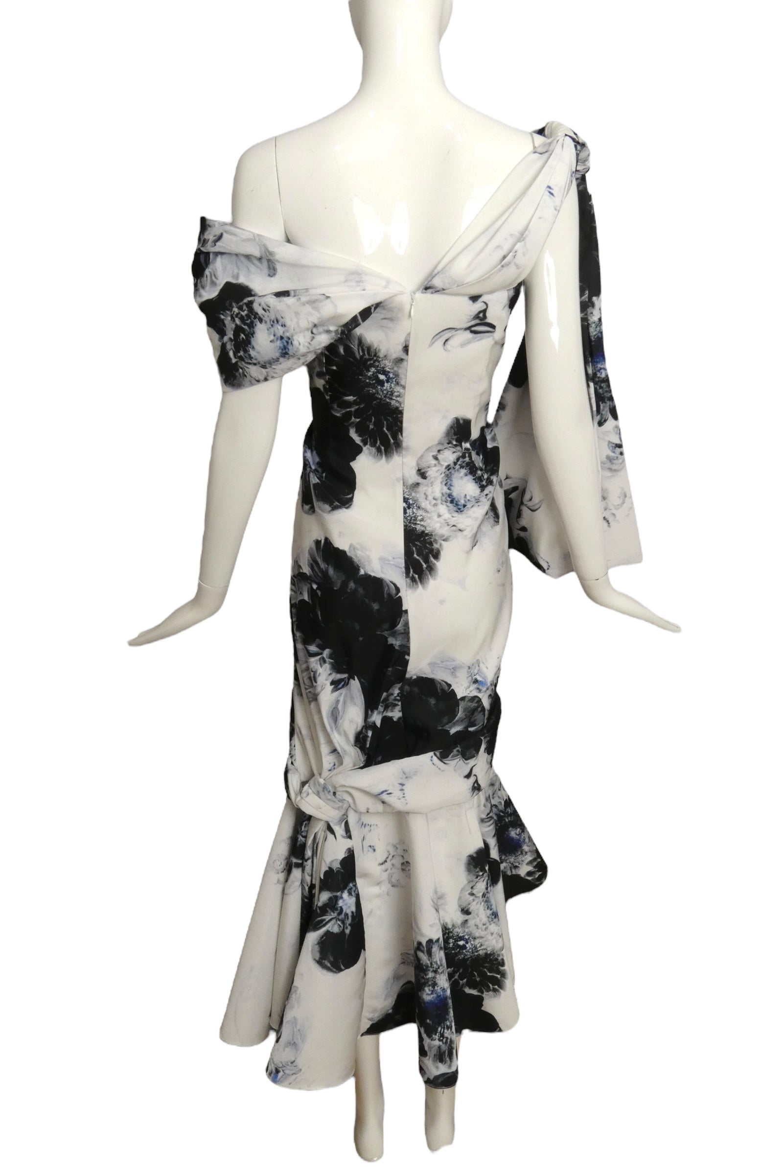 Description: Step up your evening style with this eye-catching Alexander McQueen dress from the Pre Spring 2024 collection. Made from luxurious silk faille, it showcases a stunning black and white chiaroscuro floral print that feels like wearable art. Playful draped panels flatter your figure, while a bold oversized knot on the right shoulder spills gracefully down the side, adding a fun and dramatic twist. Ready to turn heads at any event, this dress is a fabulous pick for the fashion lover who loves to make a statement!