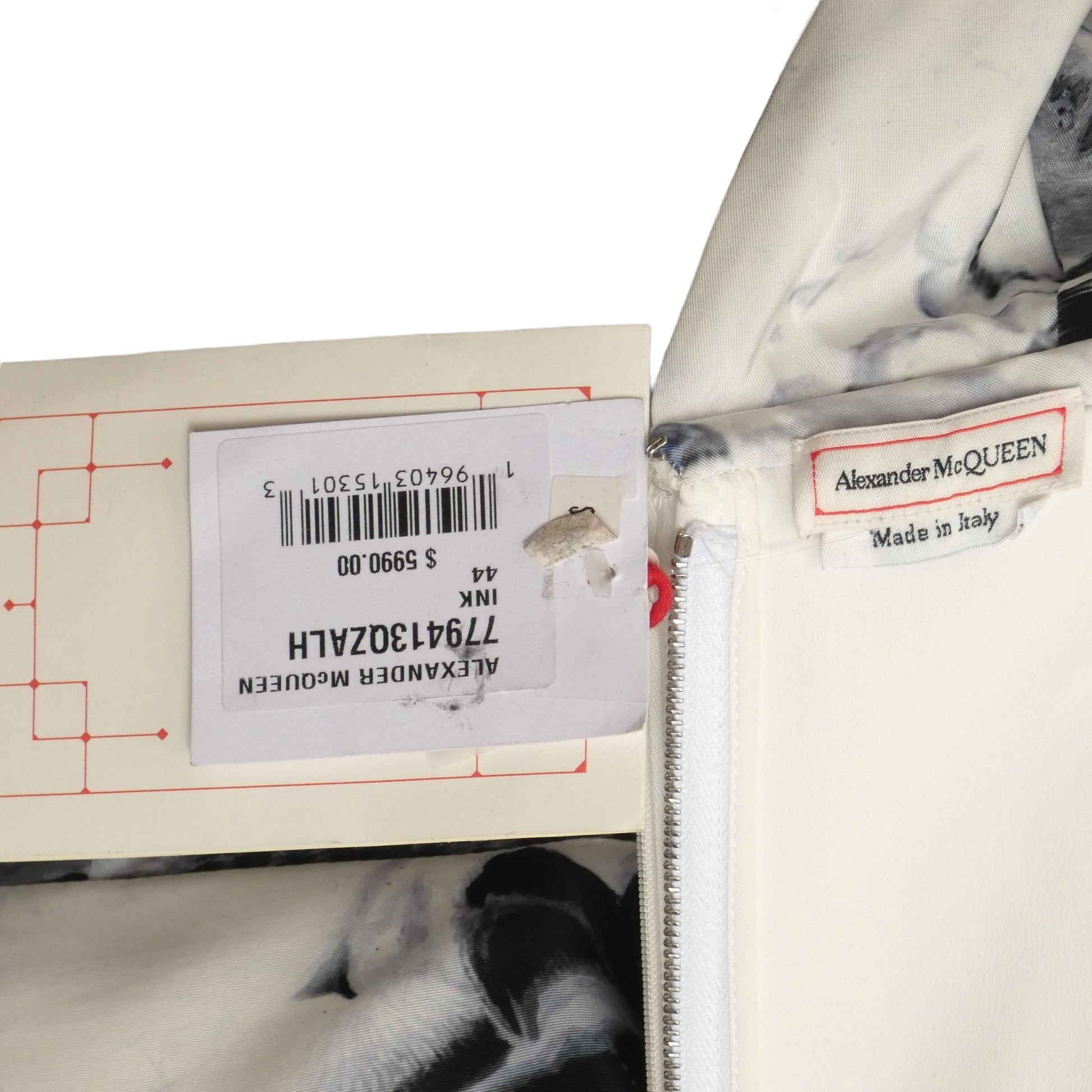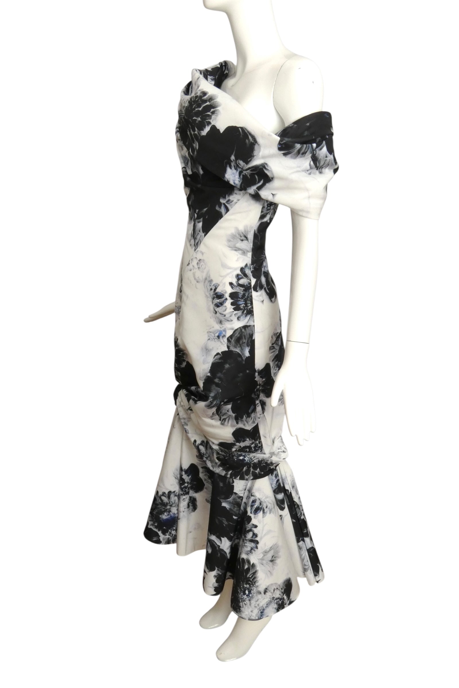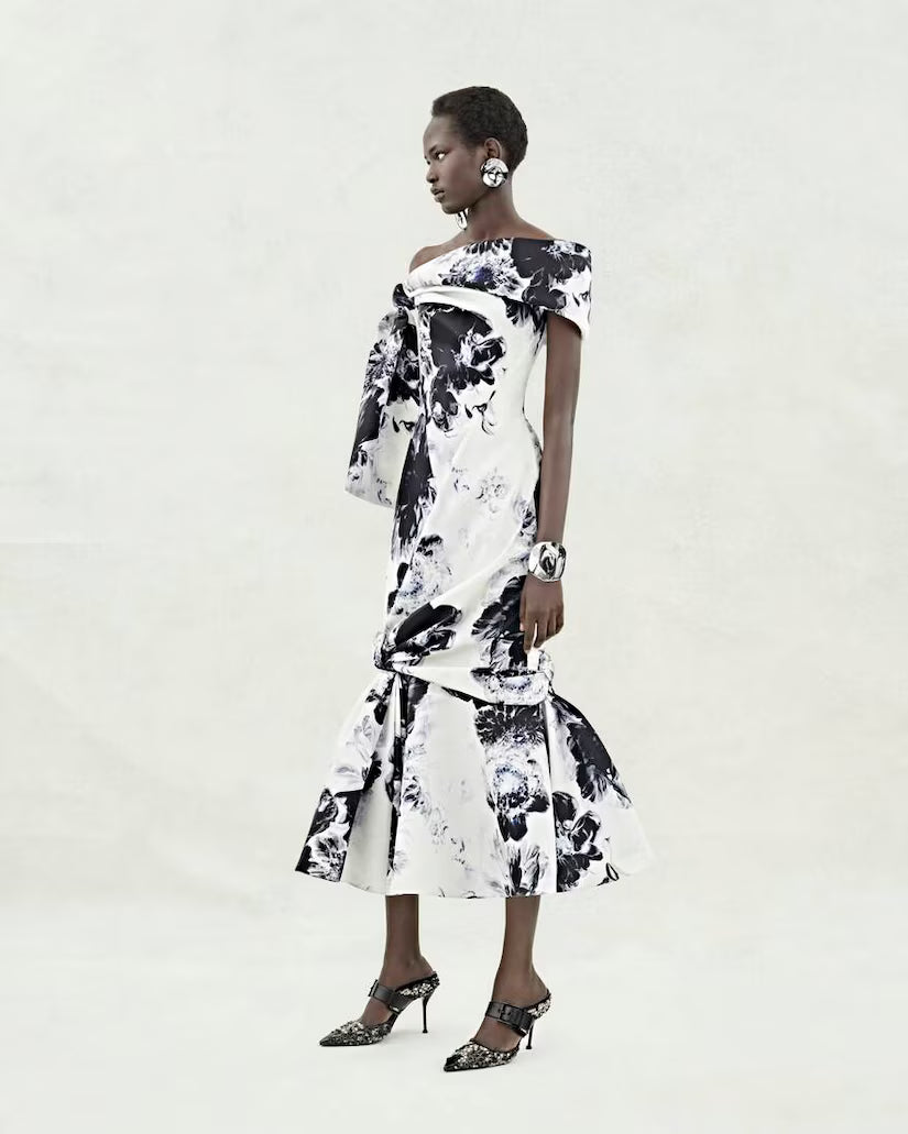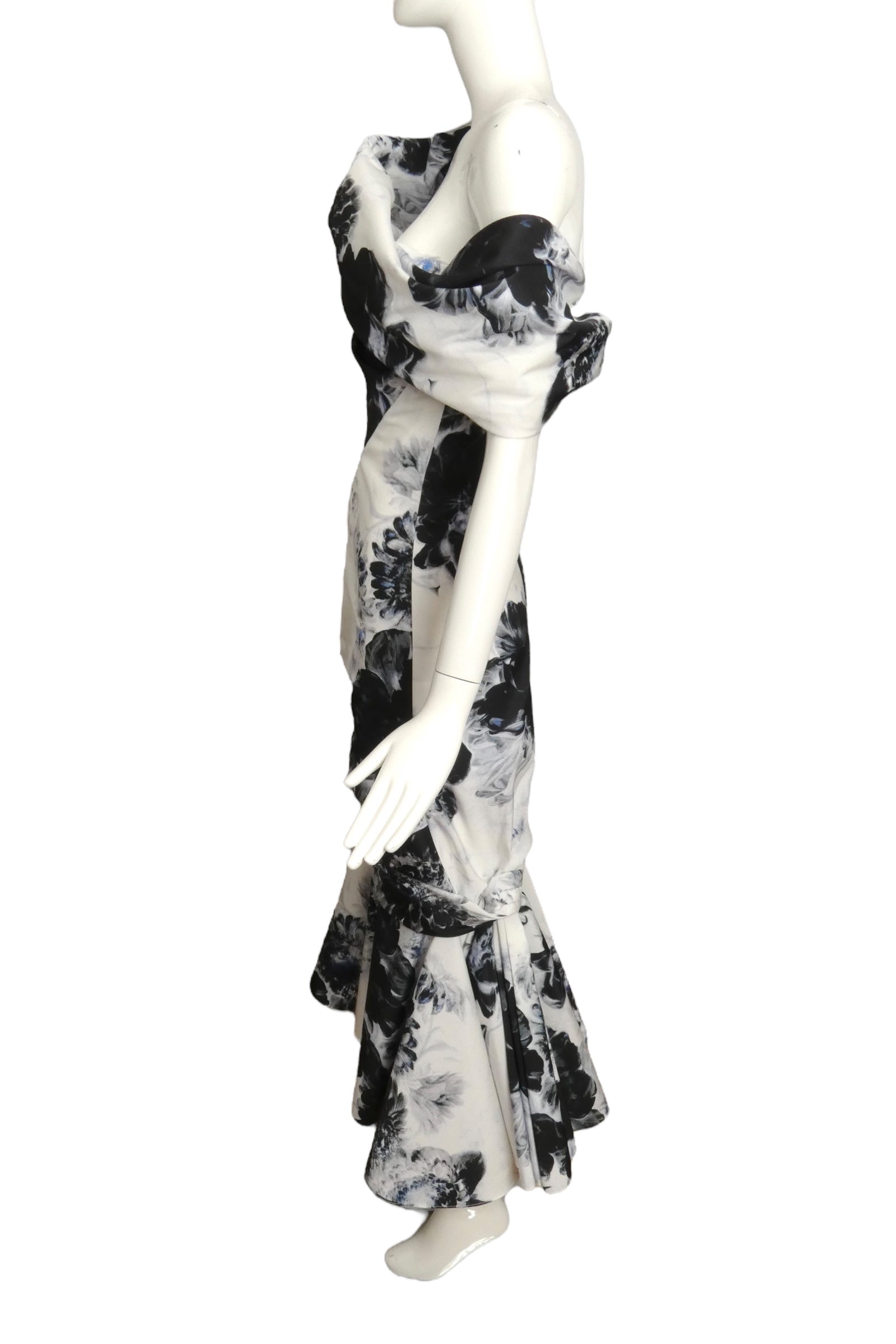 Description: Step up your evening style with this eye-catching Alexander McQueen dress from the Pre Spring 2024 collection. Made from luxurious silk faille, it showcases a stunning black and white chiaroscuro floral print that feels like wearable art. Playful draped panels flatter your figure, while a bold oversized knot on the right shoulder spills gracefully down the side, adding a fun and dramatic twist. Ready to turn heads at any event, this dress is a fabulous pick for the fashion lover who loves to make a statement!