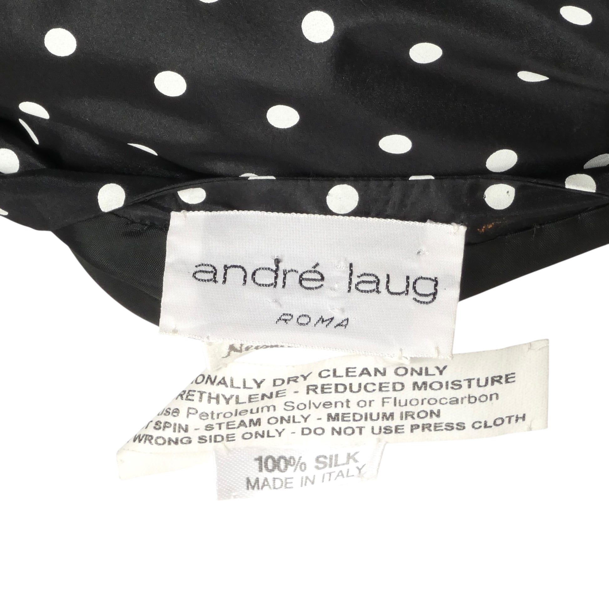 Description: Elevate your style with this playful 1980s Andre Laug black taffeta blouse, dotted with charming white polka dots. The chic chest yoke and delicate button-and-loop closures add vintage elegance, while the matching waist sash lets you create a flattering silhouette. Perfect for turning heads at casual gatherings or dressy events, this size 16 blouse brings timeless fun and flair to your wardrobe.