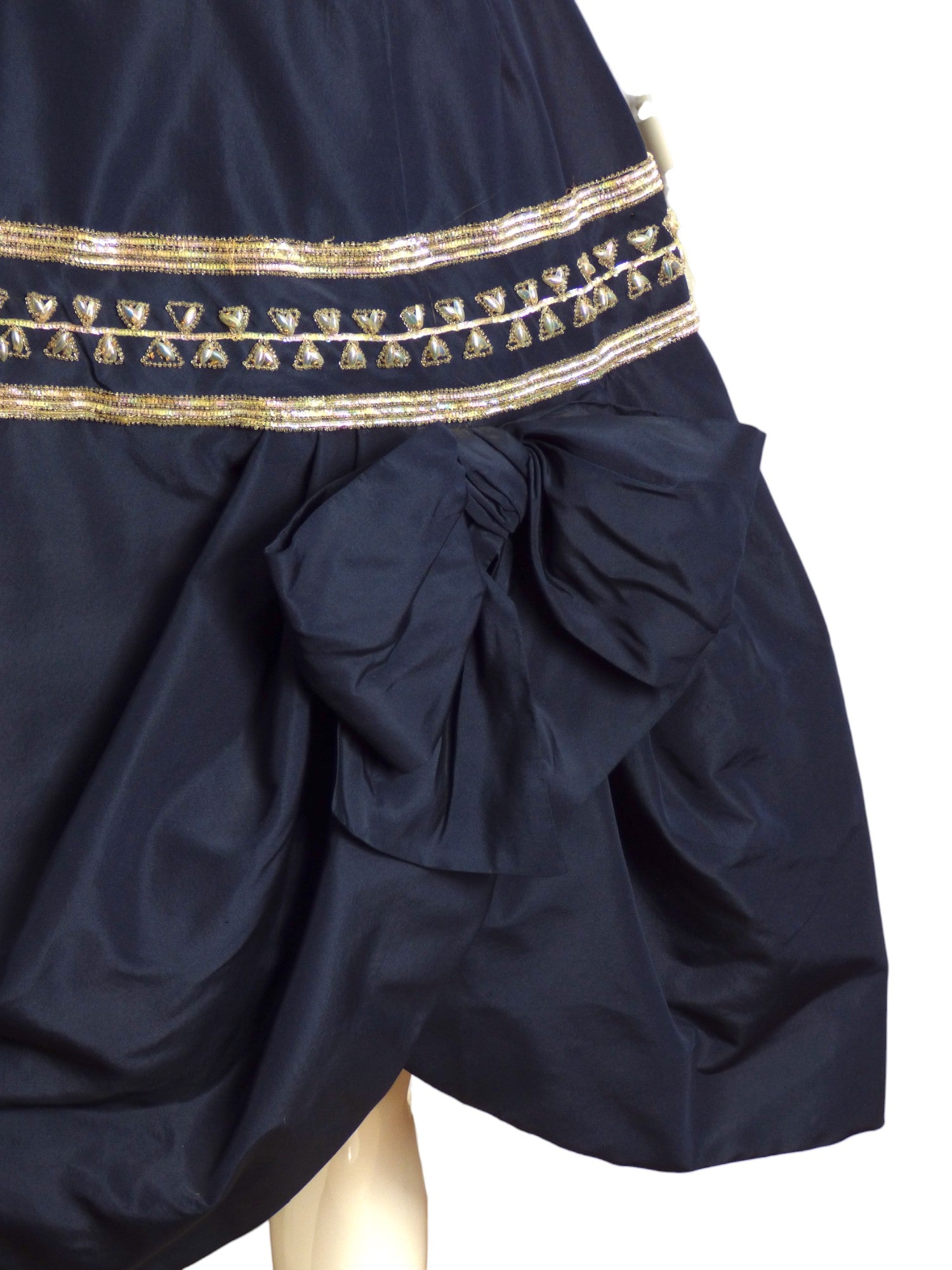 Description: Elevate your wardrobe with rare Antonelli dress. This stunning couture dress features a navy taffeta fabric adorned with shimmering aurora borealis sequins and palettes, reminiscent of the sparkling night sky. The dart fitted bodice beautifully accentuates the bust, while pleats add a touch of elegance from shoulder to waist. The gored skirt flares out into a dramatic bell shape, adorned with stripes of sparkling sequins that catch the eye. Complete with a giant bow on the front, this dress will make you feel like a true work of art.