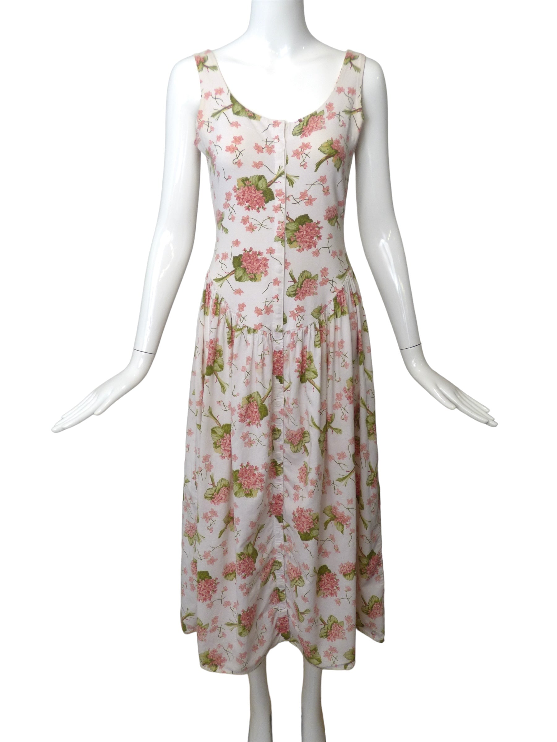 Description: Step into the 1980s fashion with our fabulous white dress, embellished with charming pink flower bouquets. This cotton knit bodice showcases a scoop neckline, wide shoulder straps, and hidden snap closures down the front. Its scooped, dropped waistline and gathered cotton skirt add a touch of elegance to your ensemble.