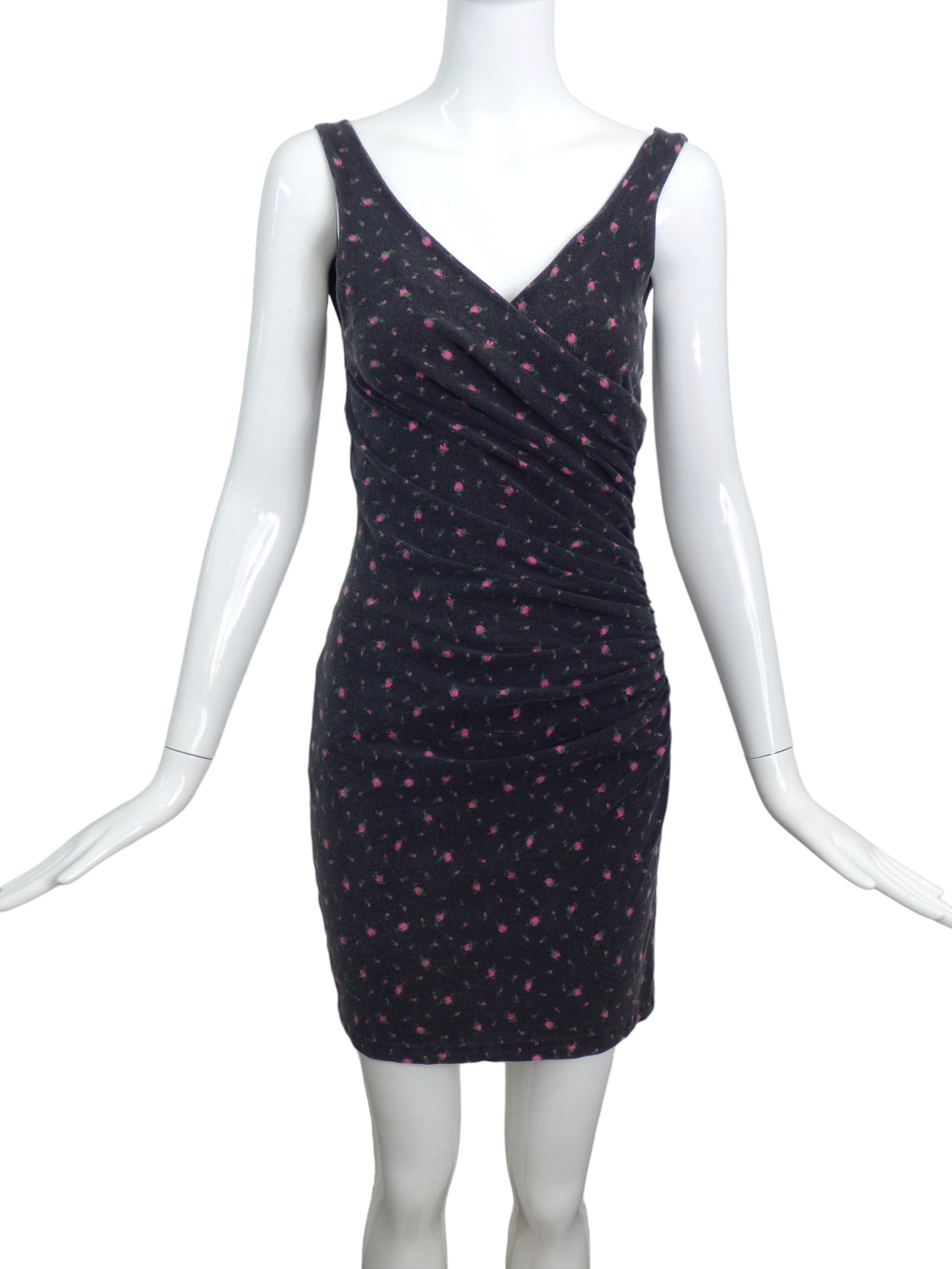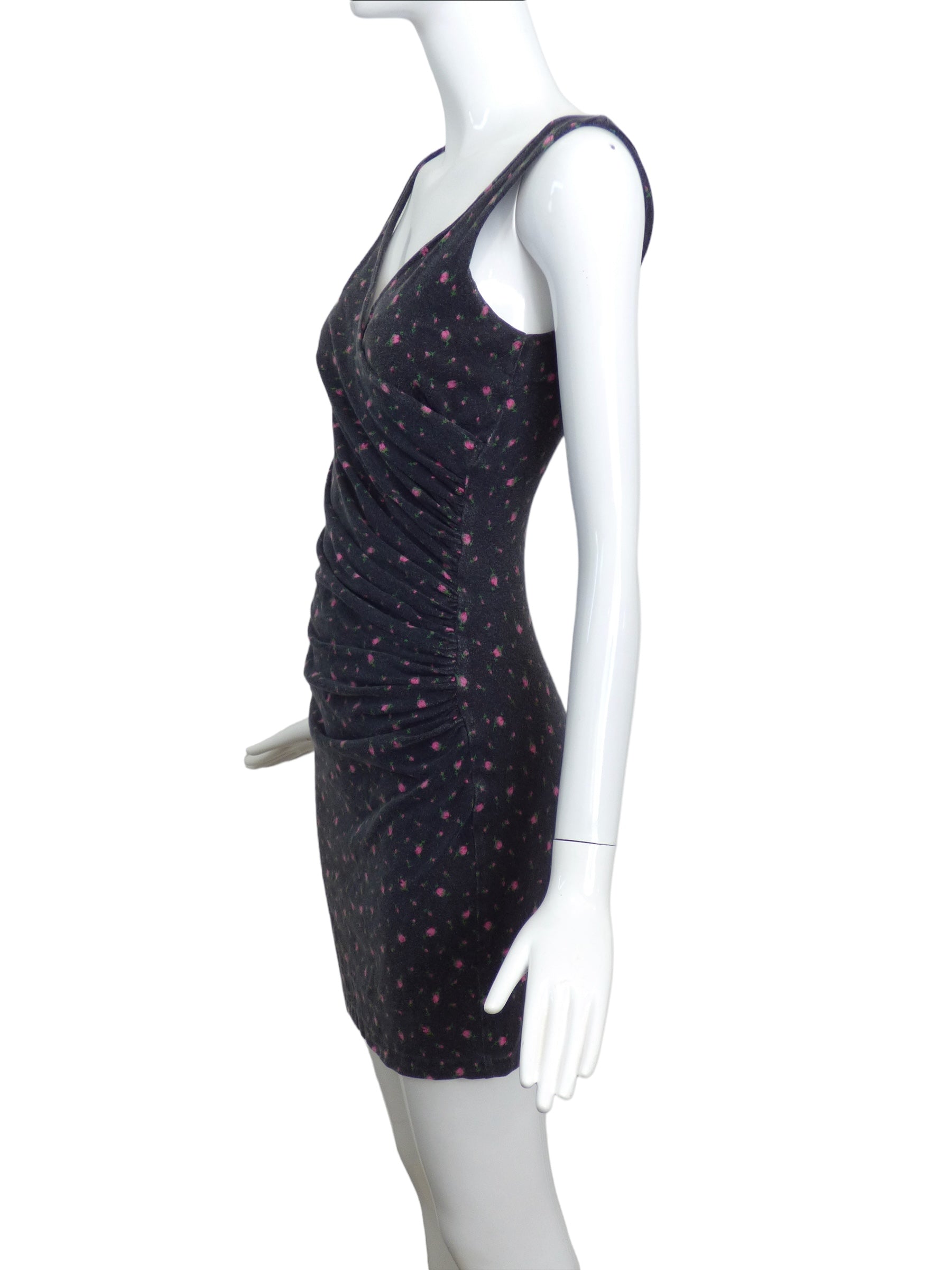 Description: Introducing this charming black knit wiggle dress, designed to add fun to your wardrobe. This dress features a delightful small pink floral pattern for a feminine touch. With a wrap style front and shirring detail down the left side, it offers a flattering and stylish fit. Made from high-quality knit fabric, it ensures comfort and durability. Perfect for any occasion, this versatile wiggle dress is a must-have.