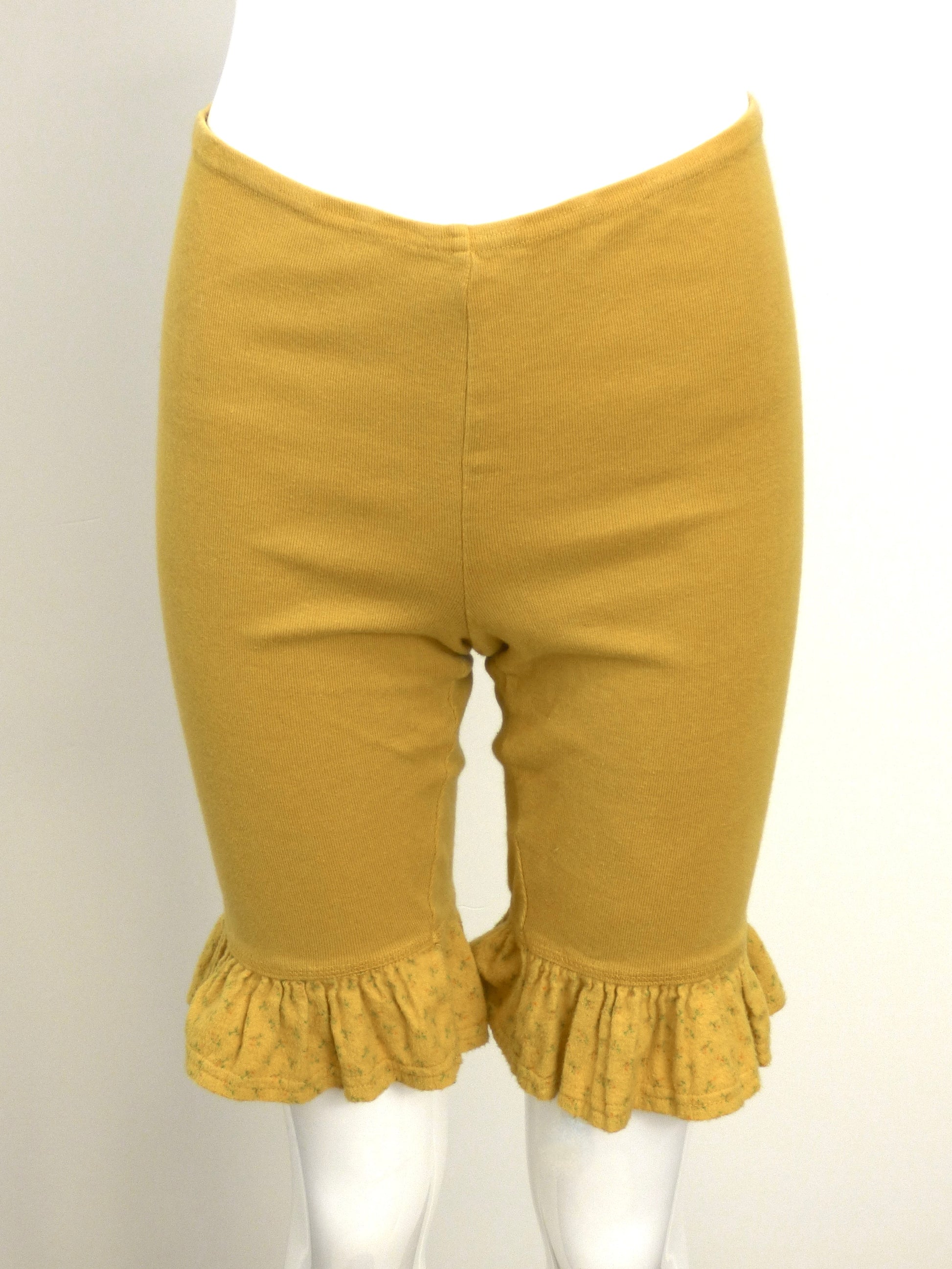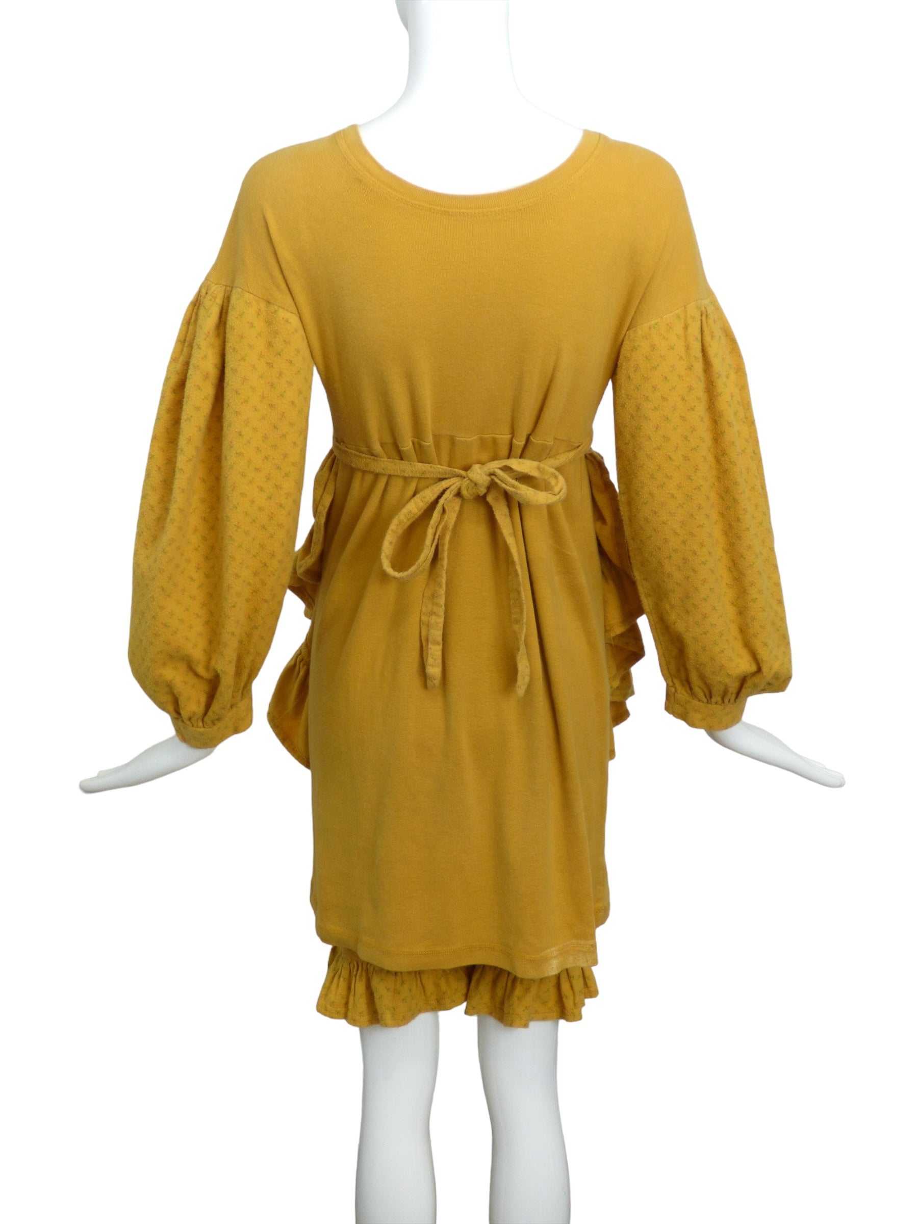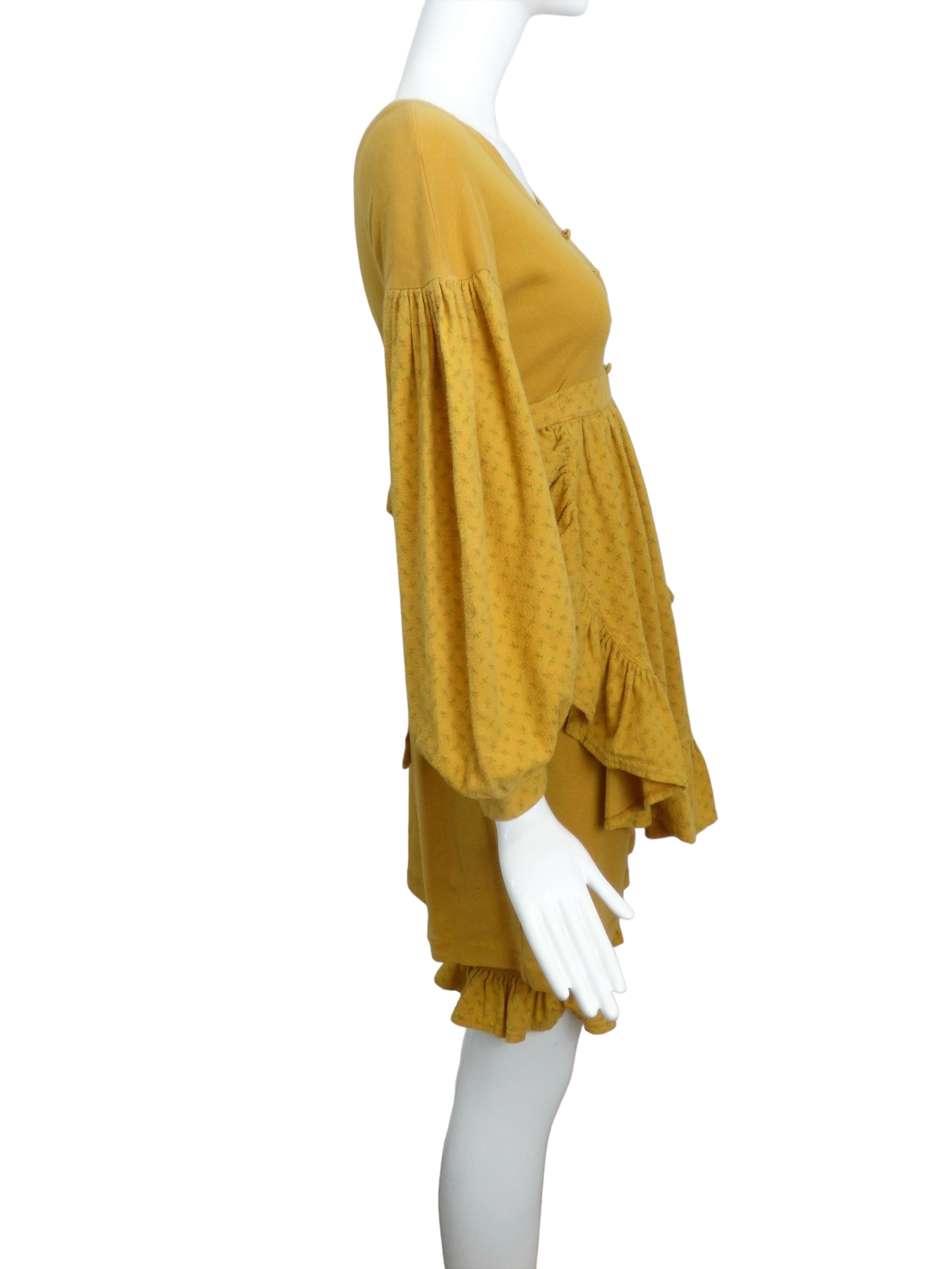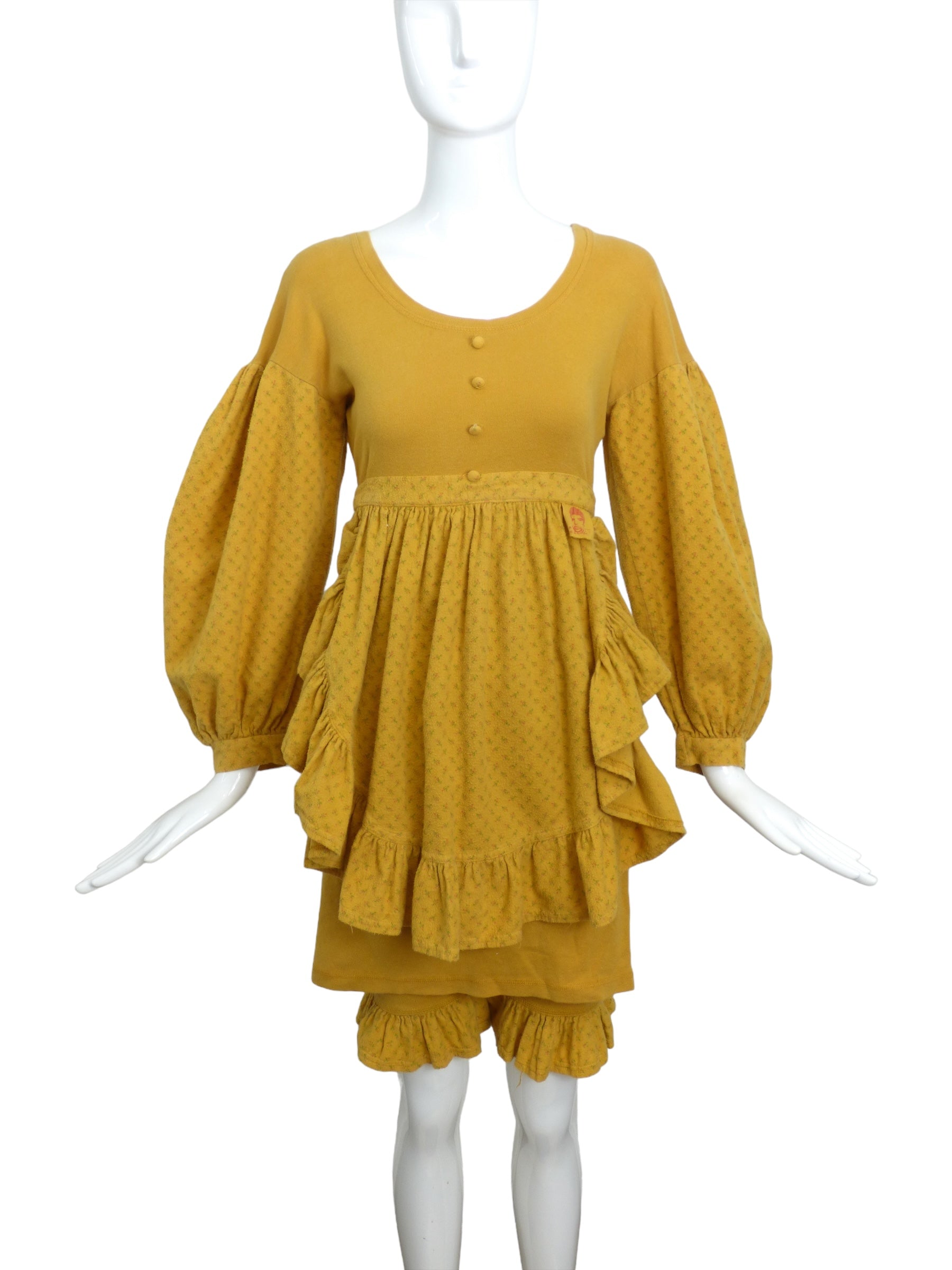 Description: Introducing an adorable early 1980s ensemble, this knit mini dress and matching bloomers exude a hint of prairie style. The dress features a scoop neckline adorned with decorative buttons, while the front is trimmed in a floral chintz flannel. Adding a charming touch, an attached chintz apron with sashes ties at the back and is finished with a gathered ruffle. The long sleeves, made of flannel, end in gathers at the narrow wristbands. Completing the ensemble, the matching bloomers are knit and adorned with flannel ruffles along the bottom.