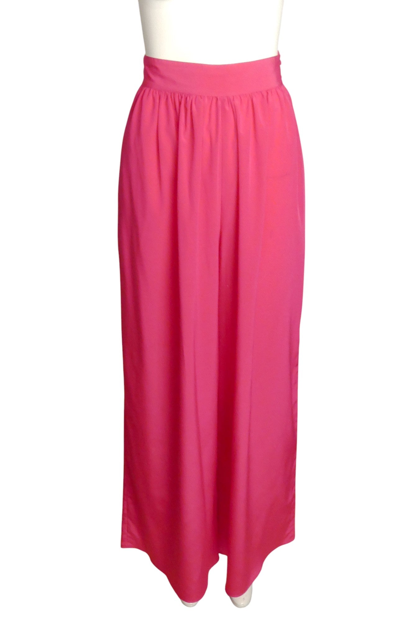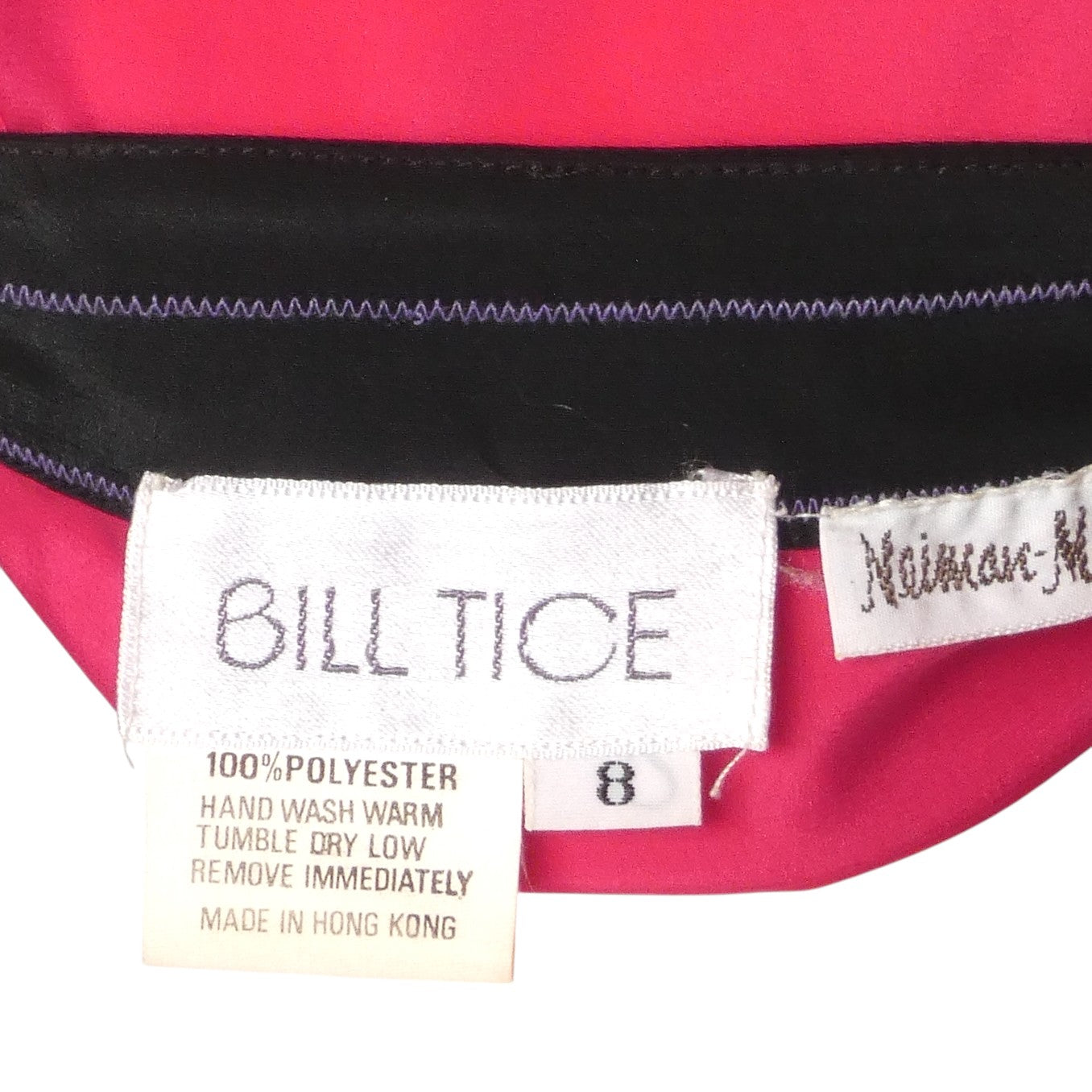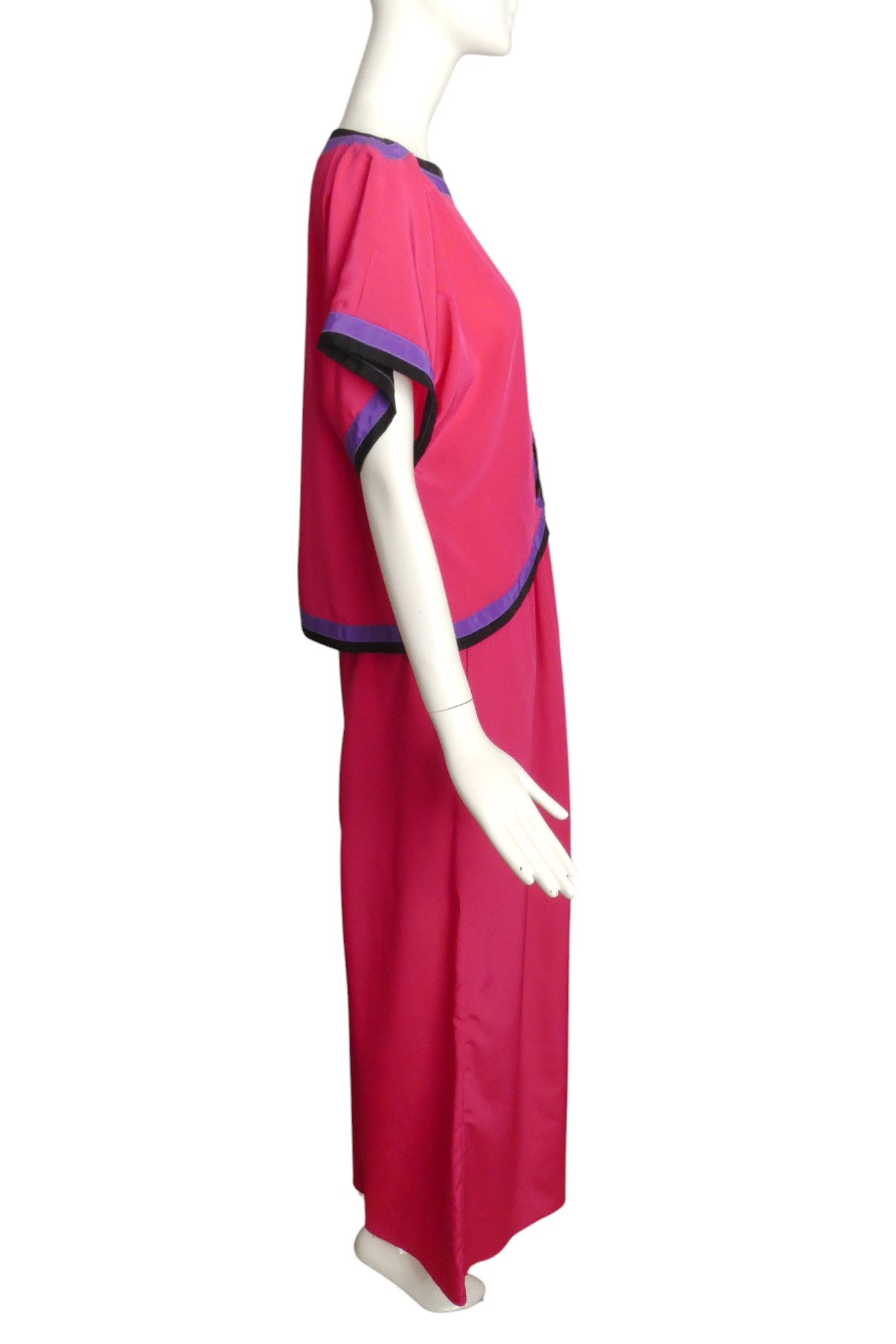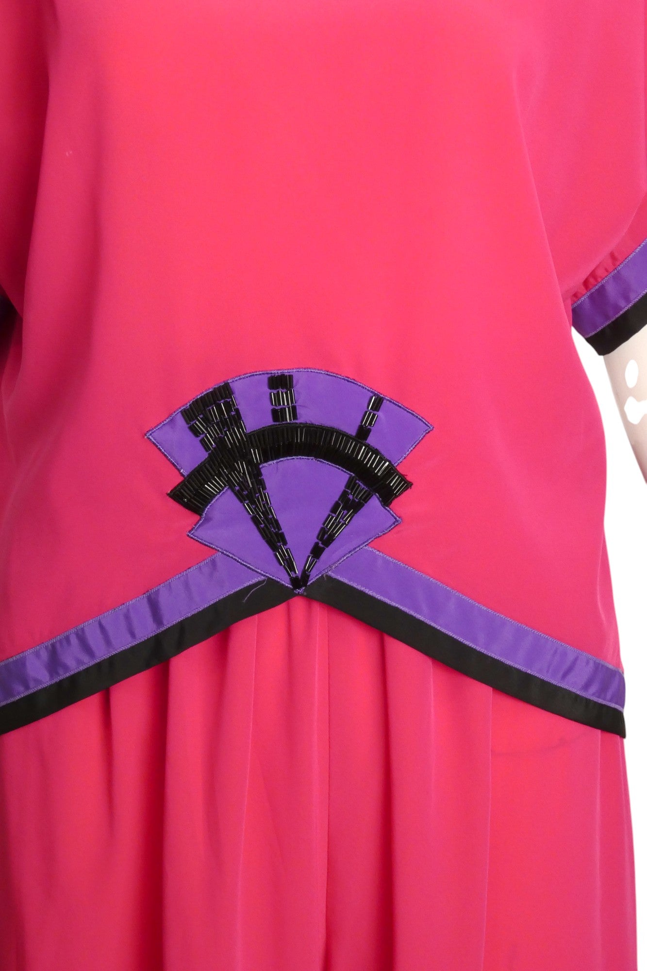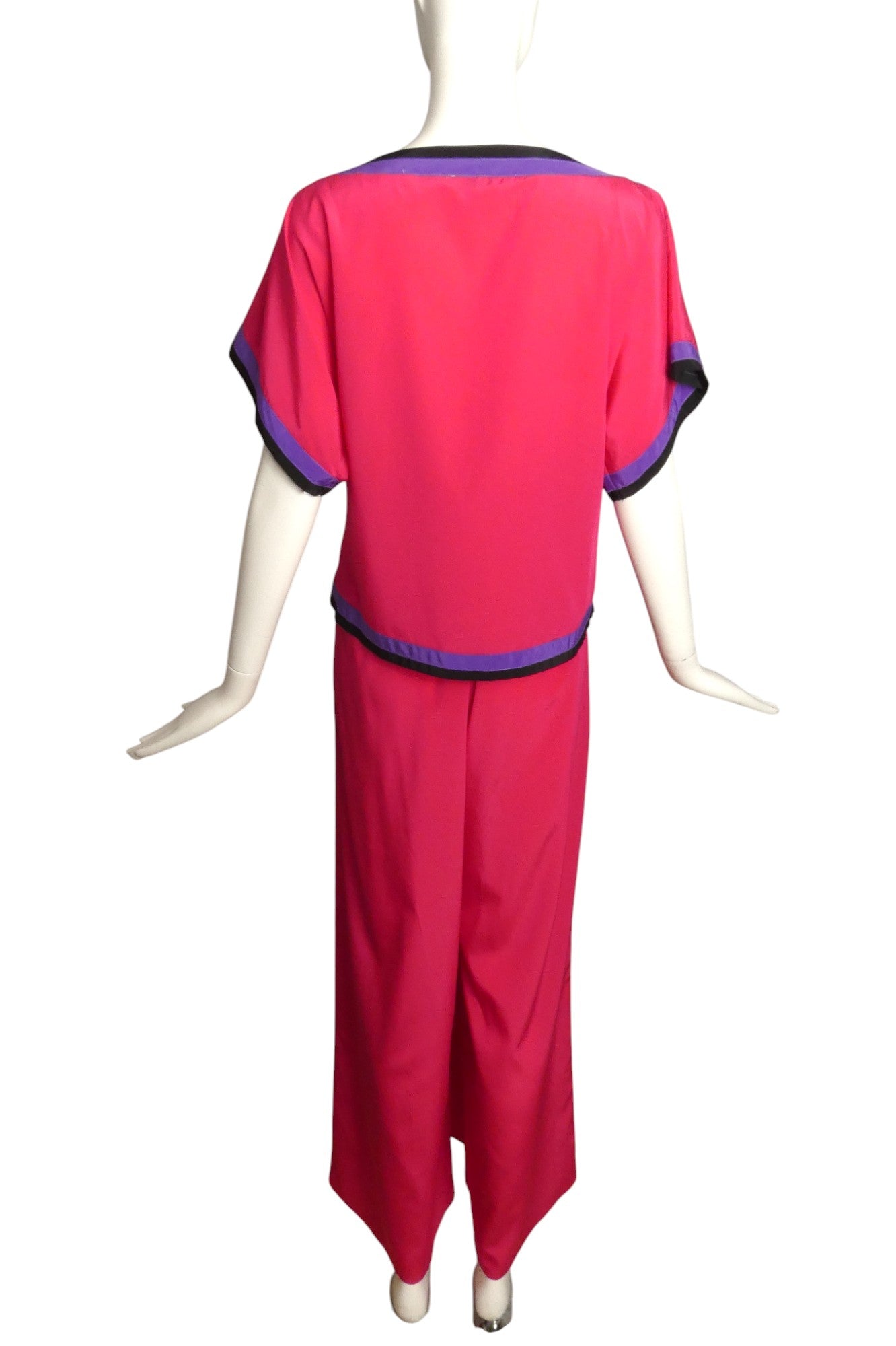 Description: Command attention as the ultimate hostess in this striking 1990s Bill Tice ensemble. The show-stopping hot pink creation features sophisticated purple and black accents that exude confidence and style. The elegant blouse showcases a flattering bateau neckline, dramatically enhanced with exquisite black beadwork that highlights the center front purple design. Perfectly coordinated palazzo pants cascade gracefully from the wide, comfortable waistband in sumptuous gathers. This rare vintage set combines bold color with impeccable craftsmanship for an unforgettable silhouette that guarantees you'll be the most memorable presence at your next gathering.