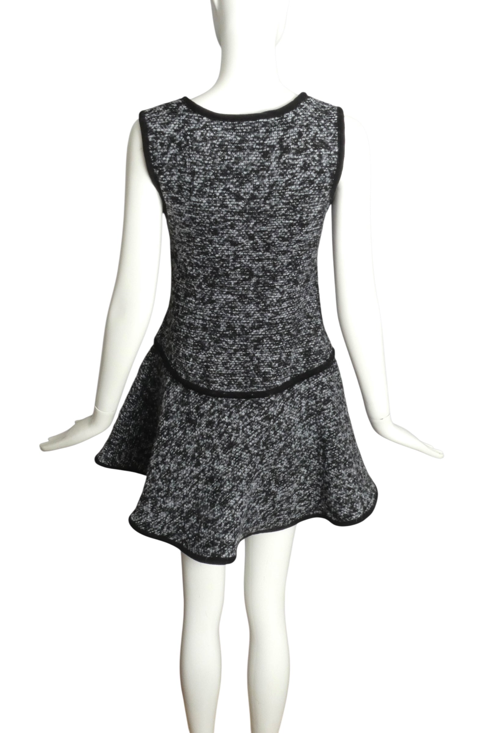 Description: This playful little black and grey boucle dress features chic black velour piping for a touch of luxe. Dart-fitted through the body with a dropped waist, it flares out in a flirty bias flounce at the hem. Brand new with tags, it’s ready to bring a fun, stylish vibe to your wardrobe. Perfect for making a charming statement wherever you go!
