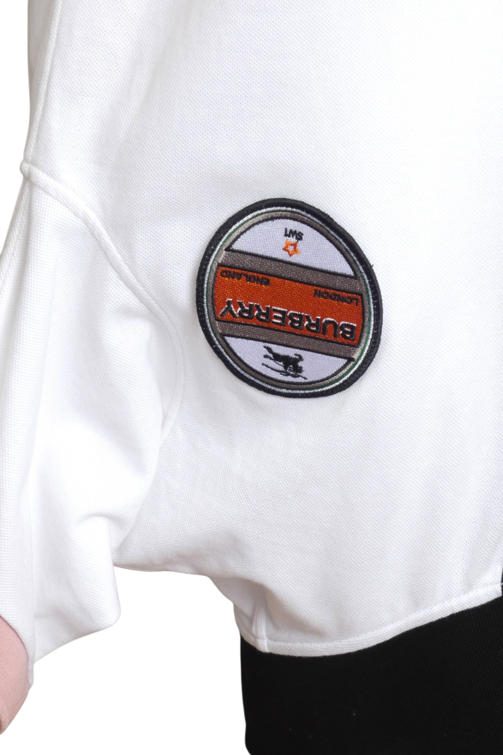 Burberry's reconstructed polo shirt dress exemplifies contemporary reinterpretation of classic sportswear. Crafted from striped cotton and manufactured in Italy, this piece features a refined polo collar, front button placket adorned with mother-of-pearl buttons, and mid-length sleeves. The appliqued logo graphics draw inspiration from 1990s British heritage, creating a distinctive aesthetic that bridges vintage sensibility with modern design. The structured silhouette and quality construction make this a versatile addition to a curated wardrobe, suitable for both casual and elevated occasions.