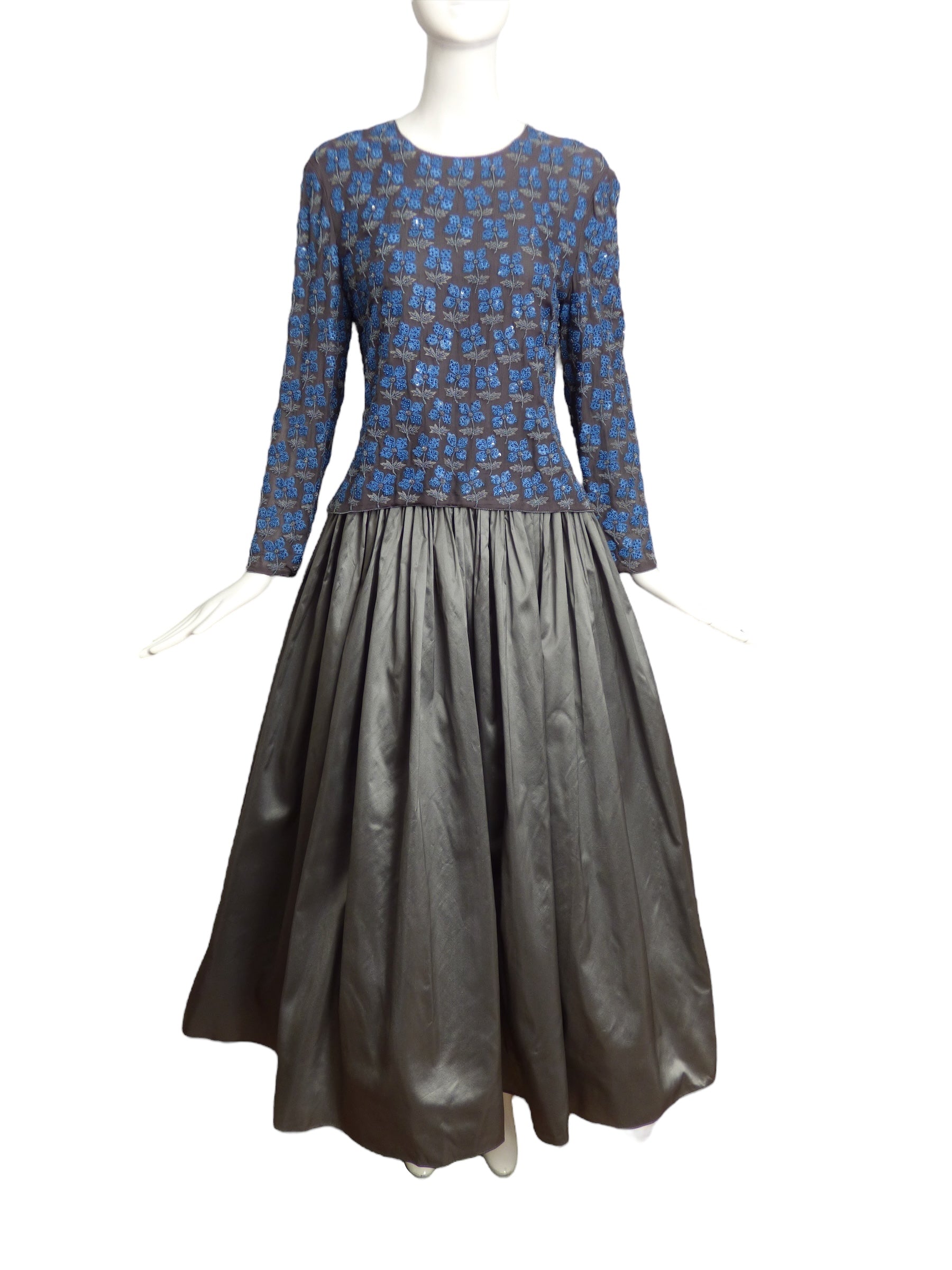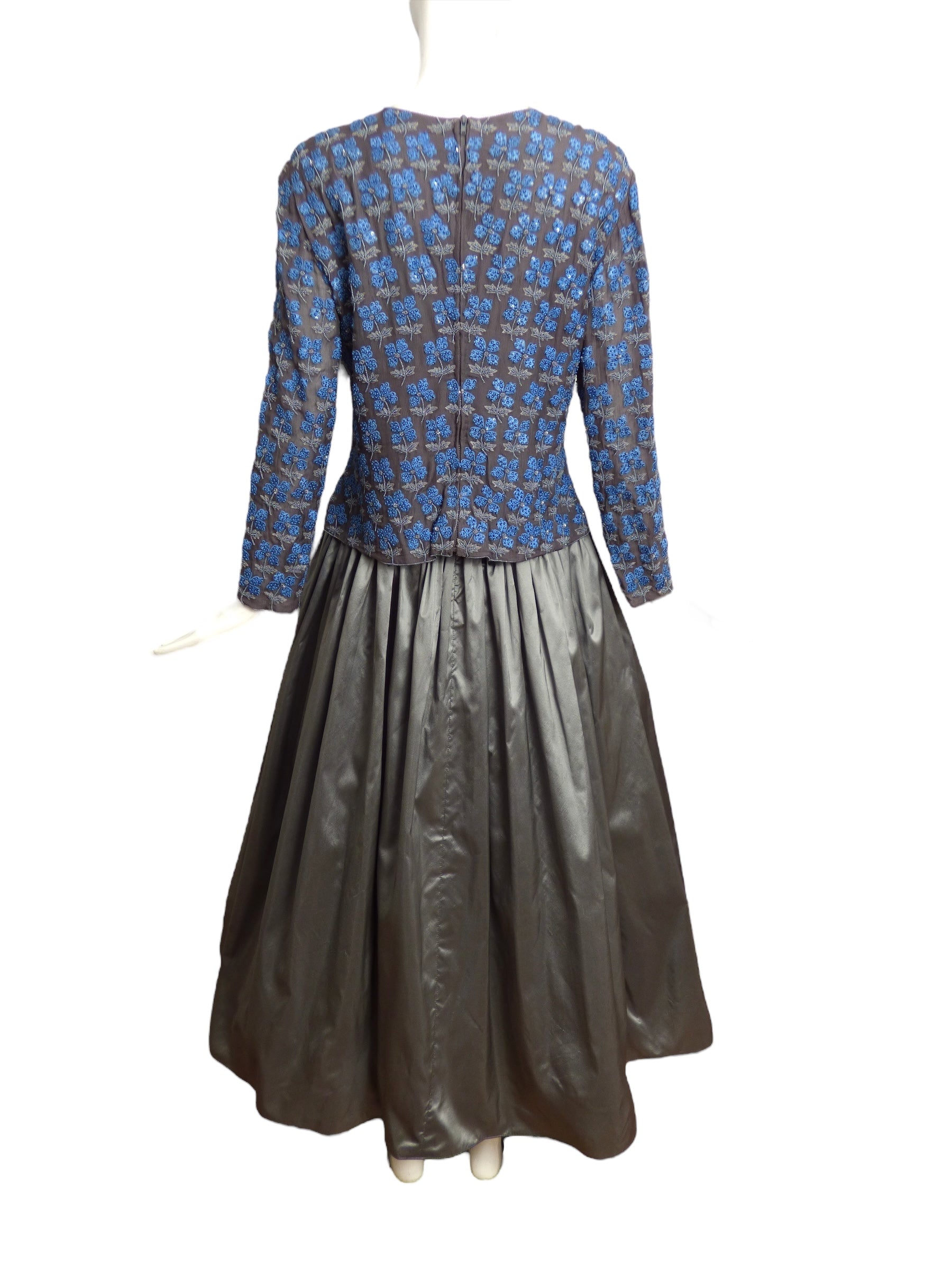 Description: Indulge in the decadence of the 1980s with this exquisite evening ensemble, featuring a chiffon blouse adorned with intricate blue beaded flowers and delicate silver stems and leaves. The luxurious blouse is lined with silk chiffon and secured with a discreet center back zipper. The opulent gunmetal silk taffeta ball gown skirt cascades in soft gathers from a refined piped waistline, exuding elegance and sophistication.