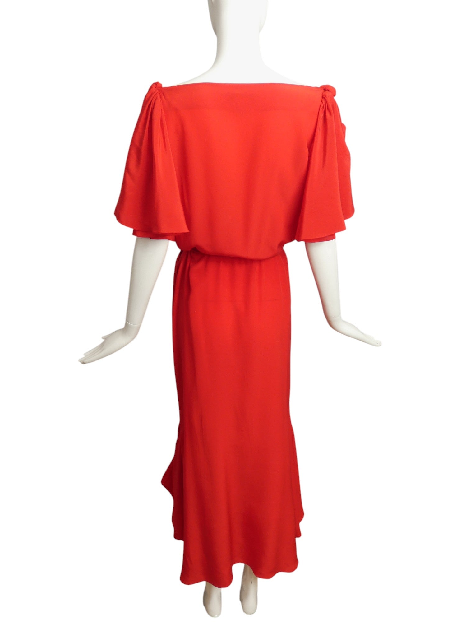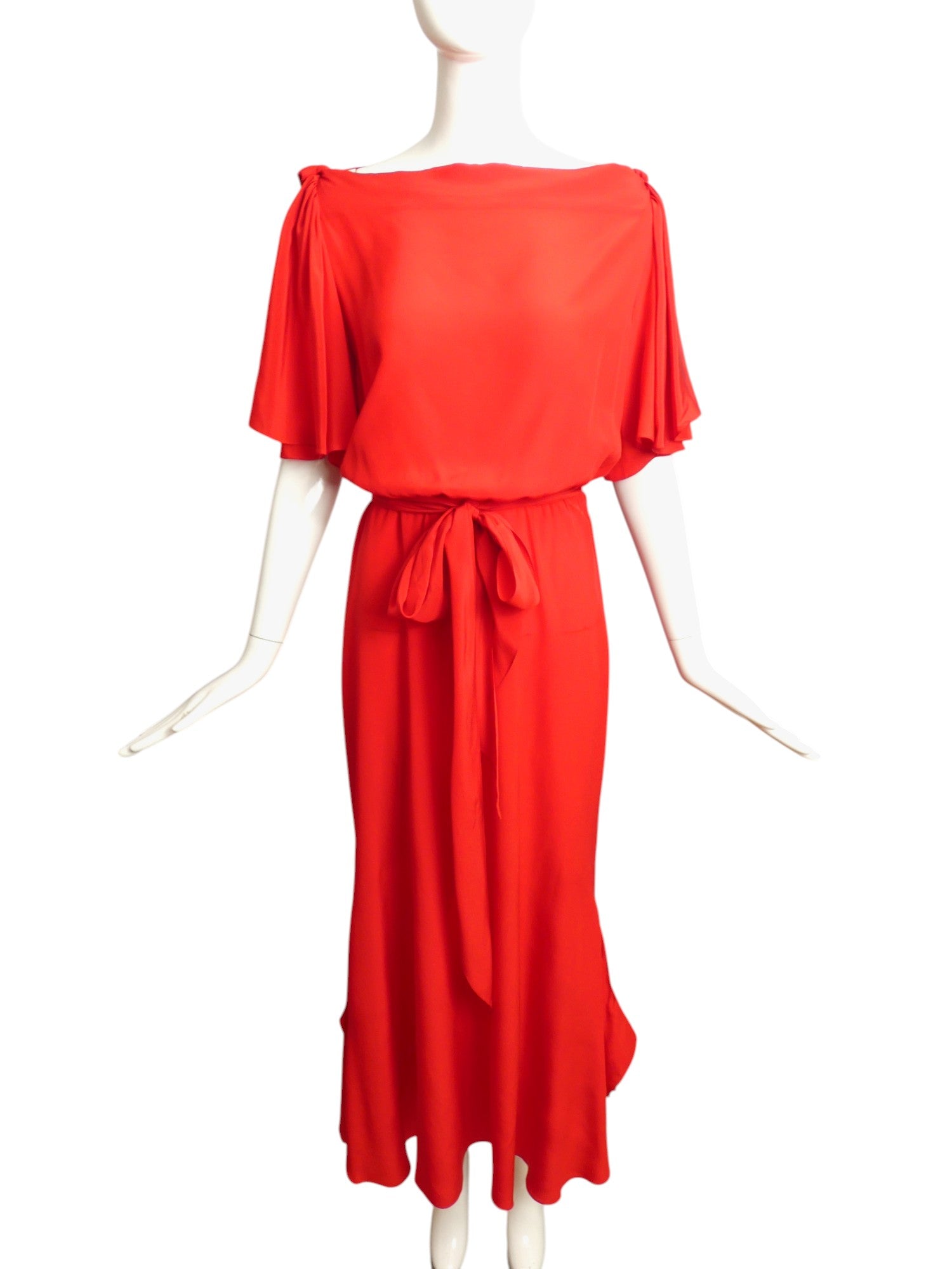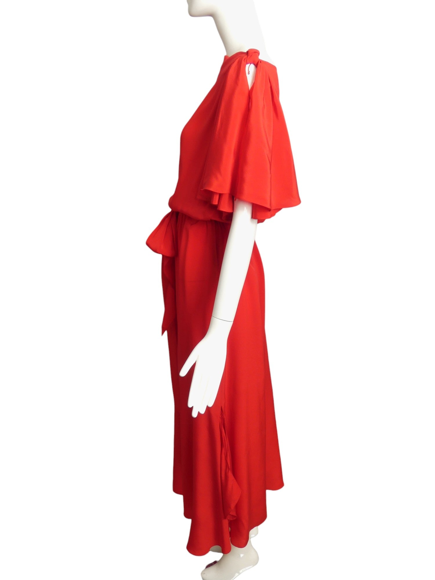 Description: Become enamored with this stunning red silk evening gown. Featuring a draped neckline and bias ruffle sleeves adorned with silk knots, this dress also boasts a natural waistline seam and matching sash that ties into a delicate bow. Handkerchief panels edge slits on the side seams of the lower skirt, adding a touch of elegance to this timeless piece.