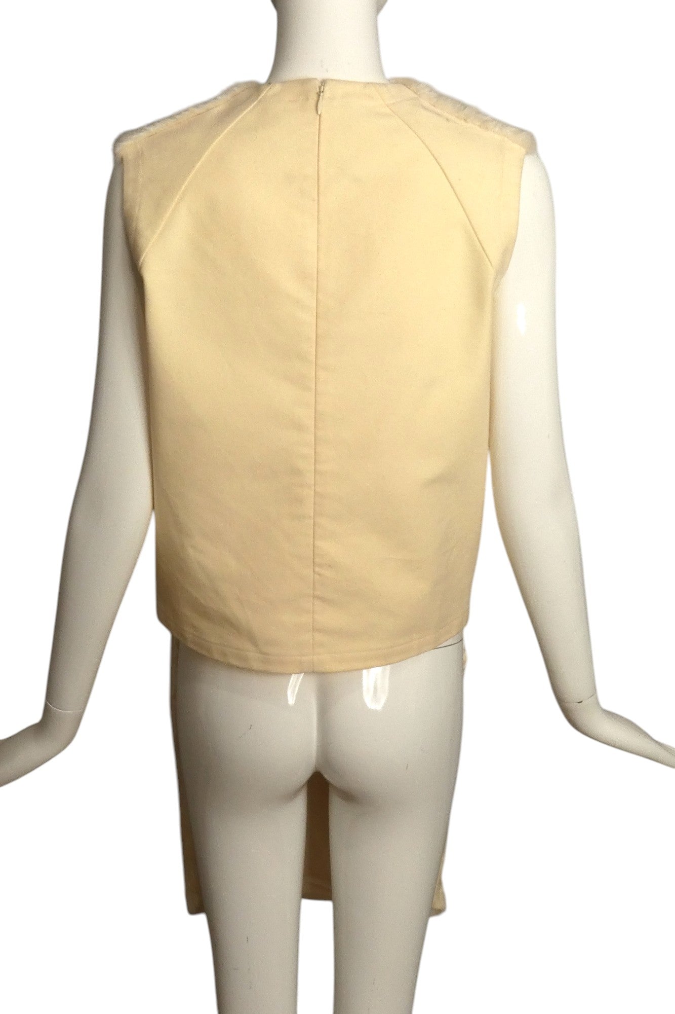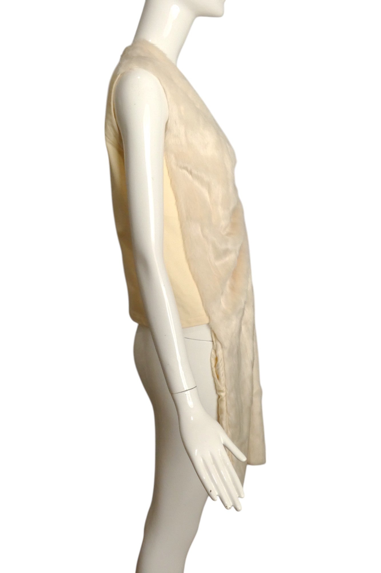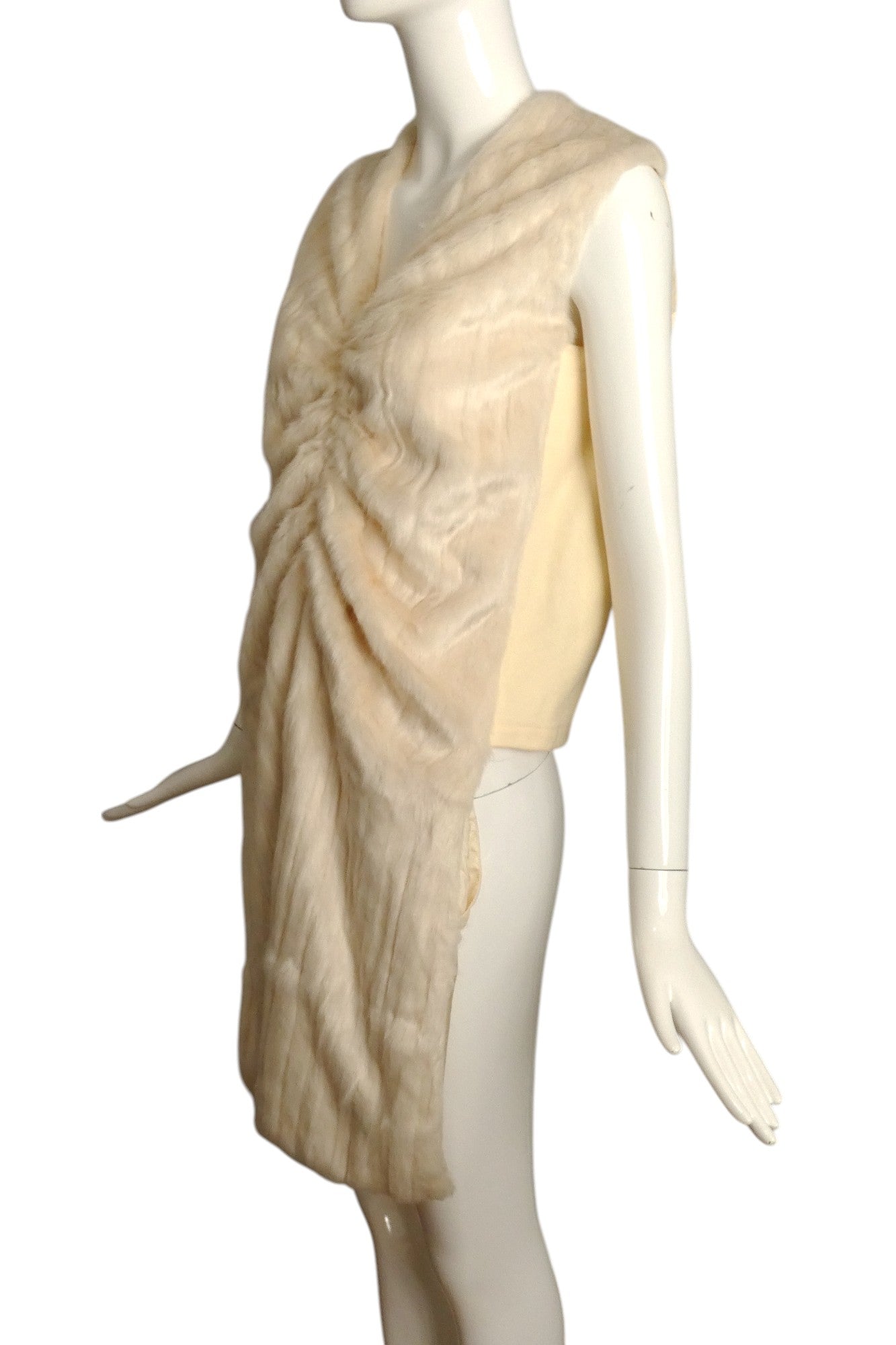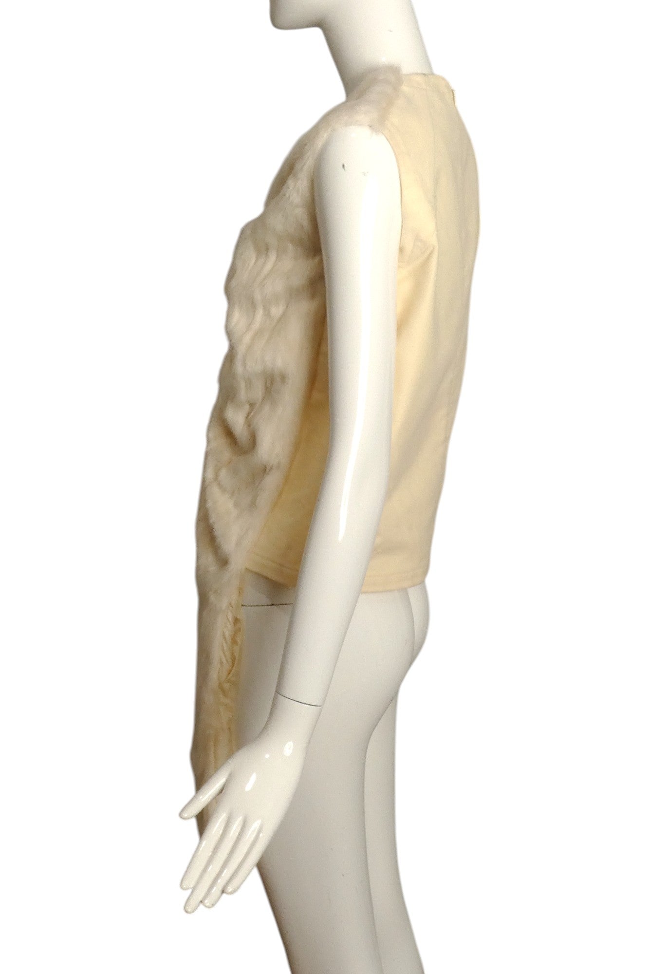 Description: This exquisite tunic is a unique creation from Celine, procured from sample and prototype collections. Experience the luxurious comfort of our faux ermine fur tunic, featuring a plunging neckline and shirred front panel. The back boasts an ivory sueded cotton with a zipper closure for added convenience. The longer front design and front inset pockets add both style and functionality