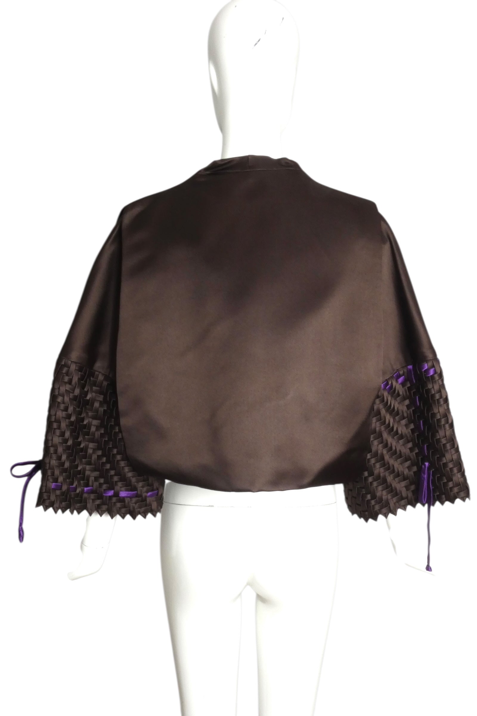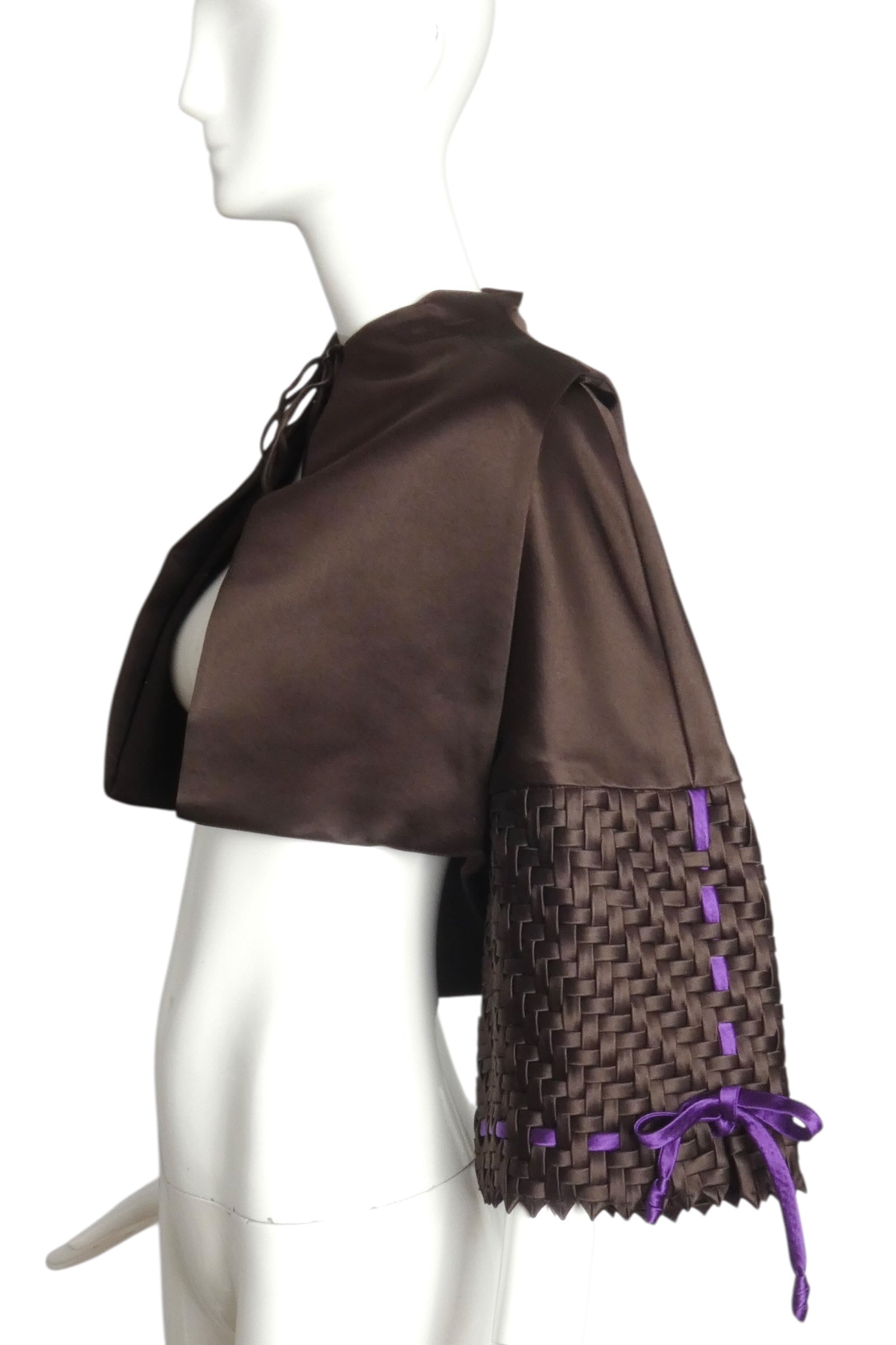 Description: This exquisite evening jacket showcases masterful tailoring in rich brown silk satin. The bolero silhouette features distinctive looped front panels with a delicate string tie closure, while the back displays a dramatic double panel design. Three-quarter sleeves cut as one with the body are lavishly embellished with intricate basketweave detailing in coordinating satin, accented by asymmetrical purple satin ribbons that knot gracefully at the cuffs. Each sleeve presents its own ribbon arrangement, creating sophisticated visual interest. A refined statement piece for the discerning collector of vintage evening wear.